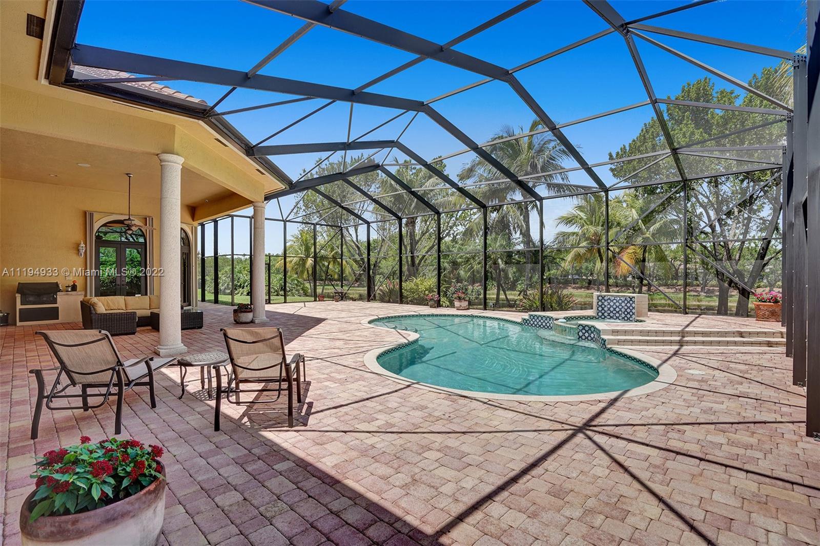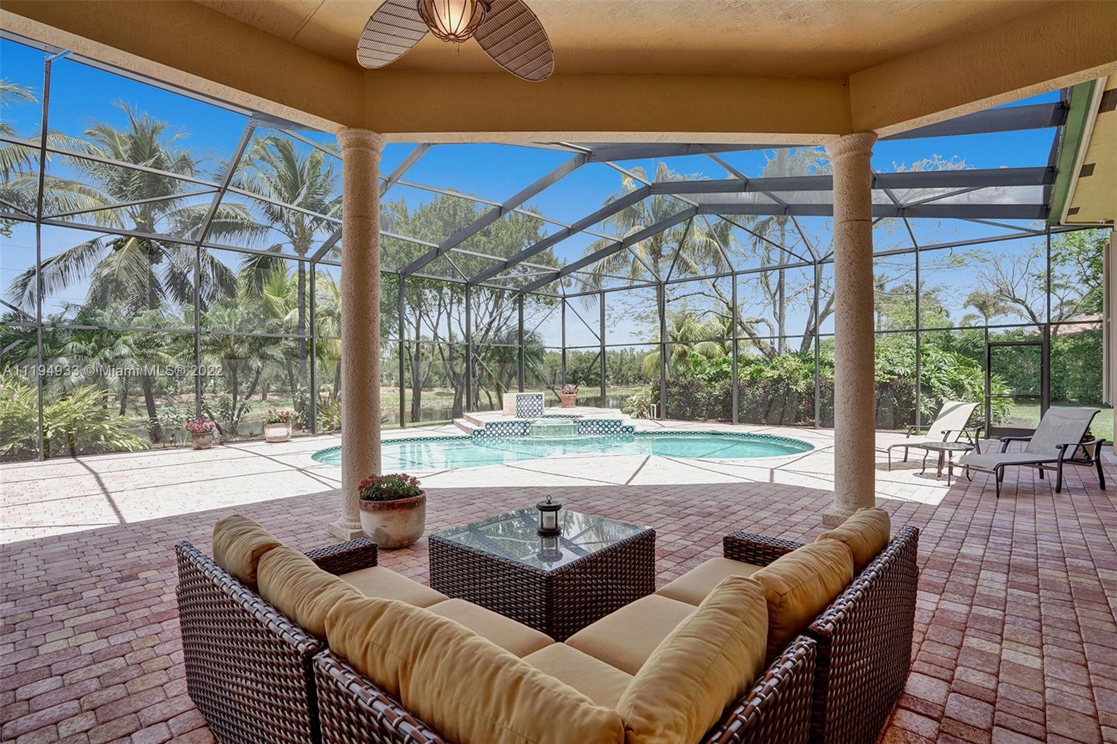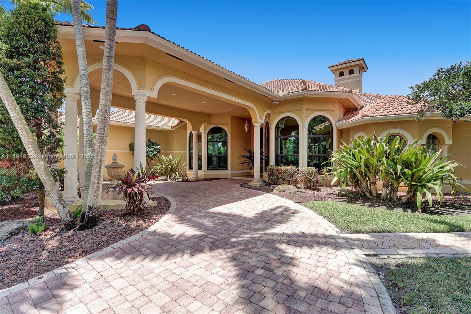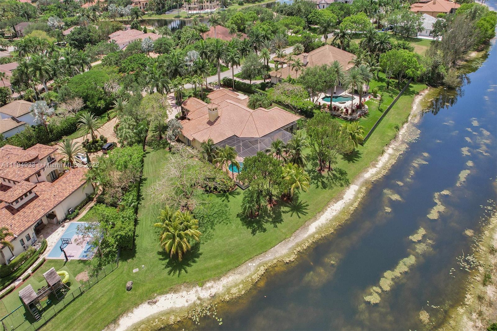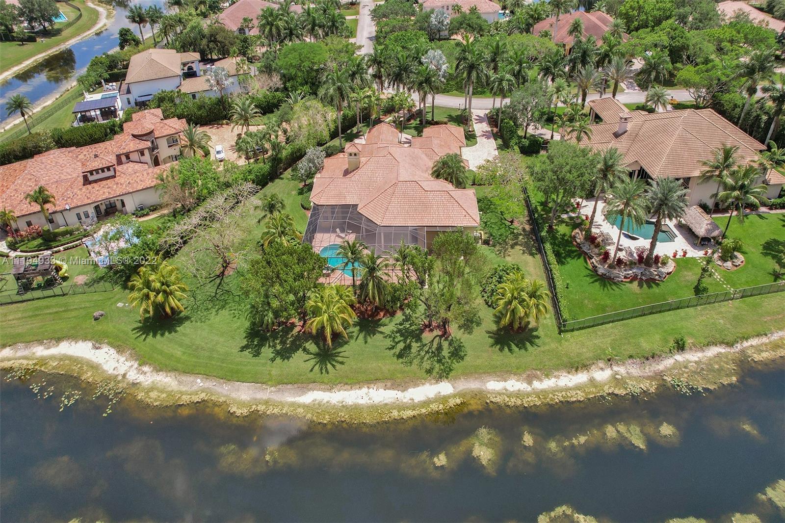 Stunning custom-designed home in the gated community of Windmill Lake Estates that sits on a 1+ waterfront acre. This home features NEW impact windows and doors. 5 bedrooms, 5.5 baths, a formal office, office in the master bedroom, custom theatre room, and den. Newly screened expansive paver patio and salt pool/spa area w/ summer kitchen, 3 car side garage, long circular driveway w/ grand porte-cochere. Marble in all living areas, wood in bedrooms. Sunken bar w/ wine fridge. Fireplace in living rooms and master bedroom. Freshly painted interior. Gourmet kitchen w/ center island, granite countertops, spacious pantry and top of the line appliances. Master bedroom w/ soaring ceilings, and 2 large walk-in closets w/ cabinetry. Marble master bath w/ jacuzzi, bidet, and large walk-in shower.