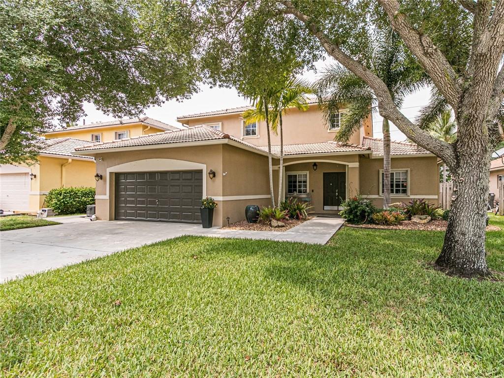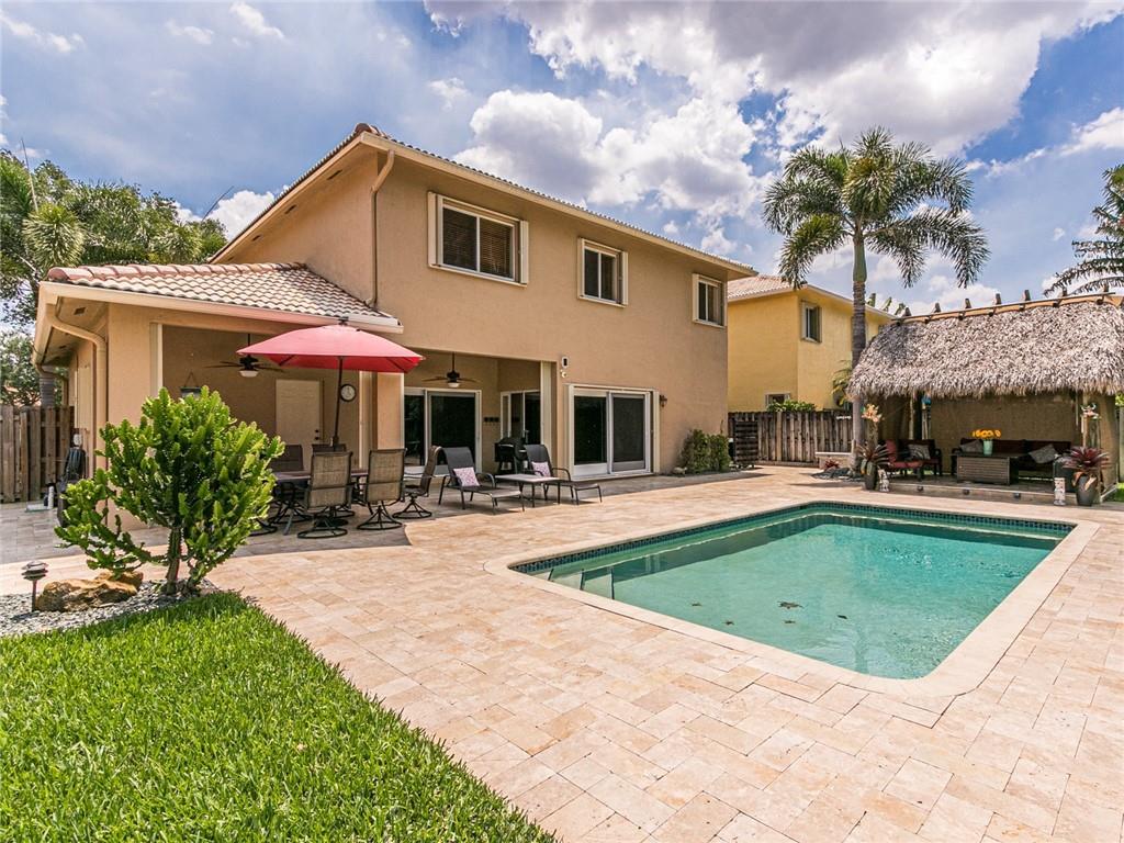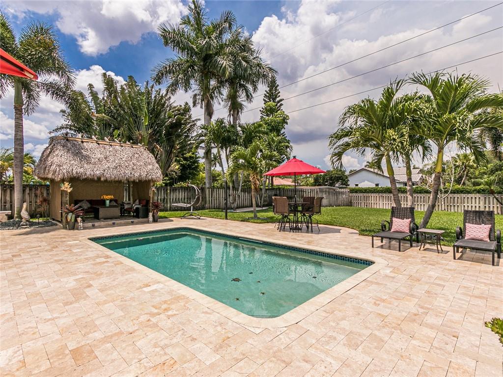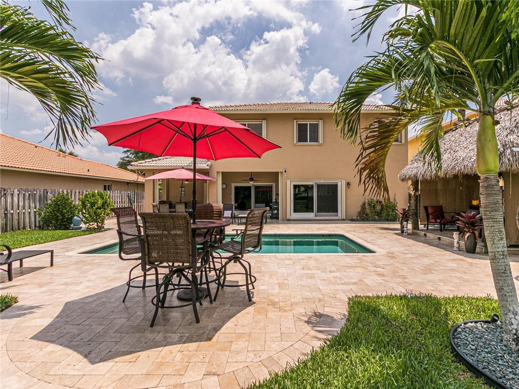 Outstanding opportunity to own this amazing home! This spacious home has 5-bedrooms & 3.5 bathrooms. One bedroom & full bath on the main floor. Kitchen was updated with granite counters & solid wood cabinets. Separate laundry room off kitchen. Hurricane shutters throughout plus impact sliding doors. Neutral tile flooring on the main, wood flooring upstairs. Make memories in the huge backyard, it's a tropical oasis with a private pool, a nearly 1,200sf travertine deck and a Chickee hut built in 2016 with electric! Plumbed for an outdoor kitchen. The manicured lawn has an electronic irrigation system that draws water from the canal. Garage has built in cabinets and Swisstrax flooring. Too much to list - see additional features sheet. Hurry this won't last! Professional pictures coming soon.