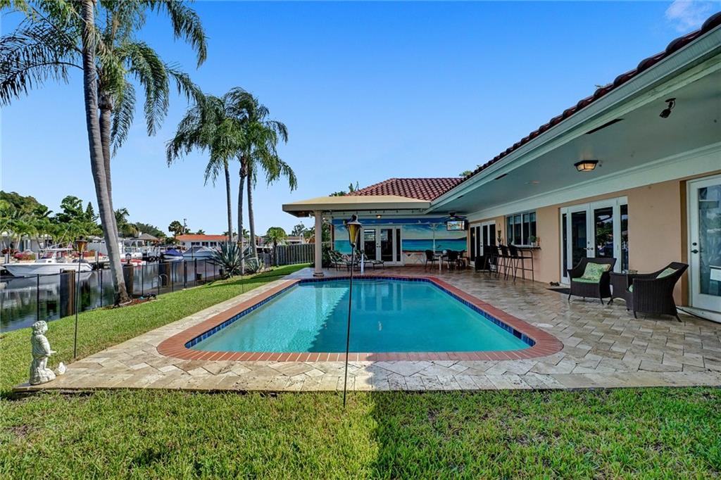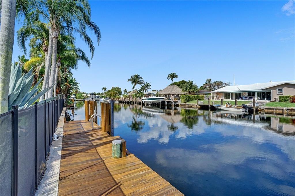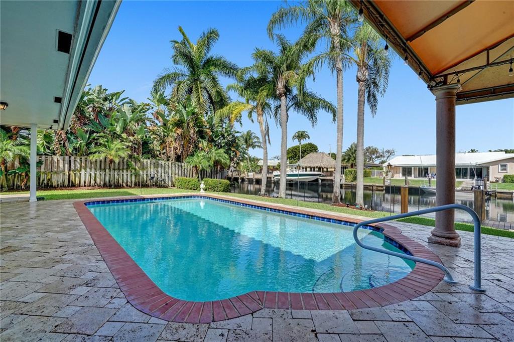Fantastic 3 bedroom 3 bath waterfront home located in The Landings. 100’ waterfront with ocean access. Impact windows and doors! Bright and open living area with plenty of natural light. Kitchen boasts ample cabinetry with passthrough window to the pool area. Spacious bedrooms and baths. Big backyard with pool, covered patio, grass area and dock. Interior laundry room with storage. This home is situated on an oversized lot (100x110’). Close to dining, shopping and beaches.
