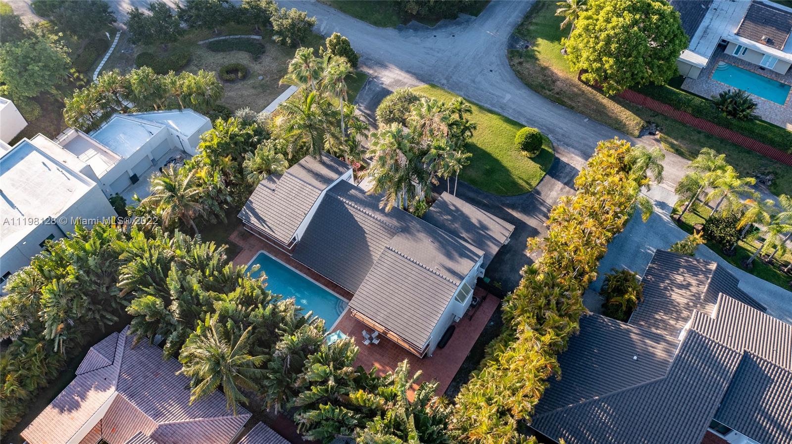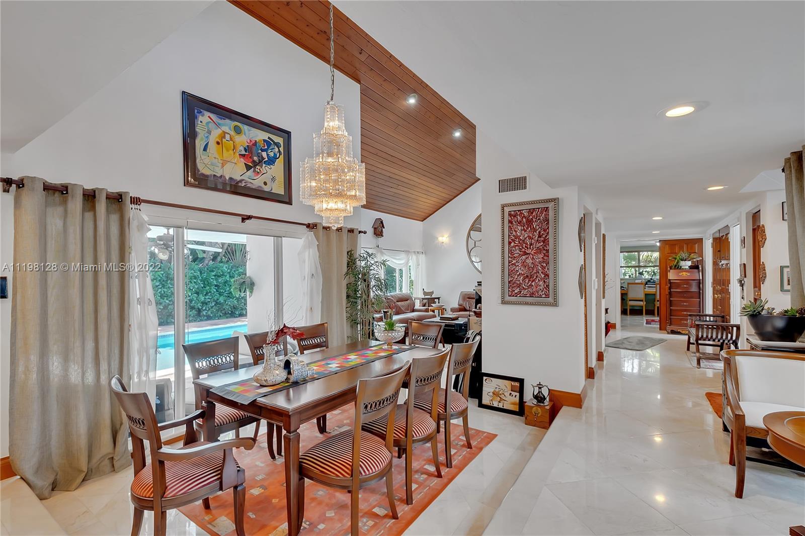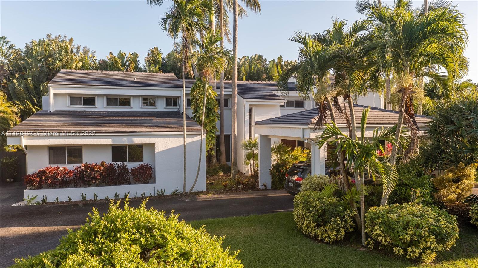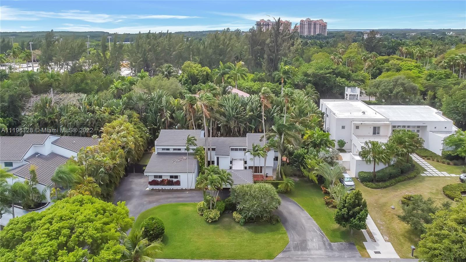 Fantastic, contemporary 5 bedroom/ 4 bathroom home tucked away on a quiet street in gated Pinecrest by the Sea. Enter this lovely home by way of the convenient porte-cochere. Grand formal living and dining rooms with soaring tongue and groove, vaulted ceilings. Spacious kitchen features plentiful cabinetry, granite countertops, new subzero refrigerator, double ovens, island with seating and opens to the large family room with beautiful views of the tropically landscaped backyard and pool. Office suite with bedroom and cabana bathroom downstairs. 4 additional bedrooms, including the generously-sized master suite, are located upstairs. New roof and AC units. Voluntary HOA, roving security. 2 car garage and circular driveway.