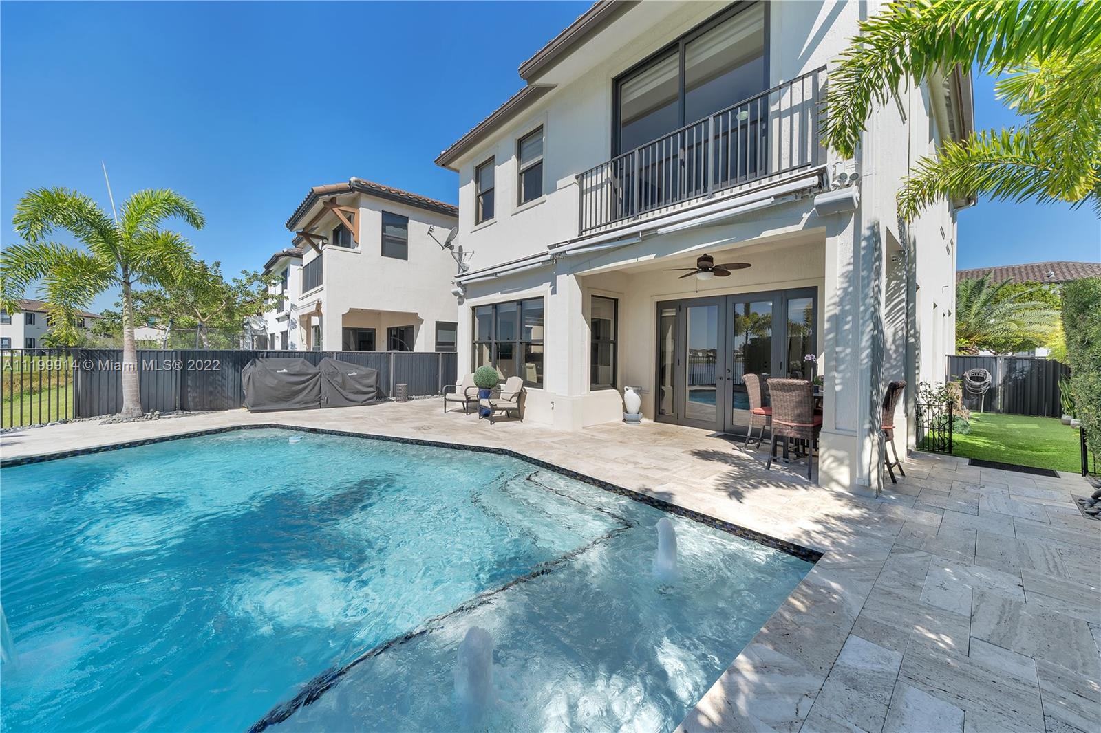 This pristine home has approx. $200K of upgrades. It's located on one of the largest corner lots in a private gated community on a lake. Upgrades include custom kitchen cabinetry w/quartz countertops, & stainless-steel GE appliances, beautiful porcelain tile on the main floor. Custom window shades, lighting fixtures, unique baths fixtures add elegance. French doors leads to large private heated saltwater pool w/glass crystal tile, waterfall fountain features & underwater multicolor lighting. Elegant patio area overlooking pool & lake perfect for entertaining. Outdoor speakers & electric retractable awnings which automatically retract when windy. Upgraded bathroom features. Sparkling lake views from bedrooms. Amenities include 24hr security, clubhouse, gym, game room, children play area.