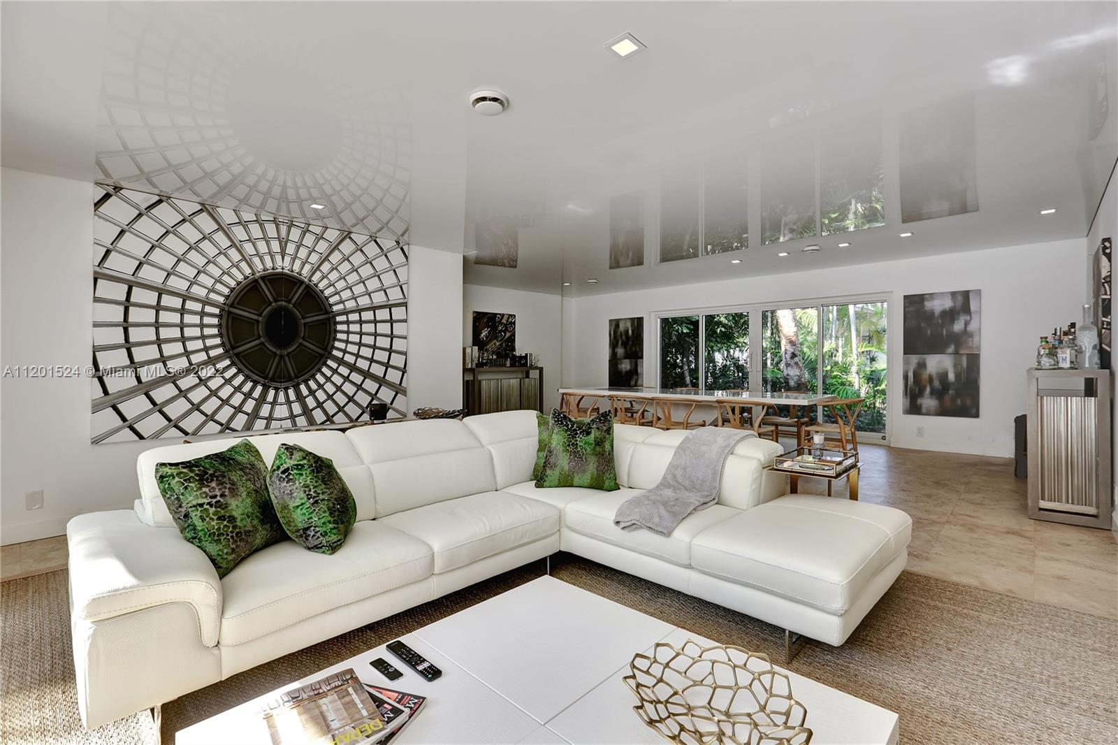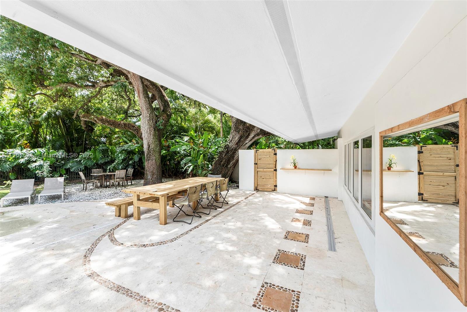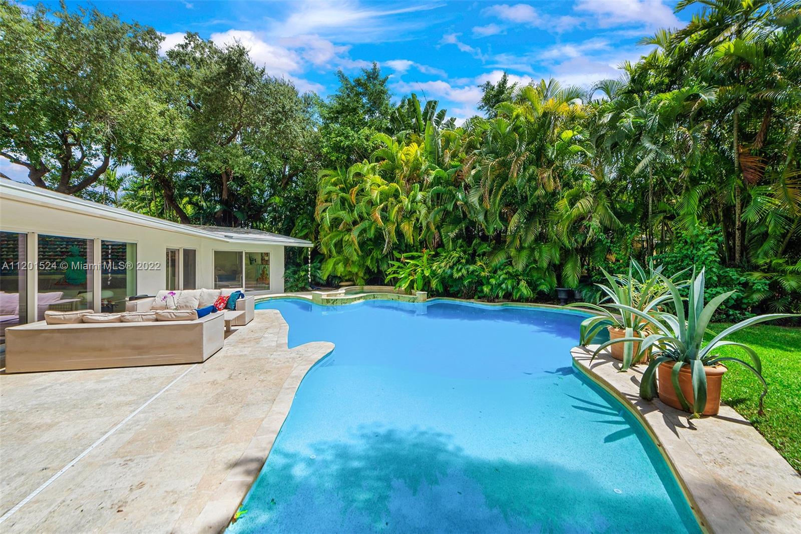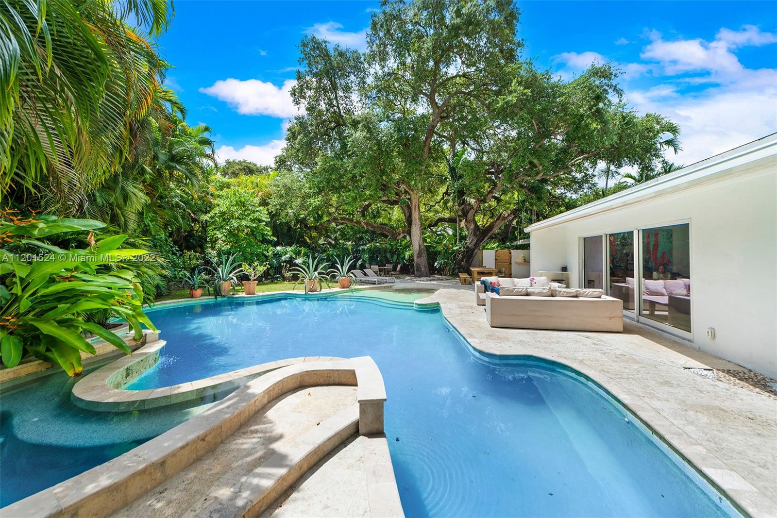 Beautifully updated, 2,464 SF, 4 bedroom, 3 bathroom, midcentury modern home in the most prestigious part of Miami Shores. This private, tropical, 12K+ SF lot sits under majestic oaks overlooking a heated, free-form pool with jacuzzi, and waterfall. The open floor plan features large rooms with floor-to-ceiling impact sliding doors throughout that exaggerate the lush greenery that surrounds the residence for a true indoor/outdoor living experience. Gourmet kitchen with quartz countertops and VIKING gas stove. The previous owners converted the 2 car garage into the new master wing with permits, it features luxurious walk-thru closet, custom dual sink vanity, oversized shower, and separate extra-large soaking tub with a view of your private tropical oasis! 2 A/C units Gas water heater!