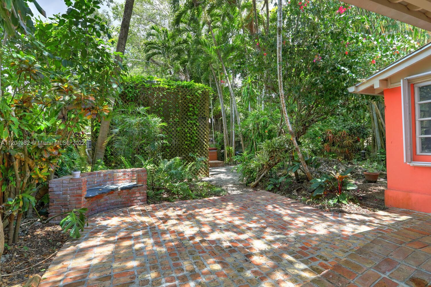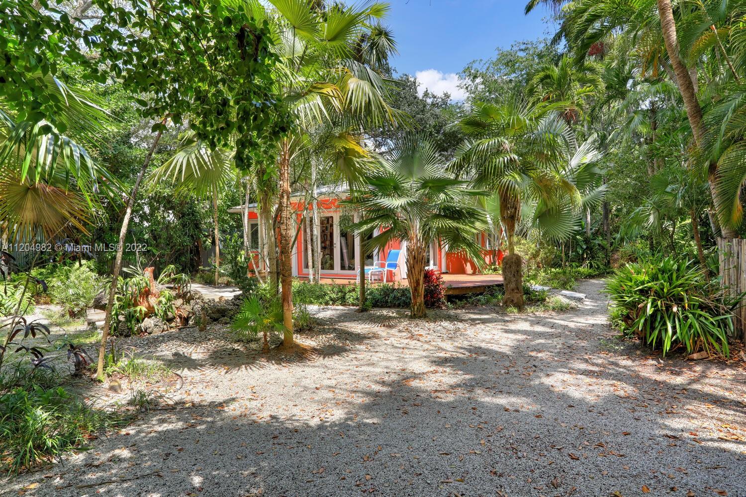 Enchanting, gated cottage set behind a high privacy fence and surrounded by a lush tropical garden featuring native palms, winding pathways & a magical pool with footbridge. French doors open to light-filled living spaces with beautiful wood flooring & stone fireplace. Large updated kitchen w/ wood cabinetry, slate flooring & stainless steel appliances. 2BR/1BA + living, dining, office & sunroom w/walls of glass. Enjoy outdoor living & entertaining on the tree-canopied wood deck & bricked patio. (10,800 SF lot). Additional features of the home include: detached garage structure currently used for storage, a generator & accordion shutters for all windows/doors. Walk or bike to the Grove village center’s galleries, boutiques, cafes and bayfront parks & marinas.