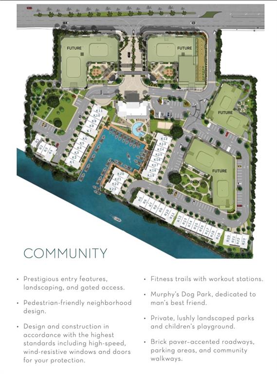 New Construction-Tranquil & secure 4-story townhouse with elevator shaft, 1 car garage & space to park 2 more cars, 3 bedrooms & 2.5 bathrooms. The Kael floor plan has 3,259 square ft of total area. High ceilings, multiple balconies & many views of the water and city. Impact doors & windows. High hat lights, gym, beach volleyball, billiards, cyber café, conference rooms, infinity edge pool, BBQ area, cabanas, tannings lawns, wet bar, 26-slip marina, dog park, playground, short distance to the beaches & all the entertainment you will ever need. There are still marina slips available for rent at $499/month for boats up to 30 feet long. HOA includes water, trash, sewer, club house, pool, gate, roof & exterior maintenance.