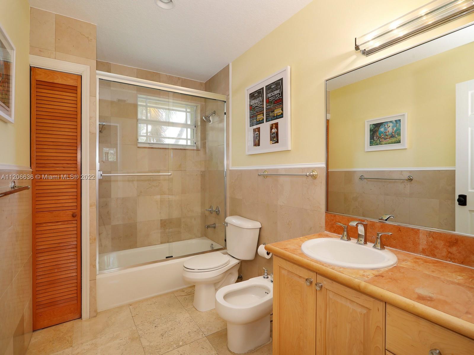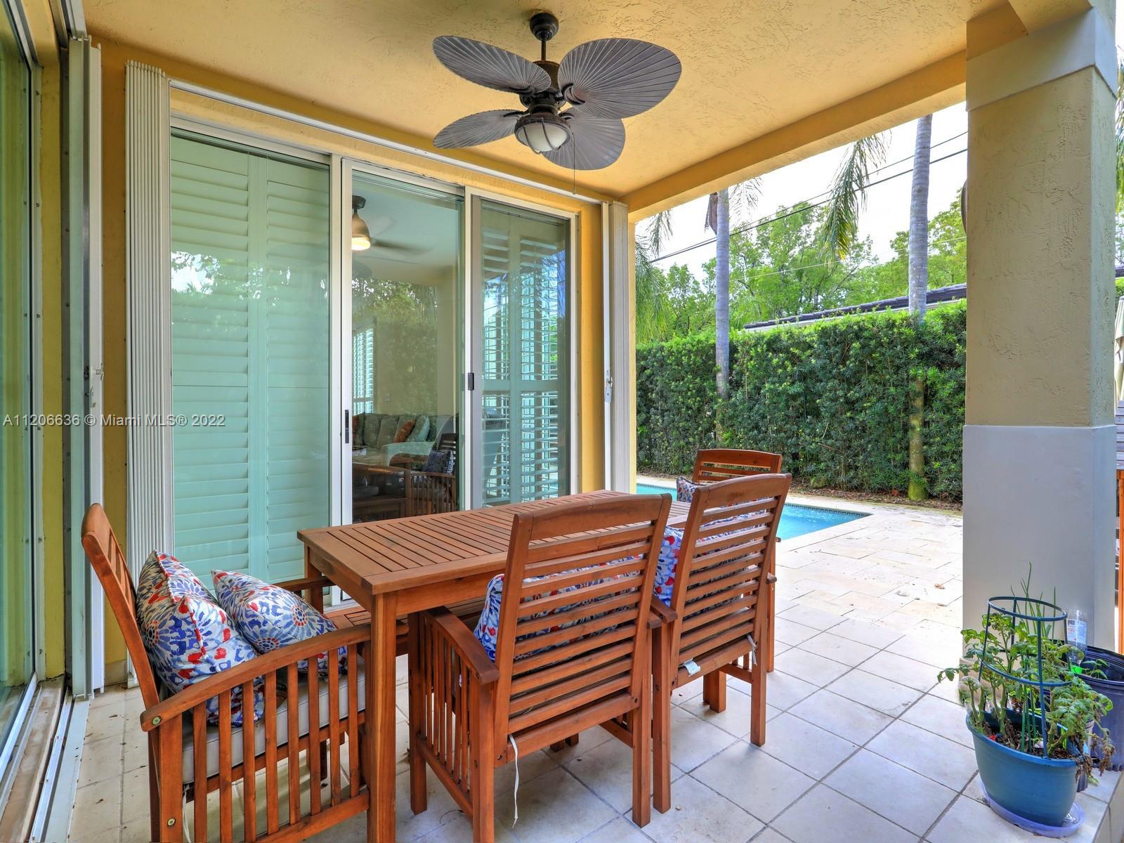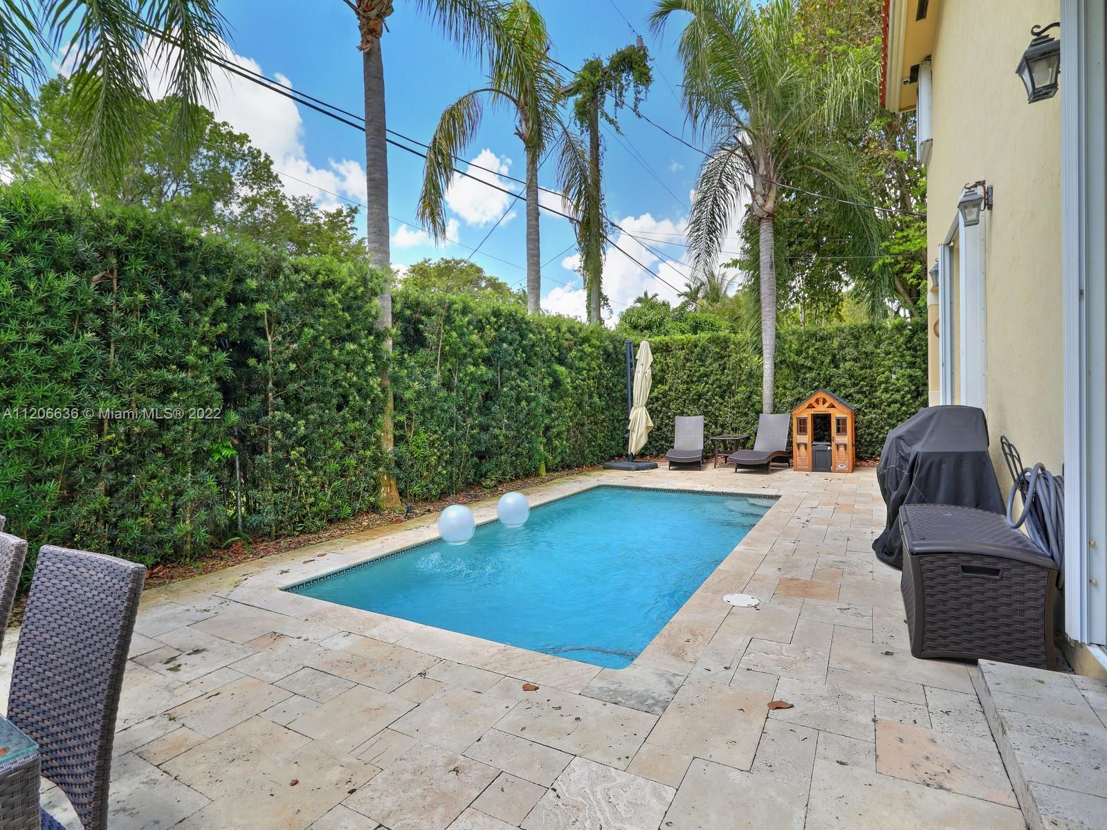 Centrally located on a charming tree-lined street, this beautiful two-story, 3 bed, 3.5 bath home is situated perfectly on its 5250sf private lot. This home features high ceilings, ample natural light, two car garage, formal living and dining rooms, powder room and eat-in kitchen with stainless steel appliances and granite counters. A large family room opens to a covered and breezy pool patio, perfect for dining al fresco in the evening while being protected by the recently installed Swat mosquito system. Upstairs, the master suite has a large walk-in closet and bathroom with dual vanities, whirlpool tub and large shower. The pool area has external bathroom access and pavers throughout the yard for easy maintenance. Enjoy walking distance to UM campus and mere minutes to Gables dining.