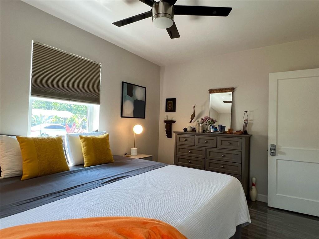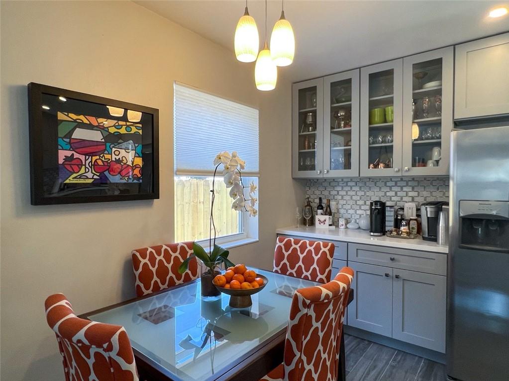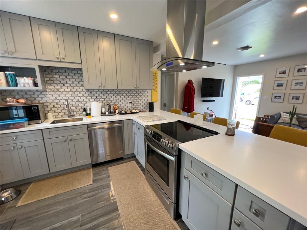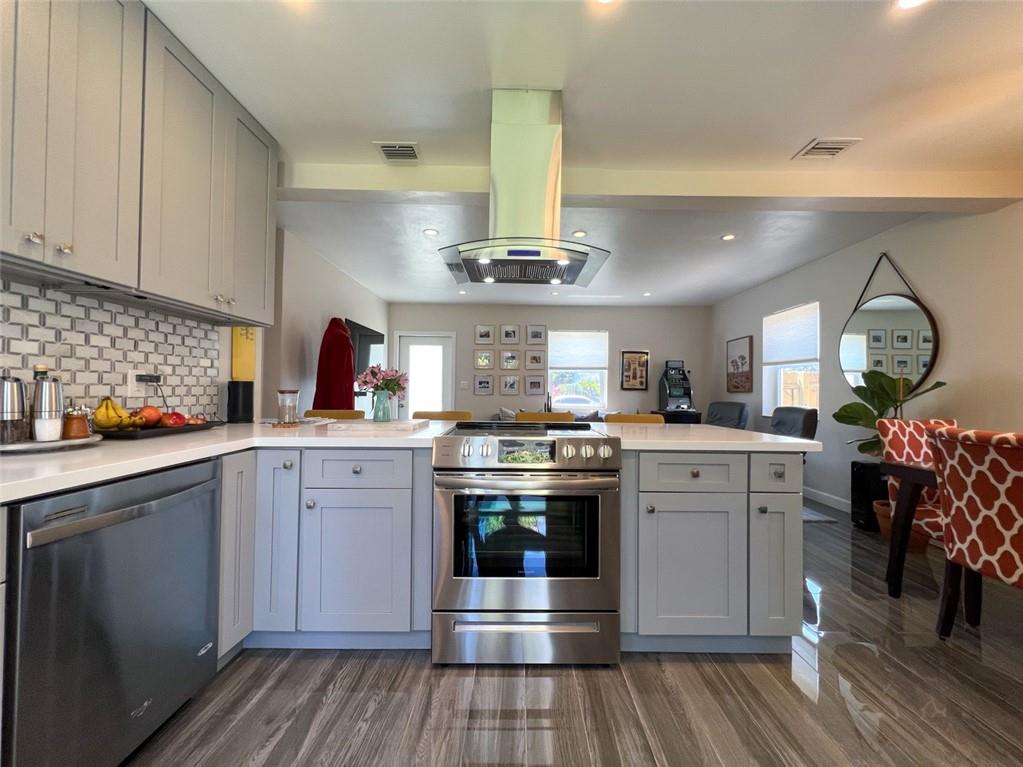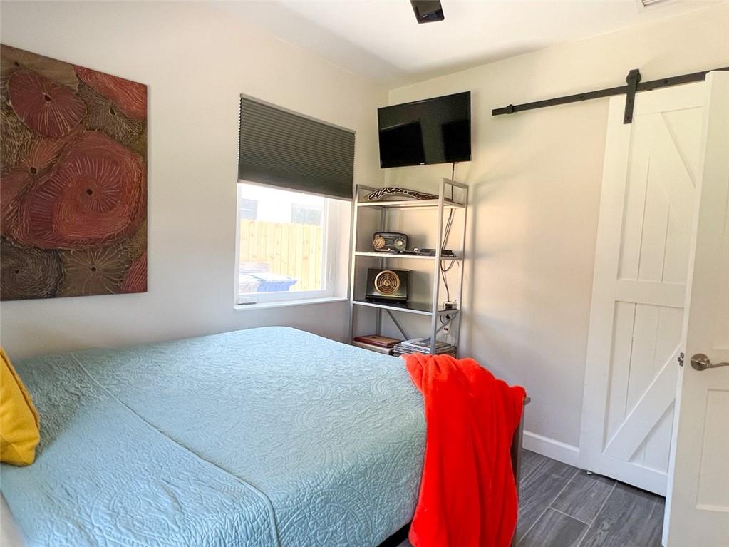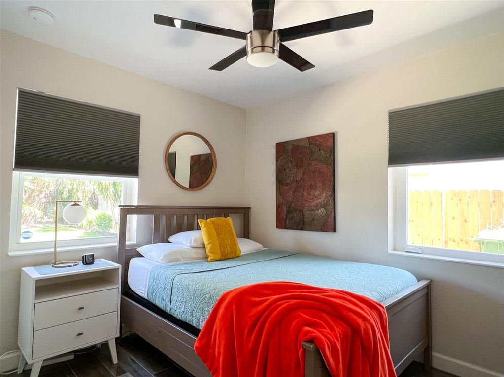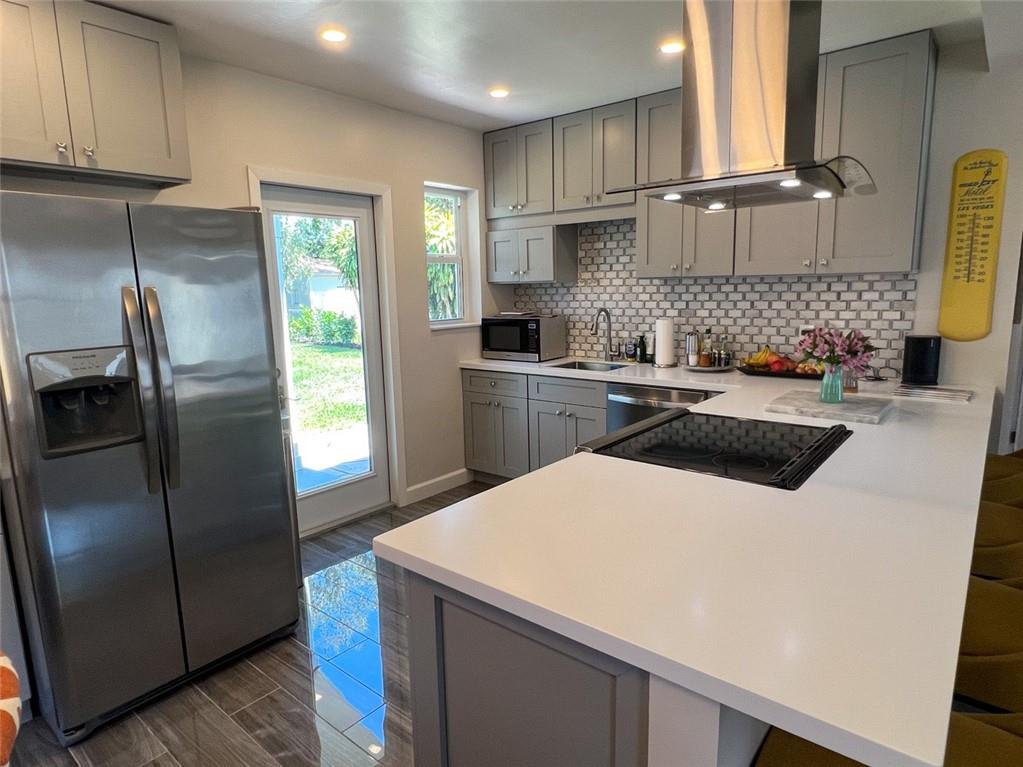 Spectacular, updated 2 bed, 1 bath home in Progresso. Completely updated, move-in ready. Wood-look, porcelain tile throughout. Kitchen open to living area. Corian countertops and large breakfast bar with counter seating. Gray cabinetry w/ soft-close doors and drawers. Stainless appliances include slide-in stove, dishwasher, and refrigerator with ice-maker and water dispenser. Extra deep stainless undermounted kitchen sink. Separate dining area with additional cabinetry and counter. Recessed lighting in living room and kitchen. Each bedroom has a ceiling fan and single closet with sliding barn door. Laundry room under air outside kitchen door. Large yard with room for pool. Storage shed in far rear. New roof in 2020, new impact windows/doors in 2021, and instant hot water heater in 2021.