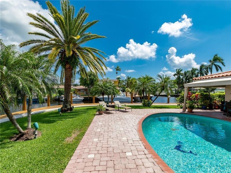 Spectacular POINT LOT with 196 feet of dock with 2 power pedestals and room for TWO to FOUR boats. Underwater dock lights attract snook and tarpon to the backyard. No fixed bridges. Views of the water from every room of the house. Split floor plan with open living room and dining room between the master and guest bedrooms. Remodeled kitchen includes new cabinets, aqua blue granite imported from Brazil, natural gas Wolf stove, new smart wi-fi refrigerator, new dishwasher. Bathrooms have been remodeled. New central HVAC, new smart washer and dryer, new pool heater and chiller, new pool pump, new electric panel and circuit breakers, new 16,000 pound boat lift (permit in process). Entire house is protected with roll-away hurricane shutters above every door and window. Extra large driveway.
