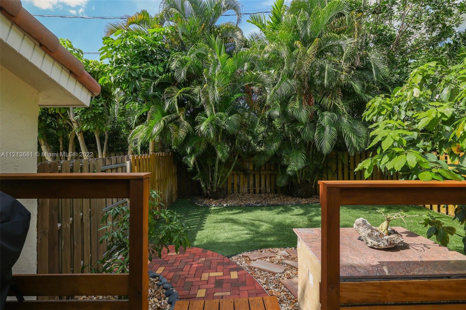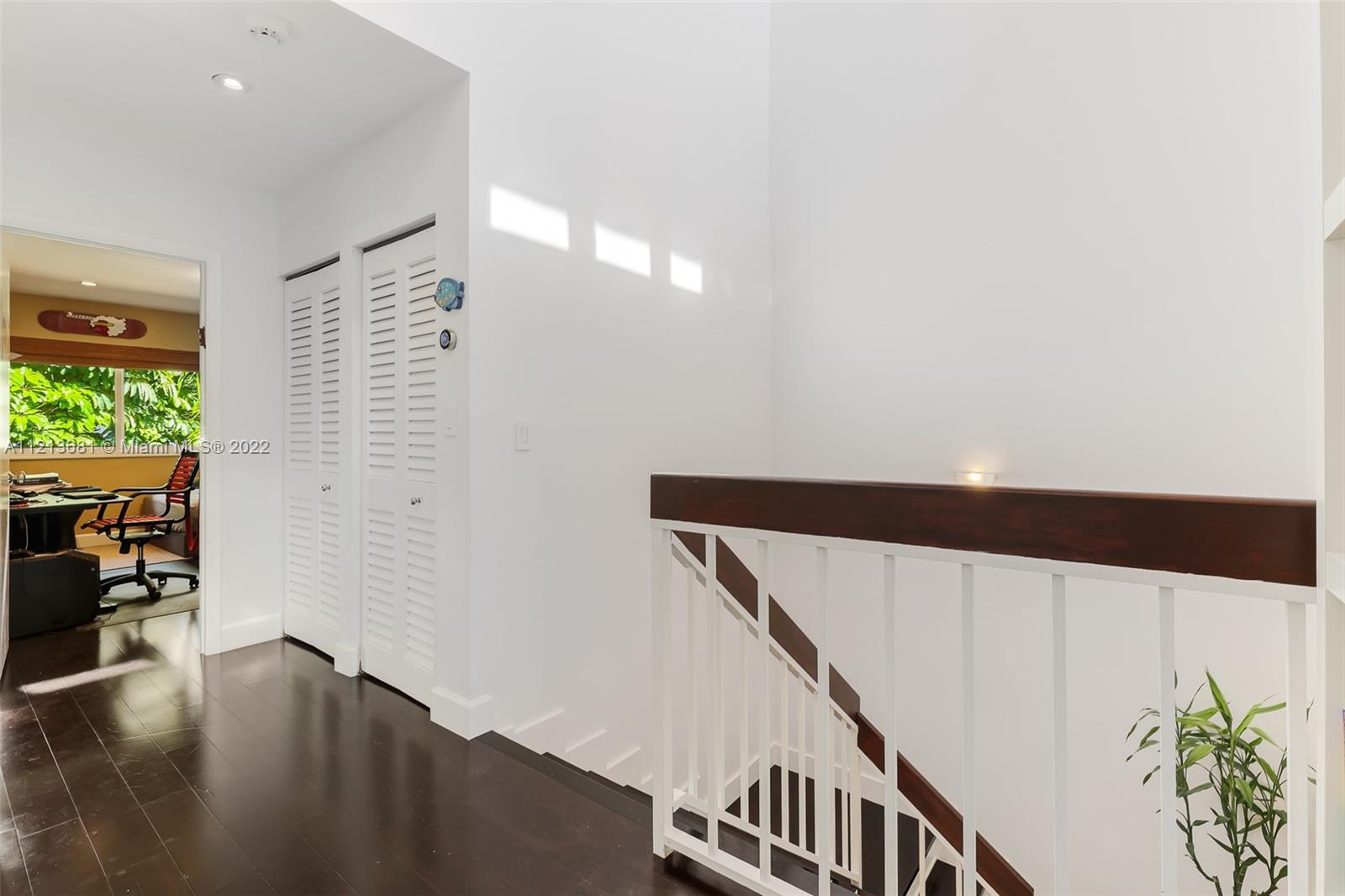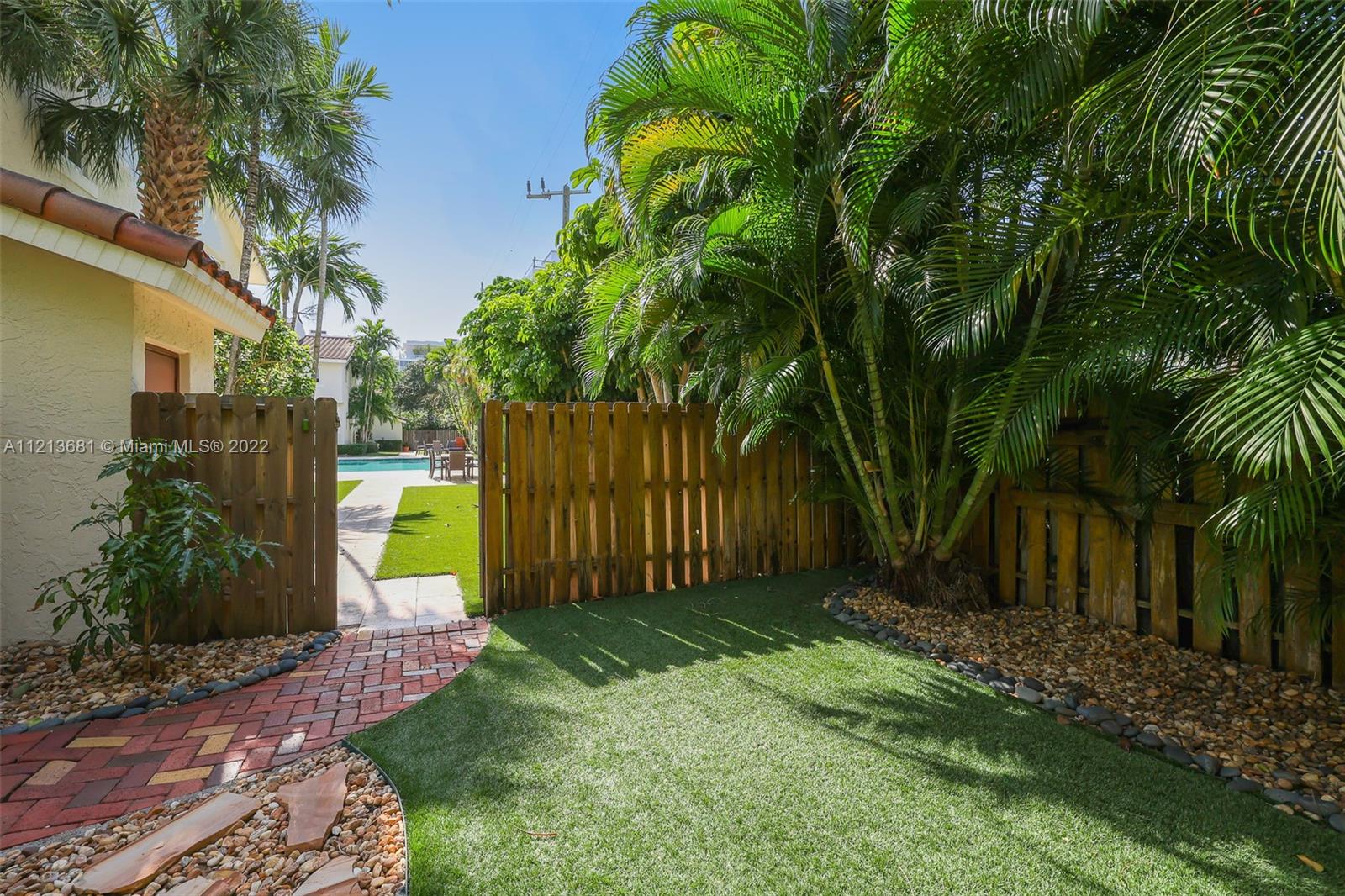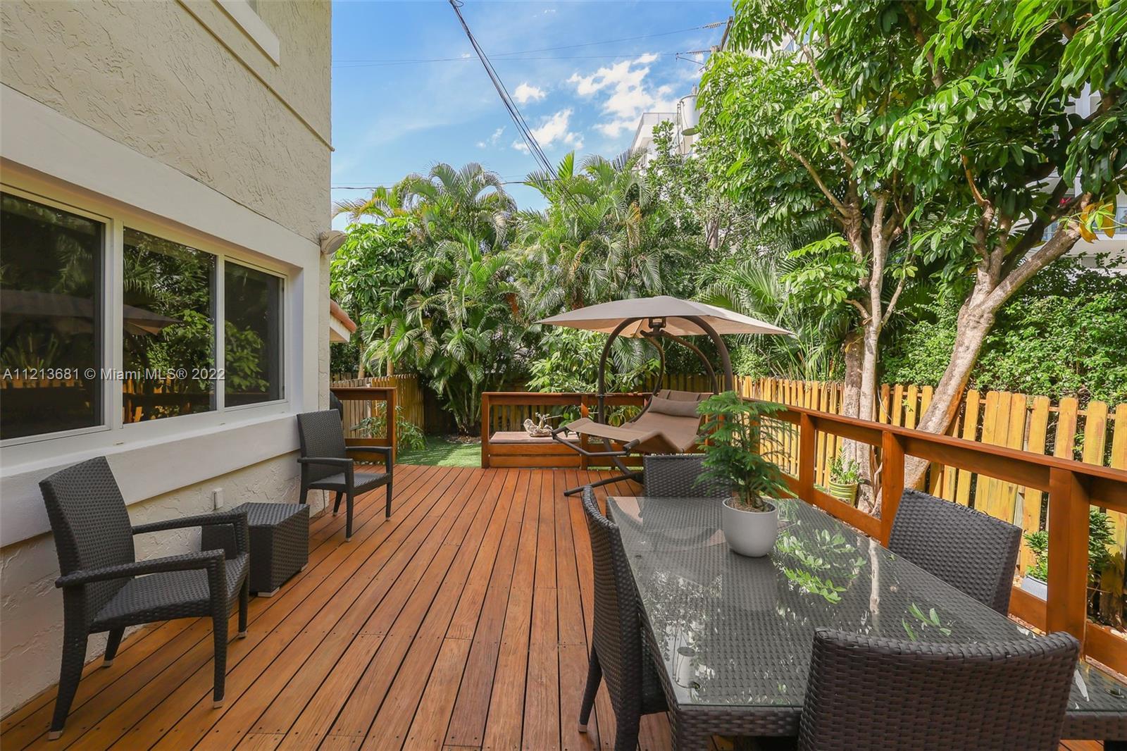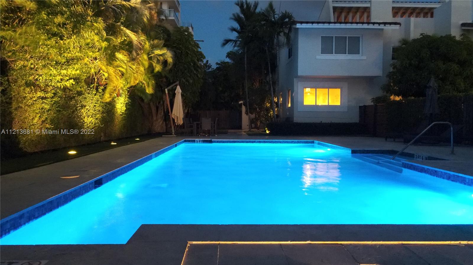 ONE OF A KIND, RARE FIND in highly desirable neighborhood. BACK CORNER away from street. Large 3 bedroom/2.5 bath/small office. Spacious 2 story floor plan. NOT multi-level vertical living. Windows and skylights provide lots of natural light. All hurricane impact windows & doors. Private backyard with direct access to heated pool. Patio features hard wood deck with serene open space and fruit trees. Abundant storage and walk-in closets; including large attic storage. 2 private parking spaces in spacious parking lot, directly in front of each unit with plenty of extra parking for guests and/or additional cars (unique for this area). Only 8 townhouses on entire 3 lot property. Short walk to beaches, places of worship (Young Israel/The Shul) restaurants, park, A-rated K-8 school and more.