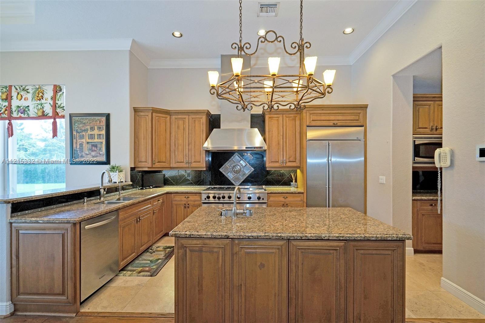 This luxurious home, located on a builder's acre, boasts: 4 bedrooms, a den (which can be converted to another bedroom), plus office, 3.5 bathrooms, hurricane impact front doors, accordion shutters, gorgeous chef's kitchen with gas stove, custom cabinetry and shelving in all closets, master bedroom with large sitting area, Jacuzzi tub in master bathroom, hardwood floors & travertine throughout, and laminate wood floors in all bedrooms. The home is powered with a back-up generator, which runs on a 500 gallon propane tank and can power the house for over a week. There is a separate 110 gallon propane tank, which fuels the stove and hot water heater. Both AC's were replaced in 2014. The home is equipped with security cameras around the perimeter. You must see the backyard to believe it!!!