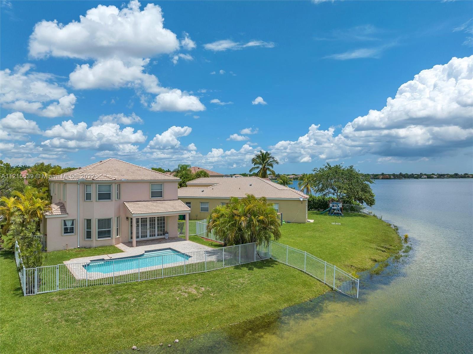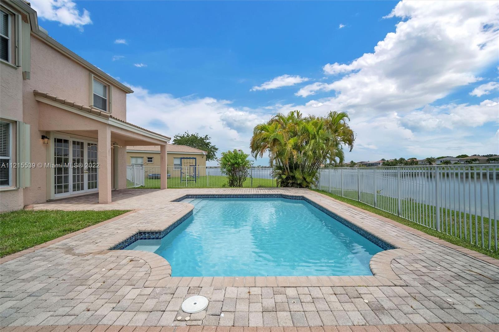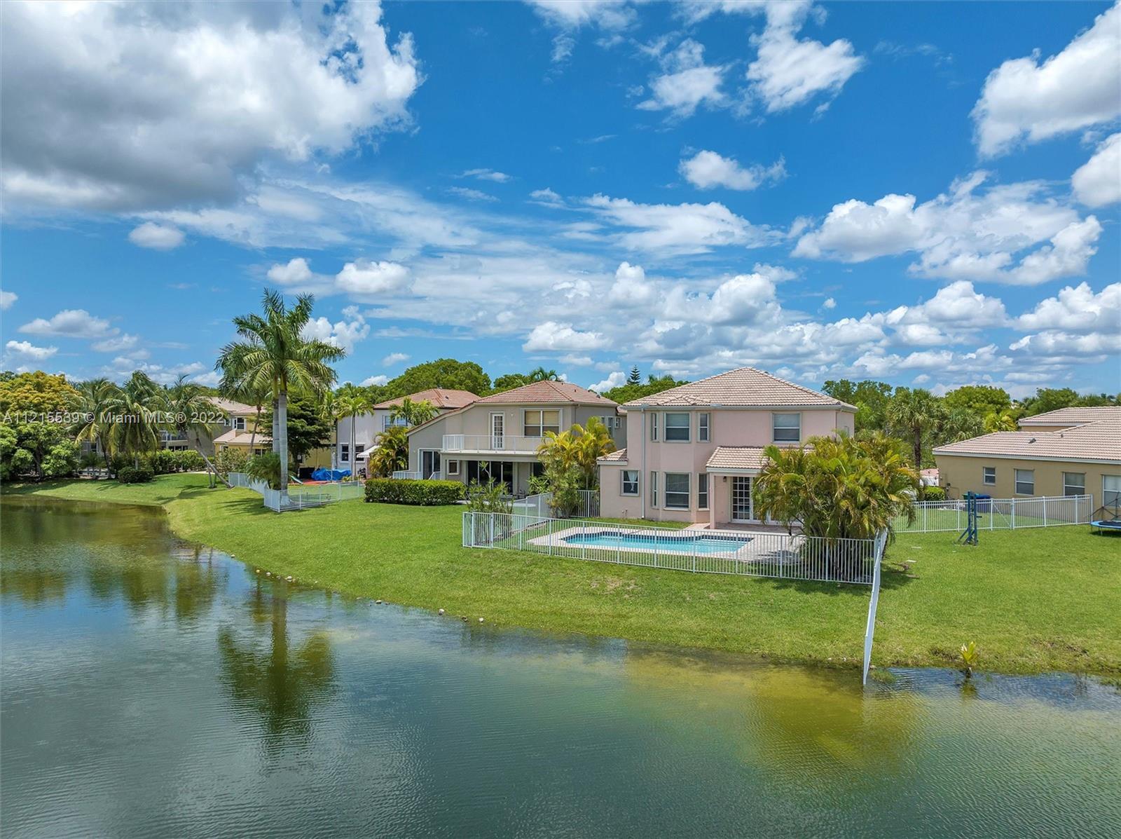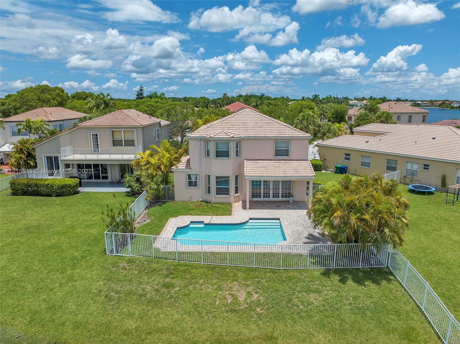 Superb tropical waterfront, pool,4 BR, 2.5 bath home in the manned-gated community of Riviera Isles in West Miramar. Huge upgraded kitchen w/ big pantry, island, wood cabinetry, granite counters, prep sink, stainless steel appliances, eat-in kitchen, more. Formal living room, formal dining, family rm, awesome new laundry room. All BR upstairs, large primary suite w/sitting area. Beautiful wide lake views, fenced yard, pool, covered patio. Resort Style amenities: manned gates, fitness center, lakeside clubhouse, tennis, basketball, huge community pool w/waterfall. Excellent location, Grade A schools. Close to Miramar Regional Park, Memorial Miramar Hospital, new shopping/dining, highways.