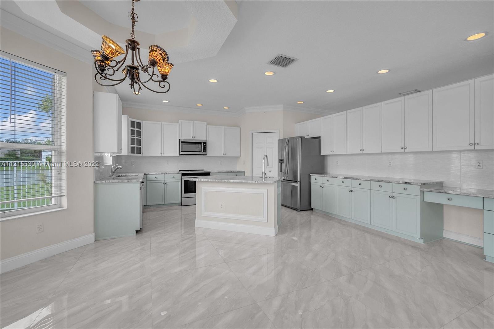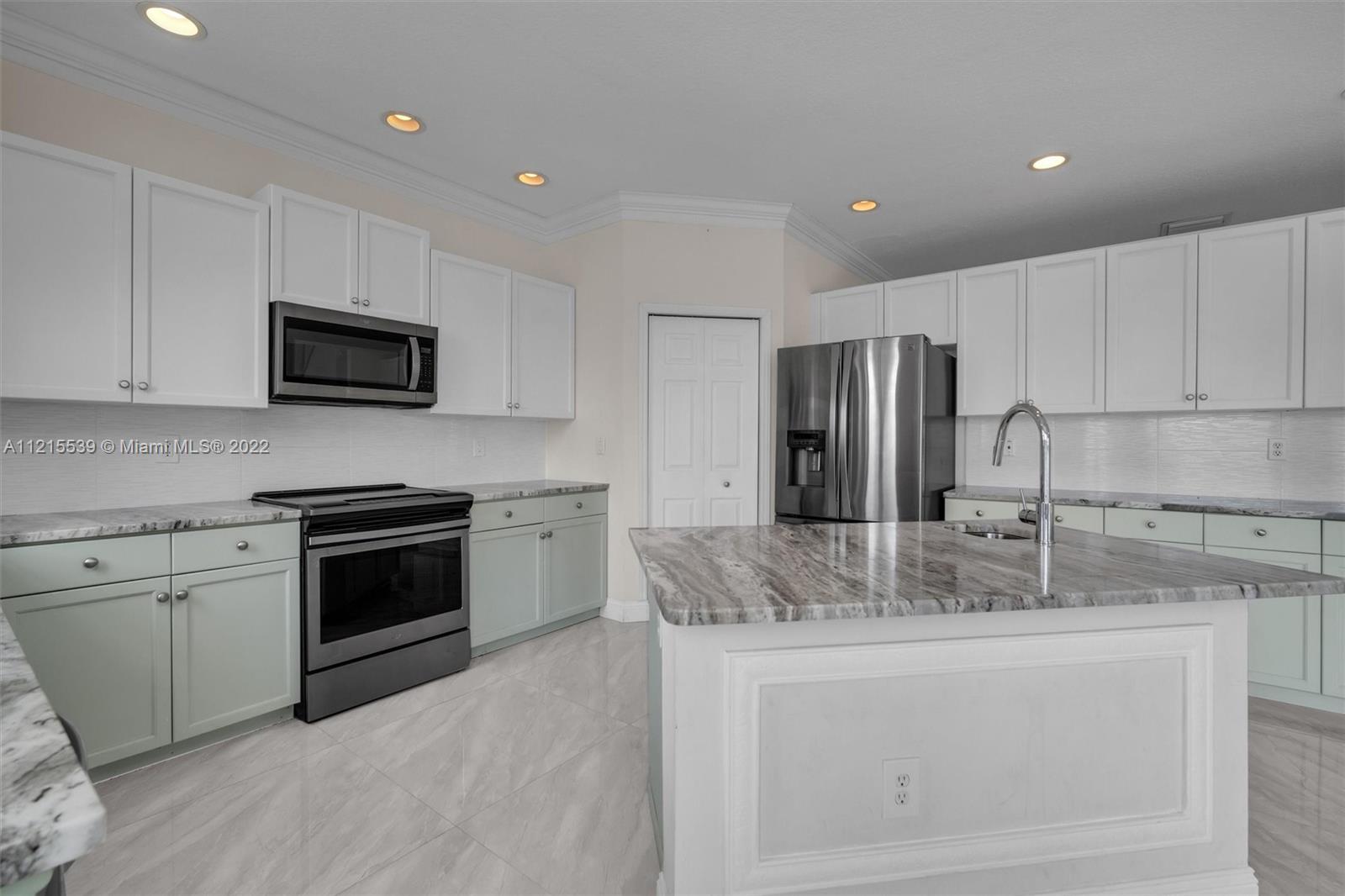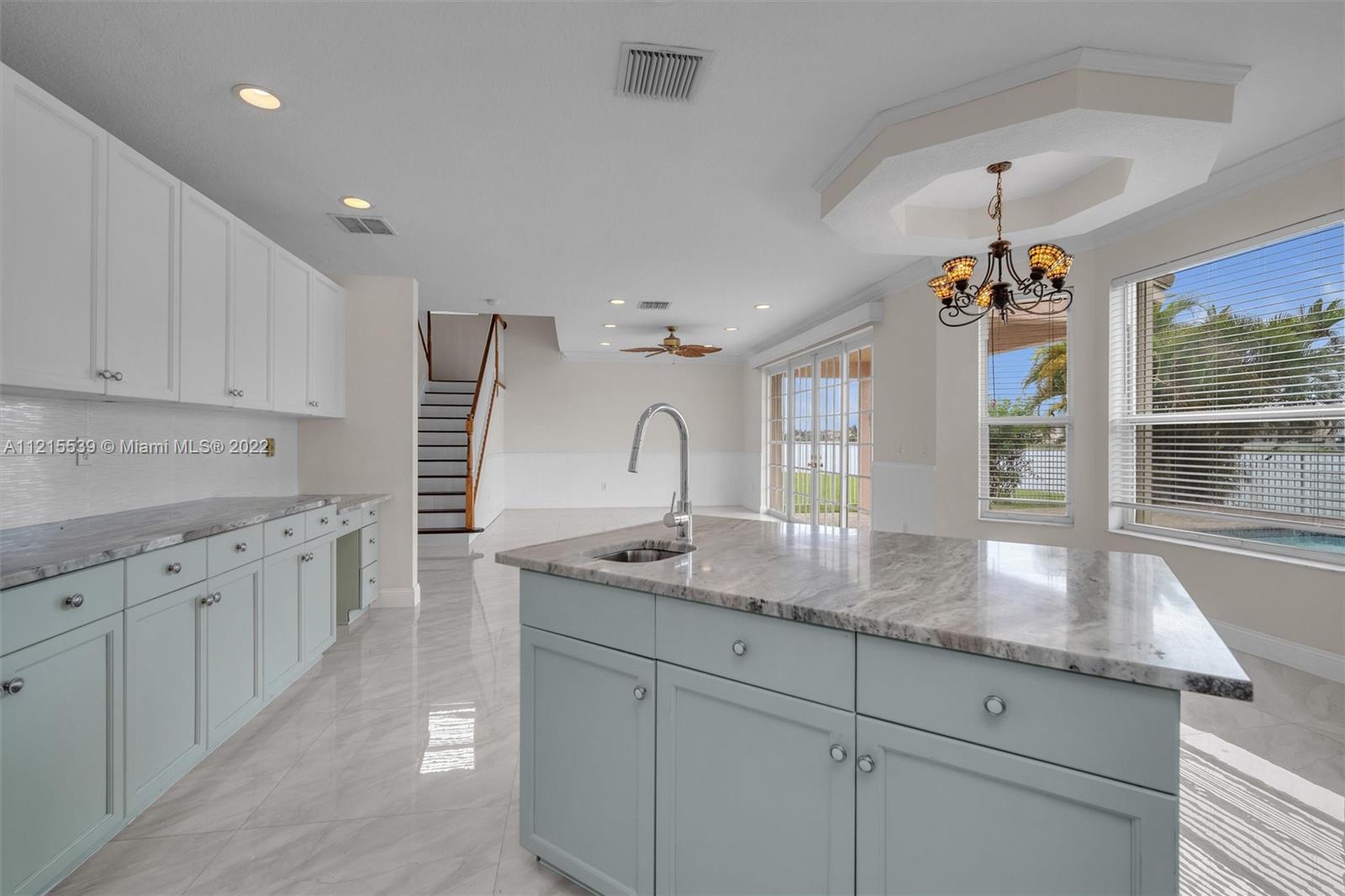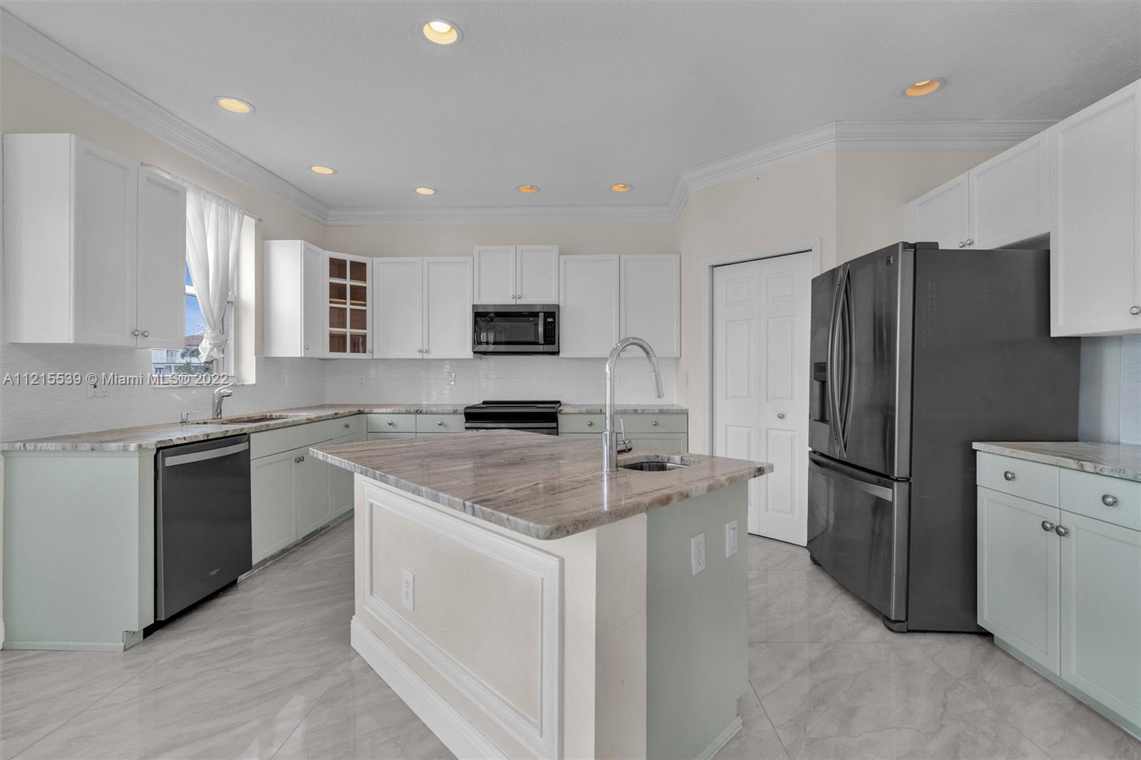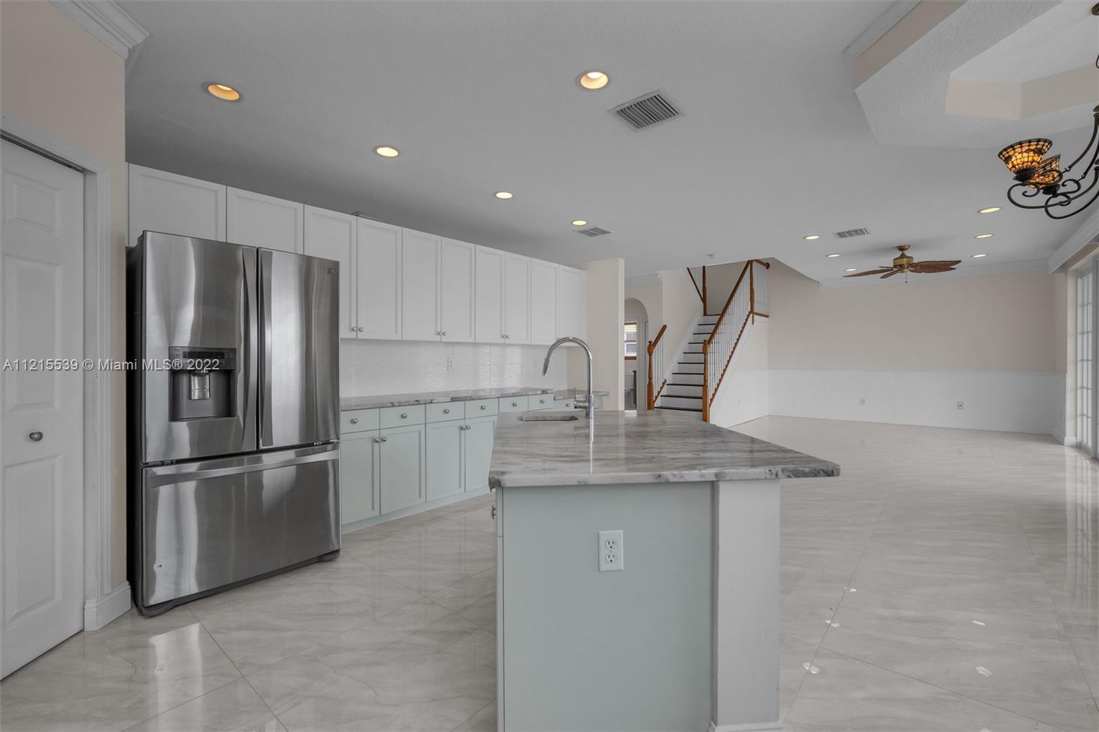 Superb tropical waterfront, pool,4 BR, 2.5 bath home in the manned-gated community of Riviera Isles in West Miramar. Huge upgraded kitchen w/ big pantry, island, wood cabinetry, granite counters, prep sink, stainless steel appliances, eat-in kitchen, more. Formal living room, formal dining, family rm, awesome new laundry room. All BR upstairs, large primary suite w/sitting area. Beautiful wide lake views, fenced yard, pool, covered patio. Resort Style amenities: manned gates, fitness center, lakeside clubhouse, tennis, basketball, huge community pool w/waterfall. Excellent location, Grade A schools. Close to Miramar Regional Park, Memorial Miramar Hospital, new shopping/dining, highways.