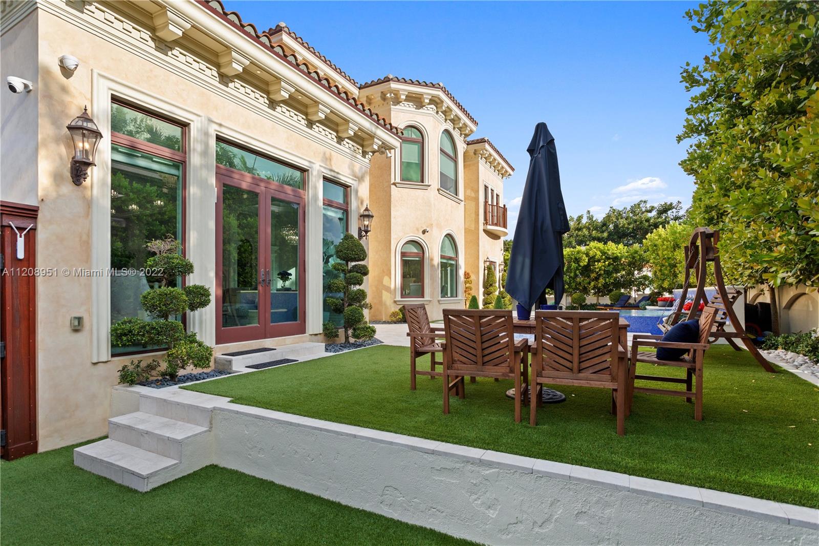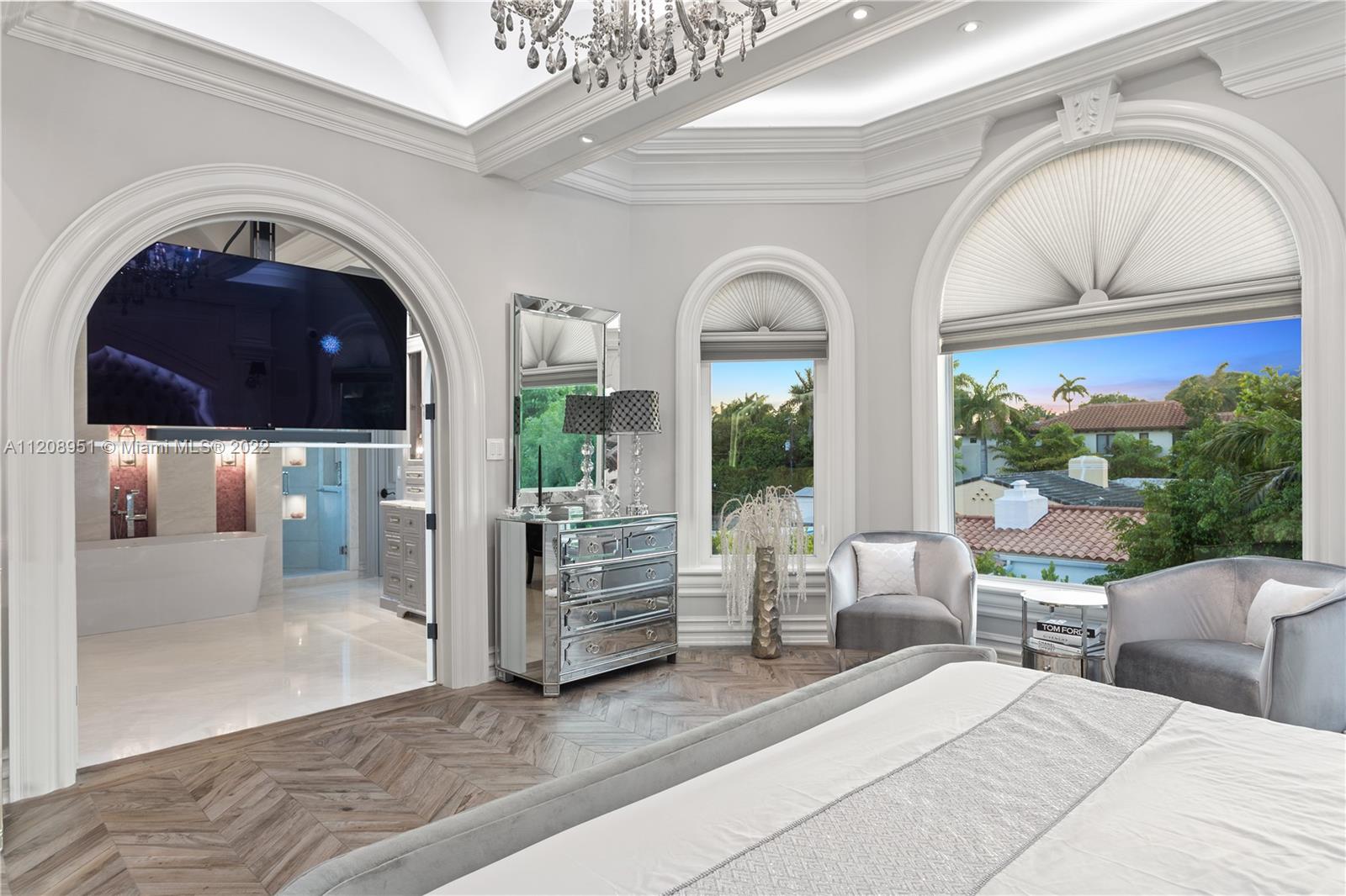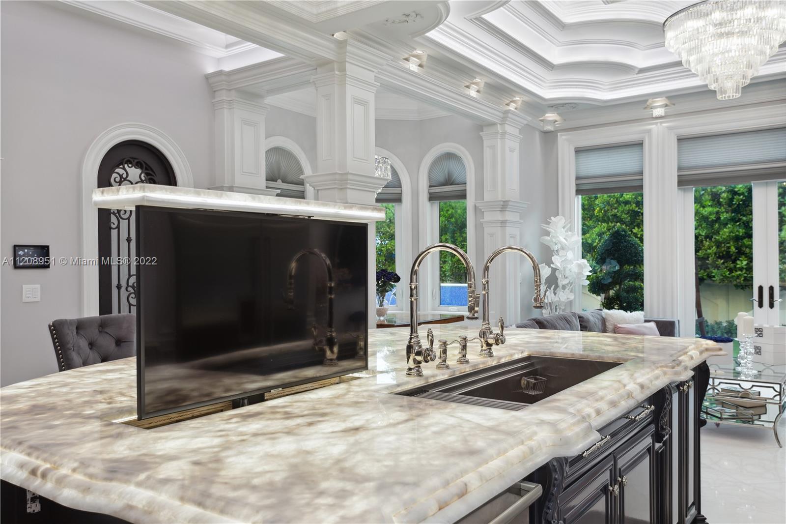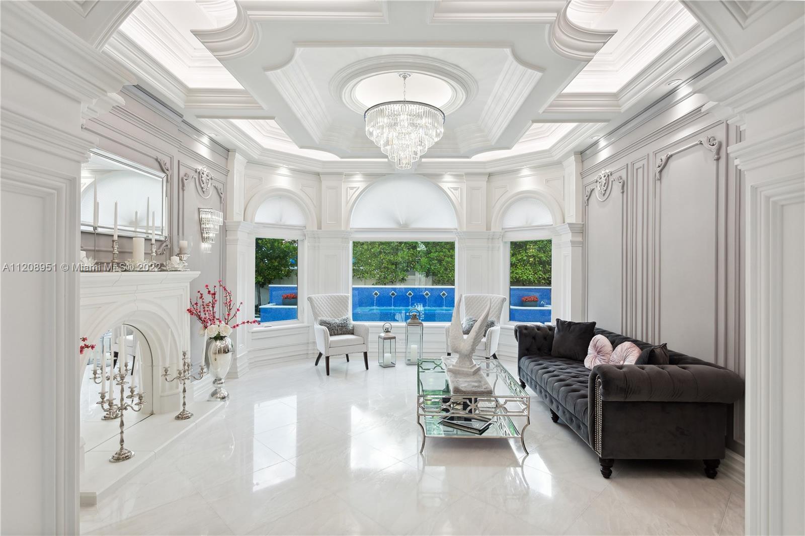 Exquisite, elegant, and sophisticated custom-made new home. Rarely has Miami Beach offered such a level of ornamentation and crisp details. Very bright with high ceilings, (12ft and 28ft), secured with 25 surveillance cameras and control panels, this home is the pinnacle of luxury and privacy. Opulent wall panels and millwork fabricated on site. Each ceiling is backlit with recessed LED lights. 8' interior doors, 24'' white marble tiles. Impeccably maintained design present throughout the home, leading to a manicured backyard with a large pool, spa, 4 submerged bar stools, and a BBQ area. Two-car garage with 28' ceilings allowing for extra lifts. Expansive center Cristall Quartz kitchen- island backlit with LED lights and 32' disappearing TV. See attachment for more details.