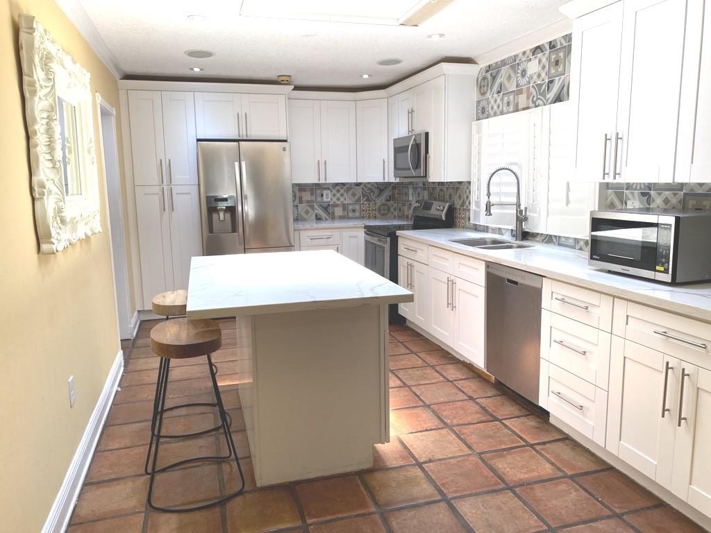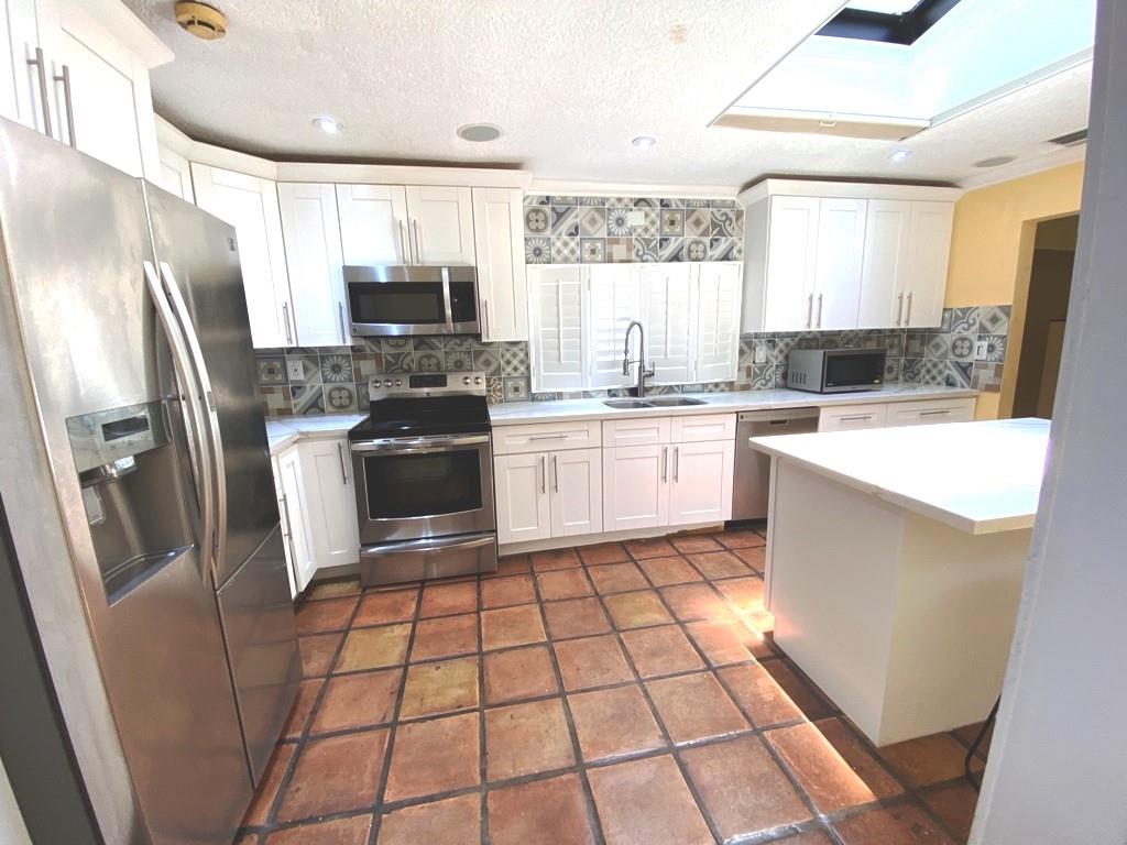 WONDERFUL UPDATED 3 BEDROOM 2 BATH 1 STORY SINGLE FAMILY HOME - KITCHEN HAS NEW CABINETS AND STAINLESS APPLIANCES WITH ISLAND FOR EATING & SKYLIGHT - TILE AND LAMINATE FLOORING THROUGHOUT- SPLIT BEDROOM PLAN - ENCLOSED FLORIDA ROOM OVERLOOKING LUSH BACK YARD- FENCED YARD - WHITE PLANTATION SHUTTERS ON ALL WINDOWS-1 CAR GARAGE -WASHER & DRYER