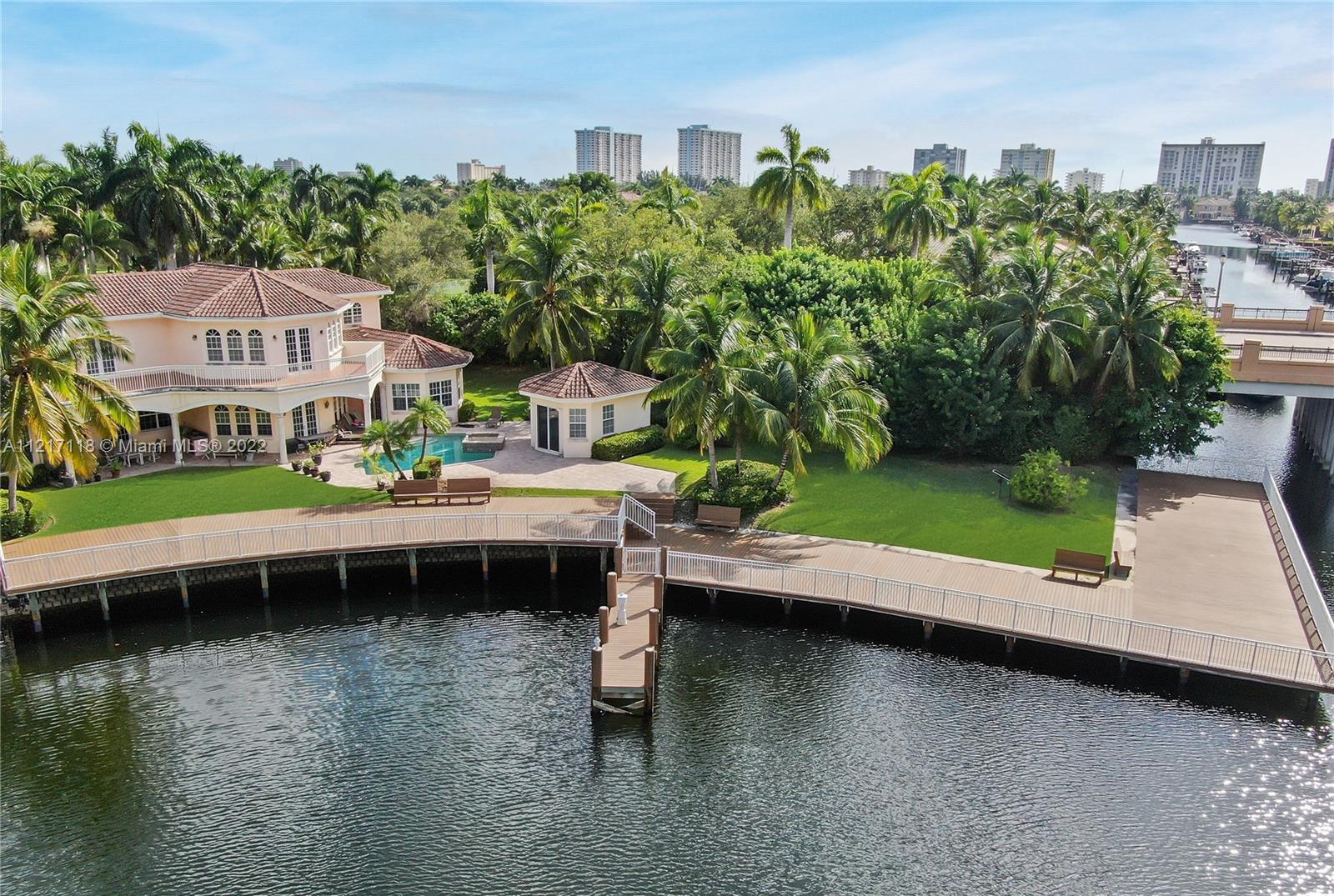 Once-In-A-Lifetime opportunity to acquire the most renowned property in Harbor Islands. Rarely available compound with 6,798 SqFt of living area on a 24,811 SqFt lot. Expansive waterfront living with 235 feet +/- of water and abundant dockage. 4beds/5.5baths & 1bed,1bath detached guesthouse/cabana. 3 car garage. Plenty of green lawn space with fruit trees and open area. Impressive courtyard entrance welcomes a massive floorplan featuring marble floors, large open kitchen, 2 bedrooms on first floor including huge master foyer, 2-story library/office, & wraparound waterfront balcony. New clay tile roof in progress. Private community with multiple security gates, tennis & bball courts, pool, large gym, etc. A true entertainer’s home that will be the landmark among friends and family.