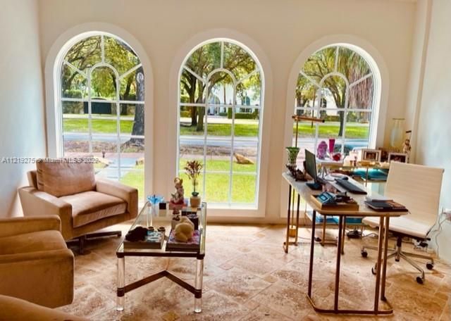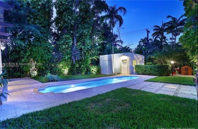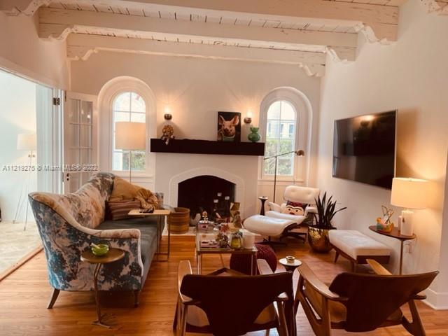 Charming Spanish home located on prestigious Alhambra circle. Private lot w/ tall palm trees and a large pool. Updated with wood floor, Florida room with lots of light and French doors that opens to a living room with a functioning fireplace. Master bedroom area has a beautiful spa like bathroom with a bath tub/shower open area, and large walk in closet. New appliances in an open kitchen with eat in island. Large second bedroom & bath, New AC, carport, partial impact glass, new roof. Patio overlooks the yard, newly guest house w/ small liv room, bedroom, bath and efficiency kitchen. House was restored preserving the historical integrity of the property, while adding modern amenities such as open floor plan, beamed ceiling, Spanish archways, and natural light are a few things.