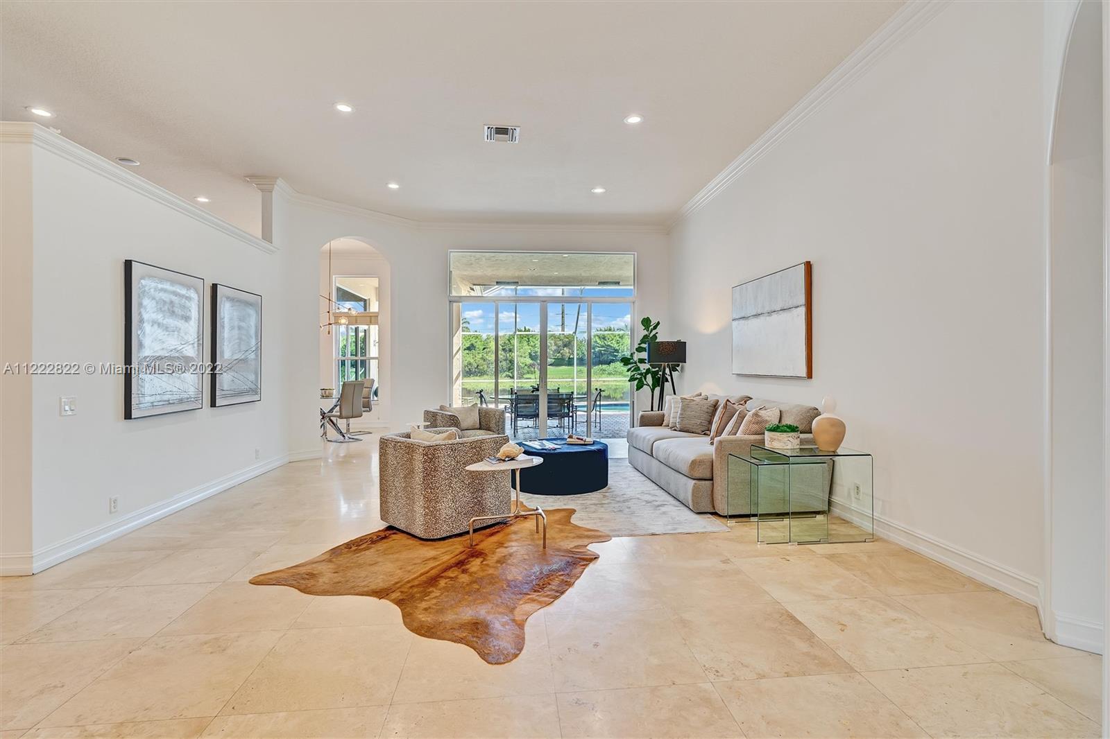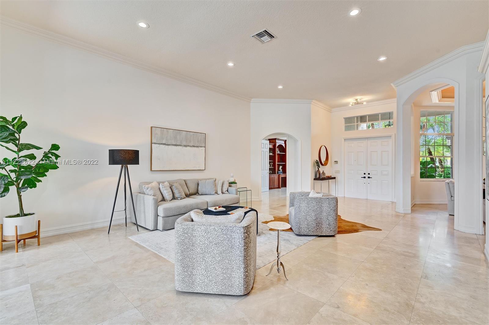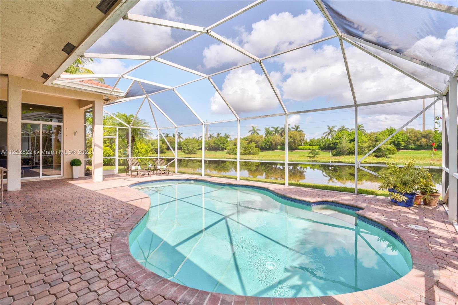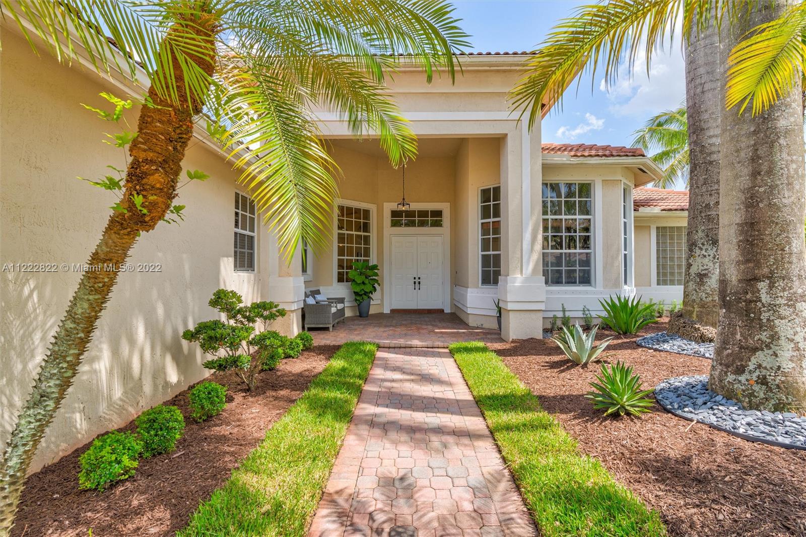 Gorgeous one-story lakefront home located in the prestigious golf gated community of Weston Hills Country Club. Open and spacious split floor plan featuring 5 bedrooms, 3.5 bathrooms and 3 CG with circular driveway. Volume ceilings, large living areas and open floor plan kitchen next to the family room, perfect for entertainment.The primary bedroom overlooks the lake and pool, while offering two custom walk-in closets and a spacious spa-like bathroom. Freshly painted interior with new LED lights and chandeliers. Newly designed modern landscaping. Marble flooring in main areas. Private outdoor, covered and screened patio overlooking the lake with a free-form pool. Perfect home for entertaining and enjoying South Florida living. Move in ready. Best schools in Florida.