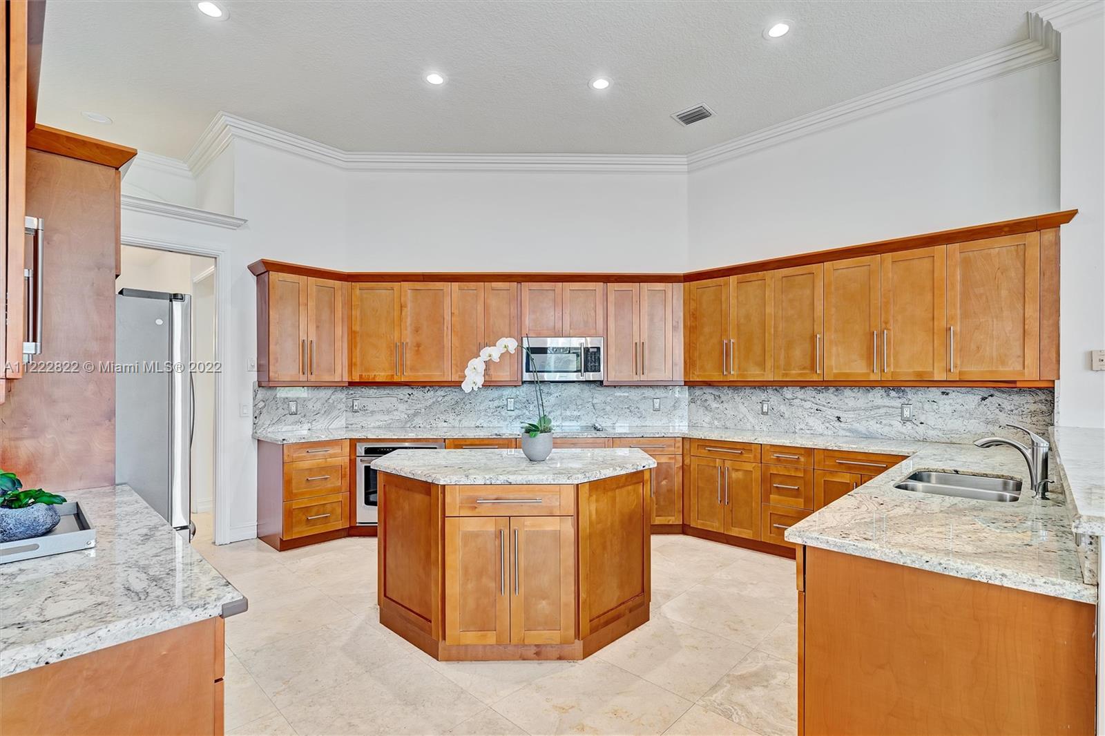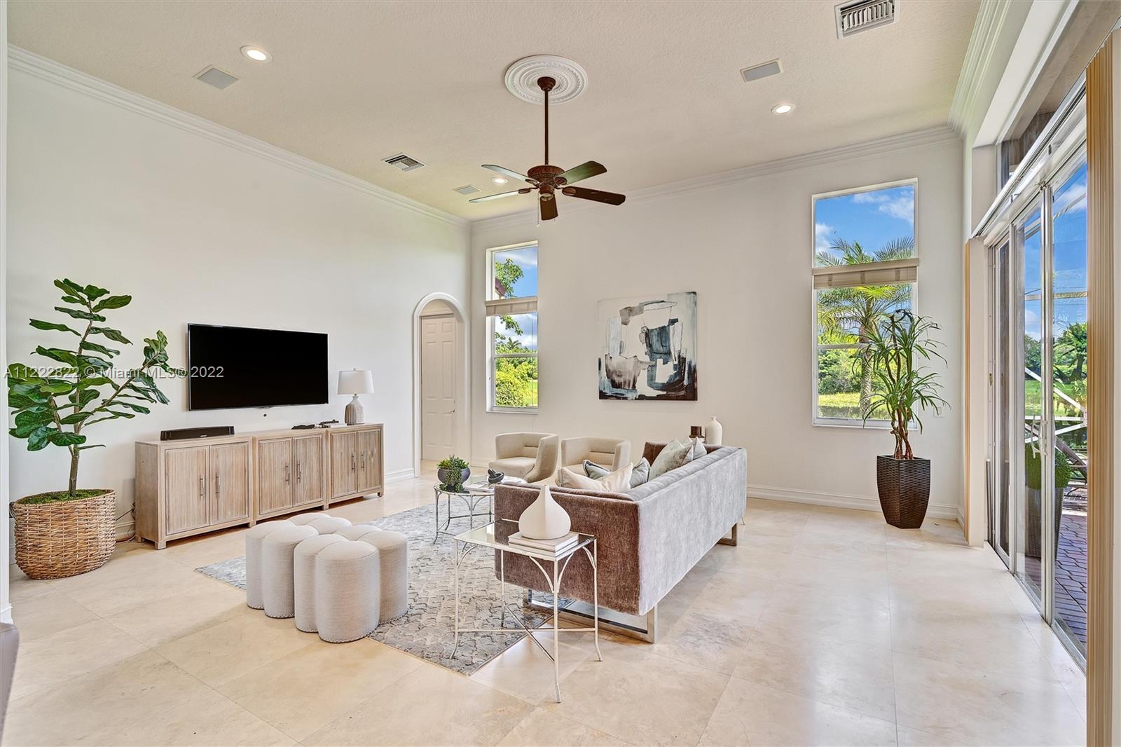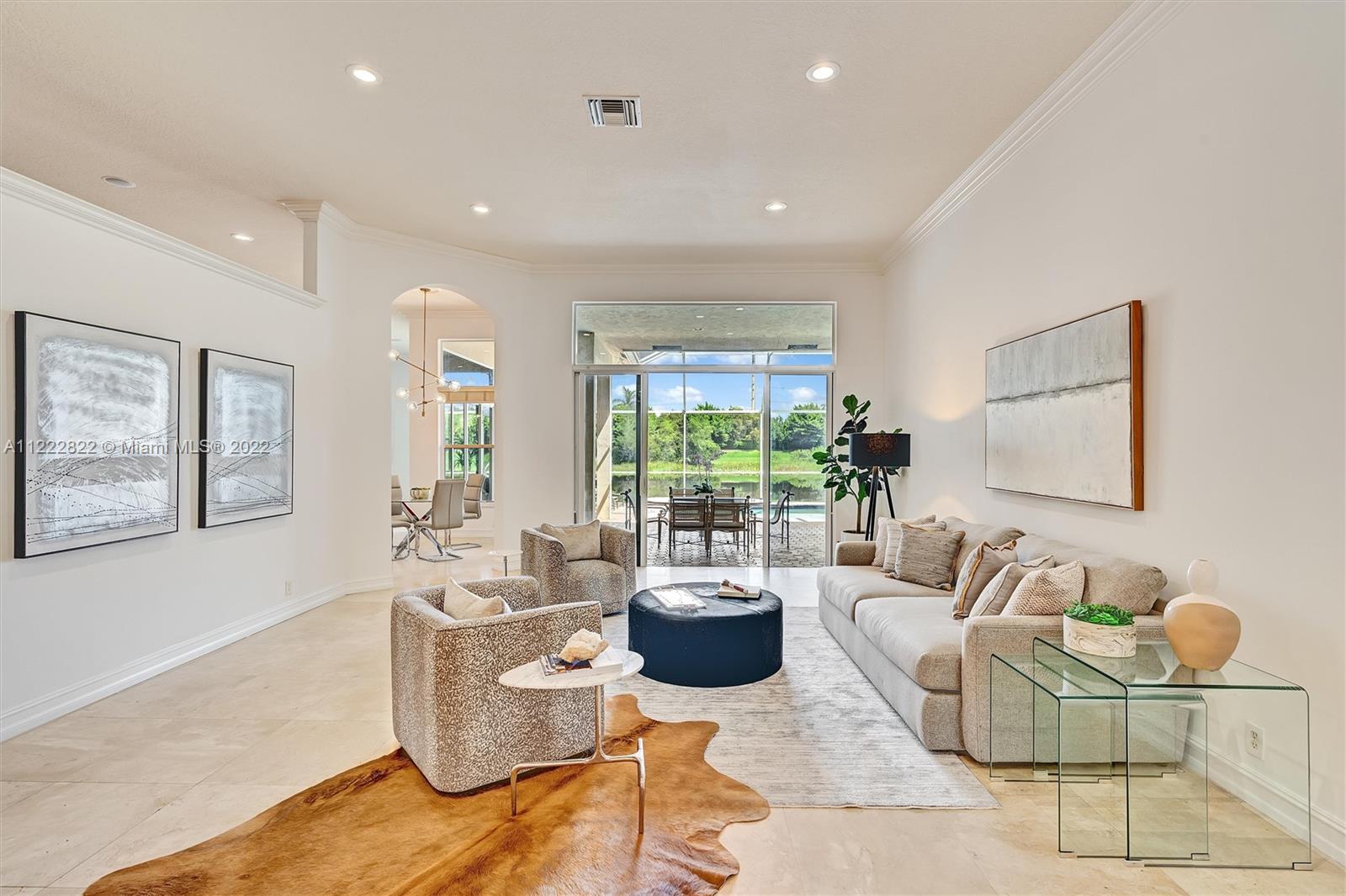 Gorgeous one-story lakefront home located in the prestigious golf gated community of Weston Hills Country Club. Open and spacious split floor plan featuring 5 bedrooms, 3.5 bathrooms and 3 CG with circular driveway. Volume ceilings, large living areas and open floor plan kitchen next to the family room, perfect for entertainment.The primary bedroom overlooks the lake and pool, while offering two custom walk-in closets and a spacious spa-like bathroom. Freshly painted interior with new LED lights and chandeliers. Newly designed modern landscaping. Marble flooring in main areas. Private outdoor, covered and screened patio overlooking the lake with a free-form pool. Perfect home for entertaining and enjoying South Florida living. Move in ready. Best schools in Florida.
