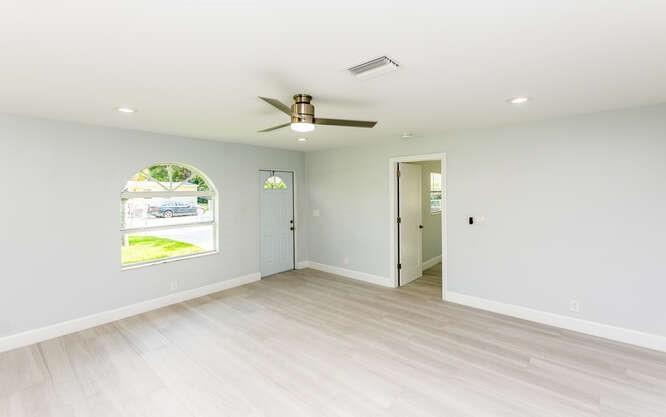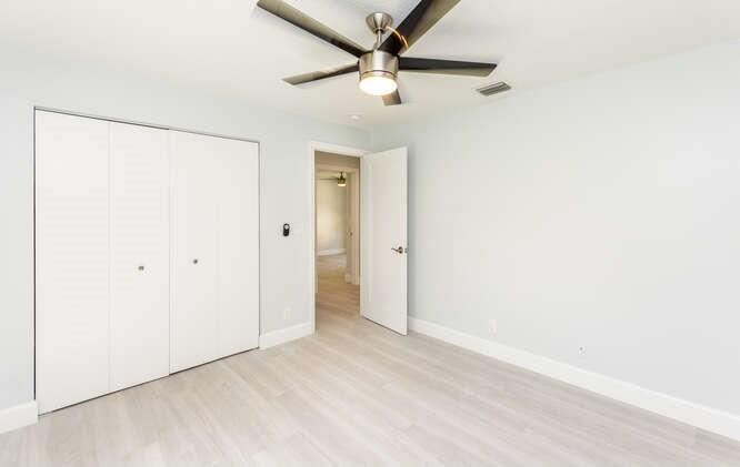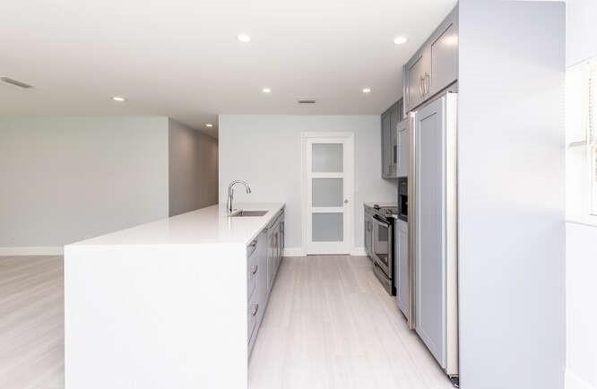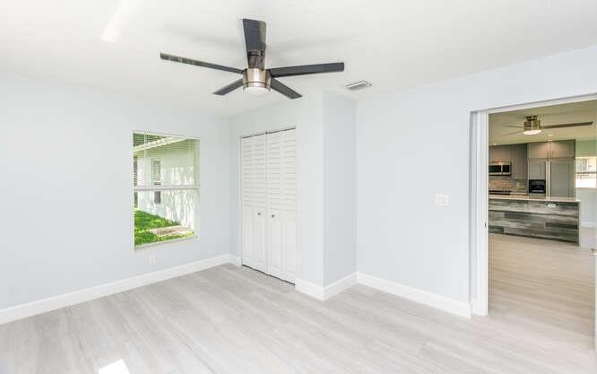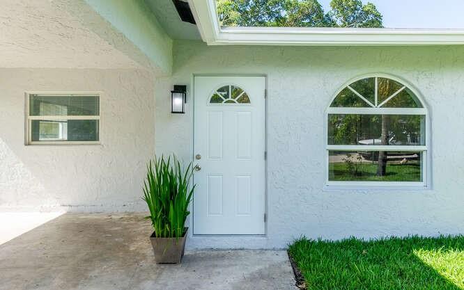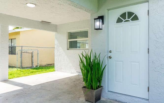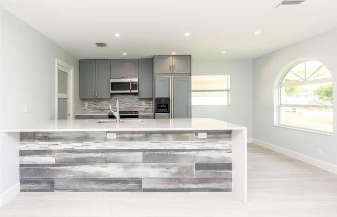 Move in ready!! 2.7 miles to beach.This home has been totally renovated from top to bottom with permits! 4/2 nice sized laundry room off new high-end kitchen. Hurricane Impact windows and doors throughout. Brand new roof! Landscaped with all new sod, new sprinkler system and new fence. Extra wide covered carport. New Smoke/Carbon Monoxide alarm. New fans in every room. All new air ducts with a 3.5 ton A/C. All cast iron pipes replaced. New grey rectified wood grain porcelain tile throughout. Open concept, all new kitchen with quartz waterfall countertops, undermount stainless sink, disposal, KitchenAid dishwasher and refrigerator with water/ice maker. Electric glass cooktop stove with convection oven. Grey, soft-close shaker style cabinetry including front panels on fridge and dishwasher.