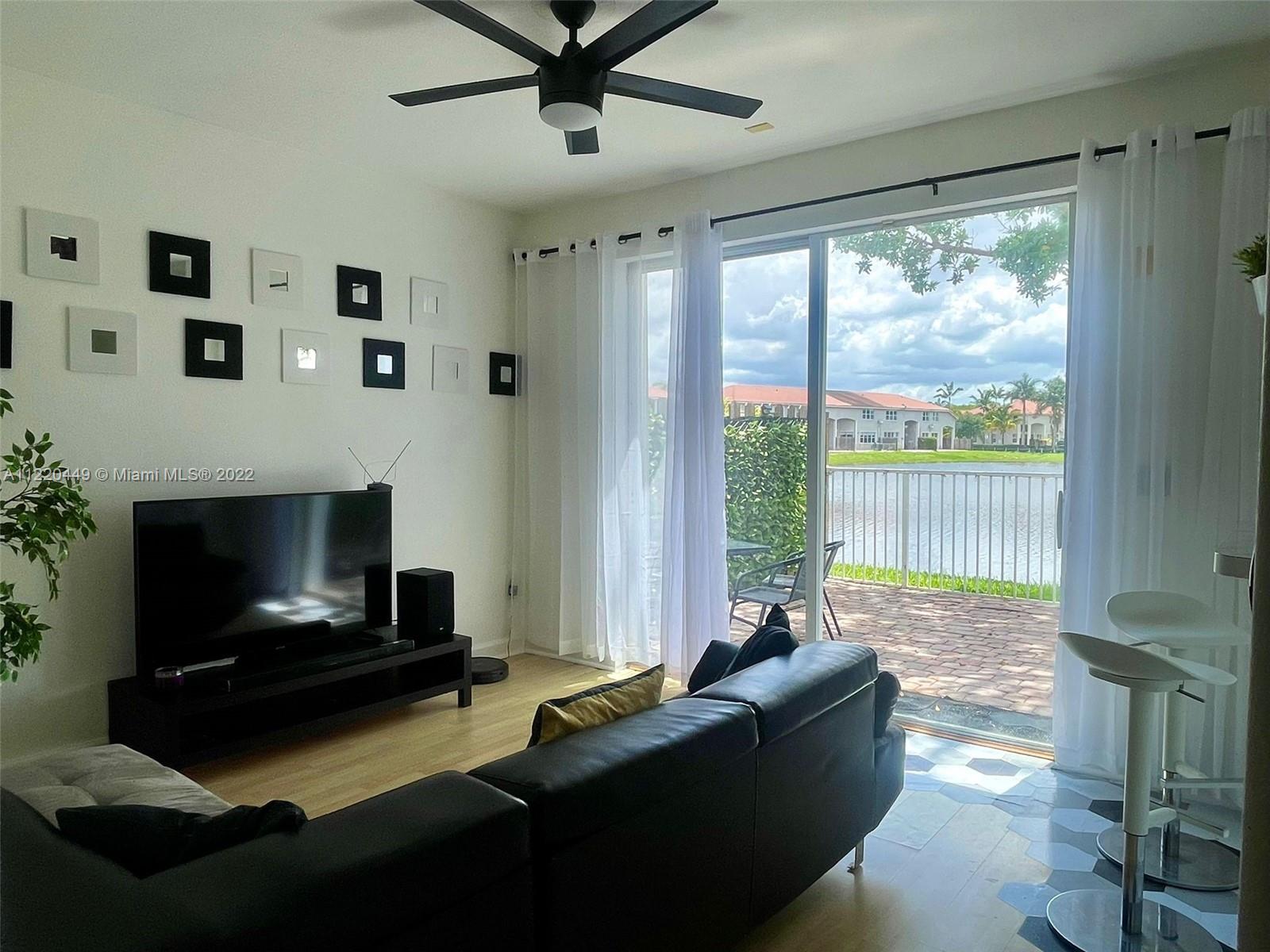 Spectacular sunrise view on the lake with this upgraded 2-story spacious townhouse features 3 bedrooms and 2.5 baths. All new upgraded European style bathrooms with glass door. Custom design walk-in closets. New light fixtures. Fairly new washer and dryer. One car garage converted to a play/ family room. Easily converted back. Private Community pool and children playground. Access to Island at Doral Club House. Close to highway, schools and shopping centers. Must see.