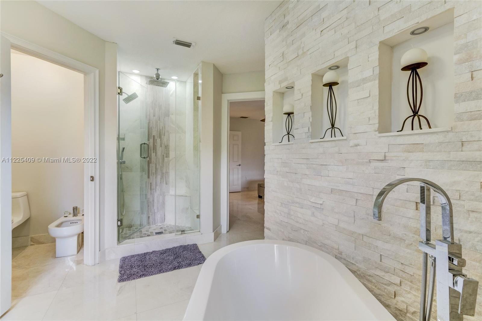 Modern Elegance in a Spacious Designer Home. This 5 bedroom 4 bath home is the largest model within this prestigious gated community. With its exceptional layout design, it offers several distinctive living areas. Tons of natural light and luxurious elements are seen throughout for all your living and entertaining needs. Outstanding upgrades in every room. Marble flooring, quartz staircases, granite counters, stone walls, soffits, recessed ceilings & niches, smart home features, among the many personalized accents. Too many to list. Located in a corner lot for a totally secluded tropical paradise which is ready for you to call HOME! Large open kitchen with eat in dining. One bedroom and full bathroom downstairs. 2 car garage. Don’t miss out on this amazing property!