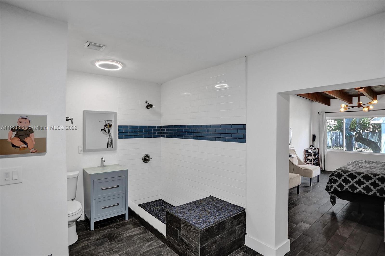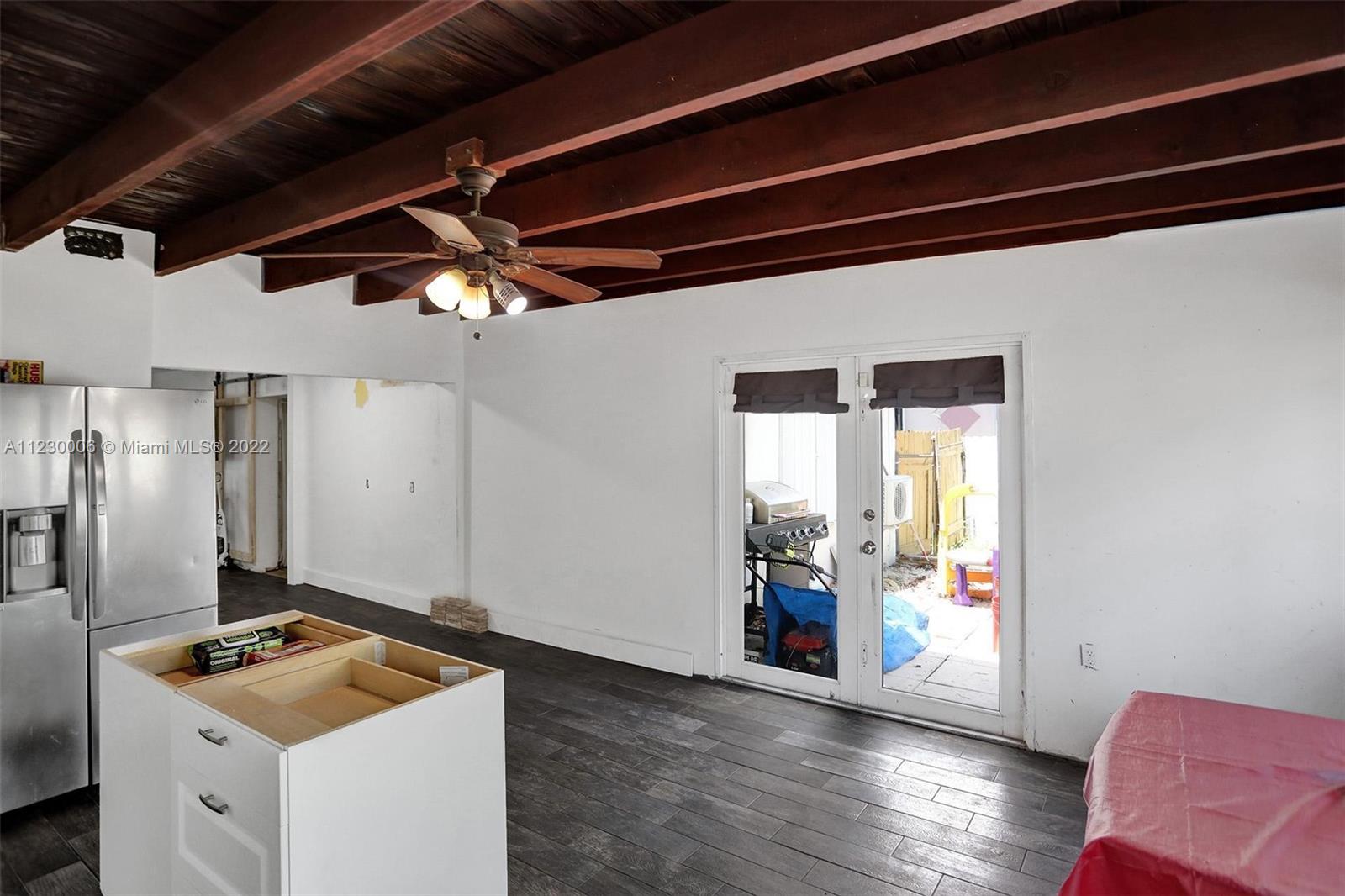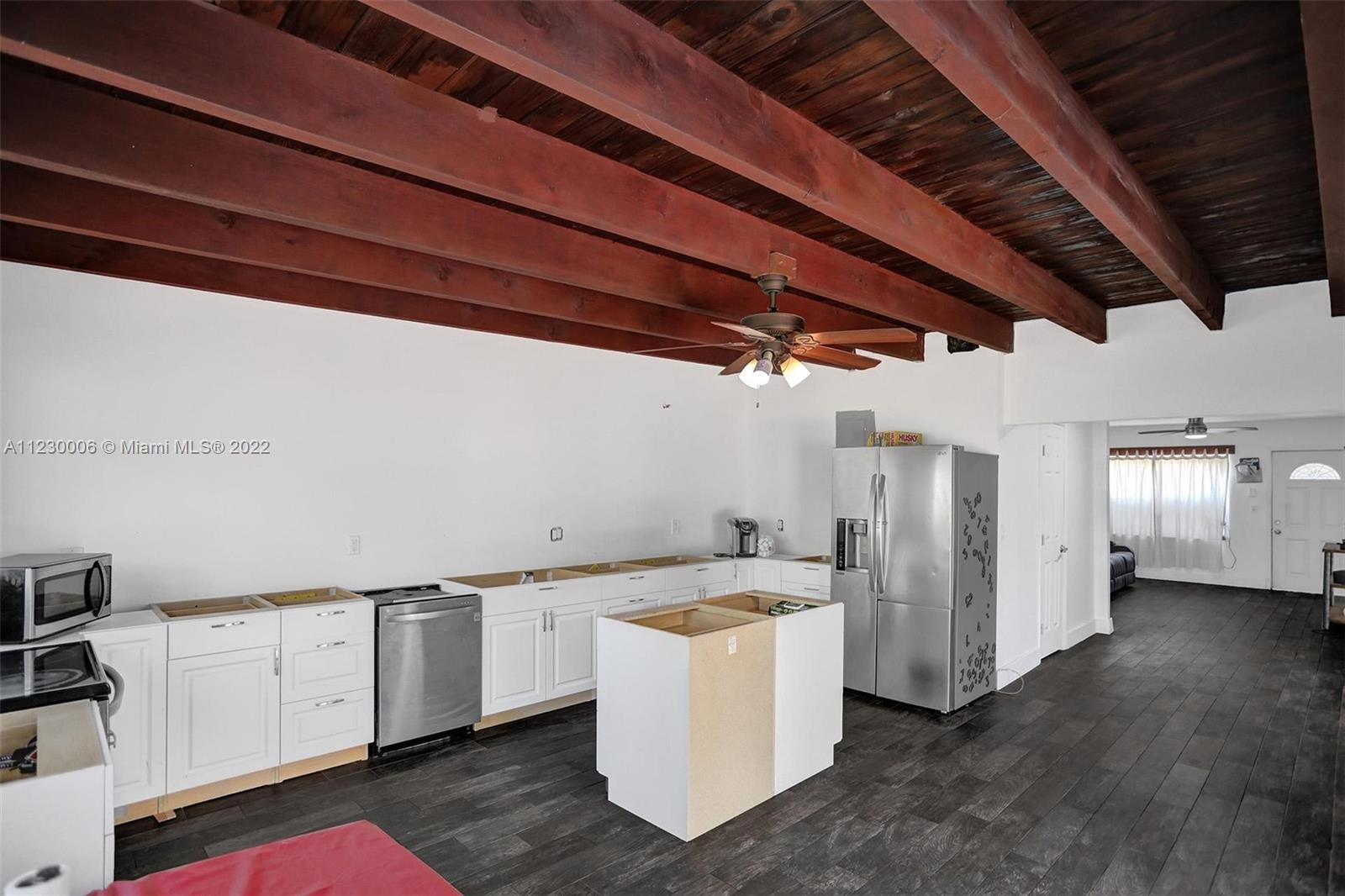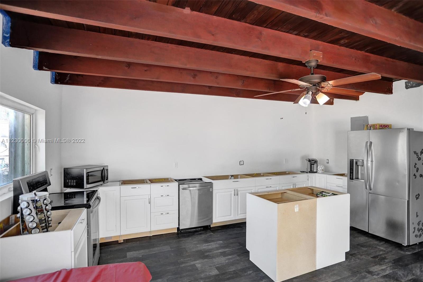 AMAZING opportunity! Beautiful home ready for your finishing touches: $20k could gain you an additional $30k+ in INSTANT EQUITY. NEW wood-like porcelain tile; MASSIVE kitchen featuring NEW cabinets, an island and farmhouse sink ready to install, gorgeous EXPOSED WOOD BEAMS, lots of windows. Primary bedroom features a huge WALK-IN CLOSET, brand NEW bathroom, exposed wood beams and large windows. Half-bath has plumbing in place to design to your taste. Third bedroom and second bathroom are split from the other two, allowing ease in creating a IN-LAWS SUITE. 1 CAR-GARAGE, large concrete SHED, large lot with ROOM FOR A POOL. Avocado trees, Mango, and more! Central location near Biscayne Boulevard, Enchanted Forest Park, minutes away from the beach, Bal Harbour Shops, Aventura and more!