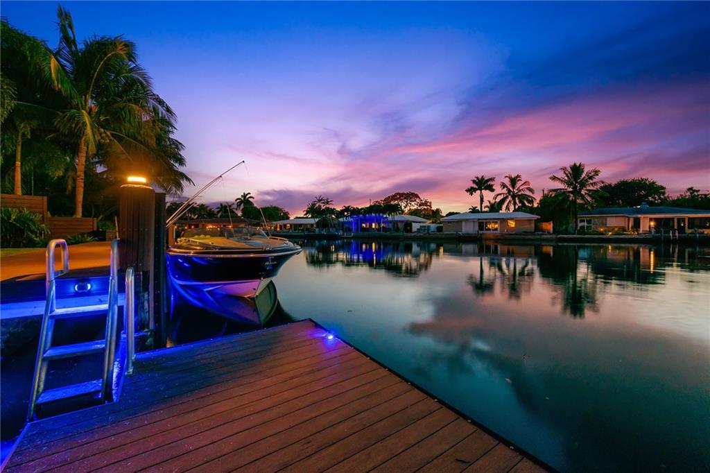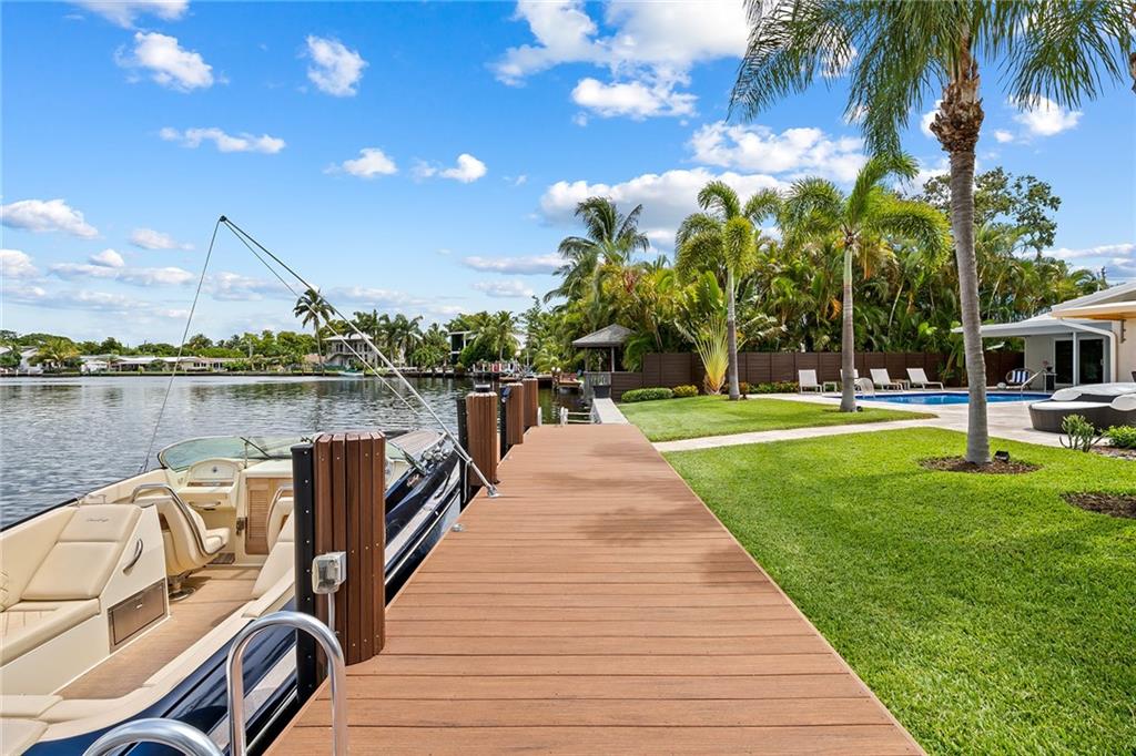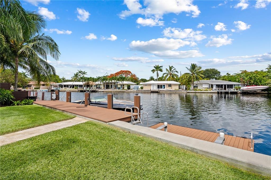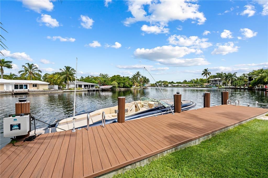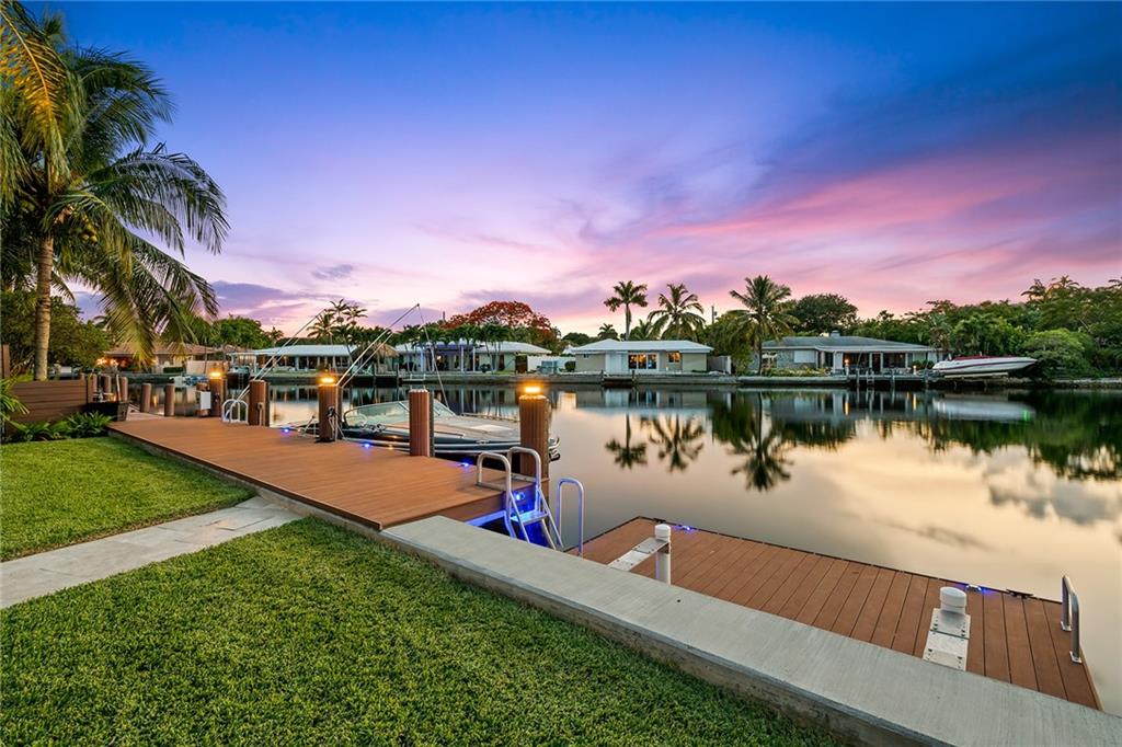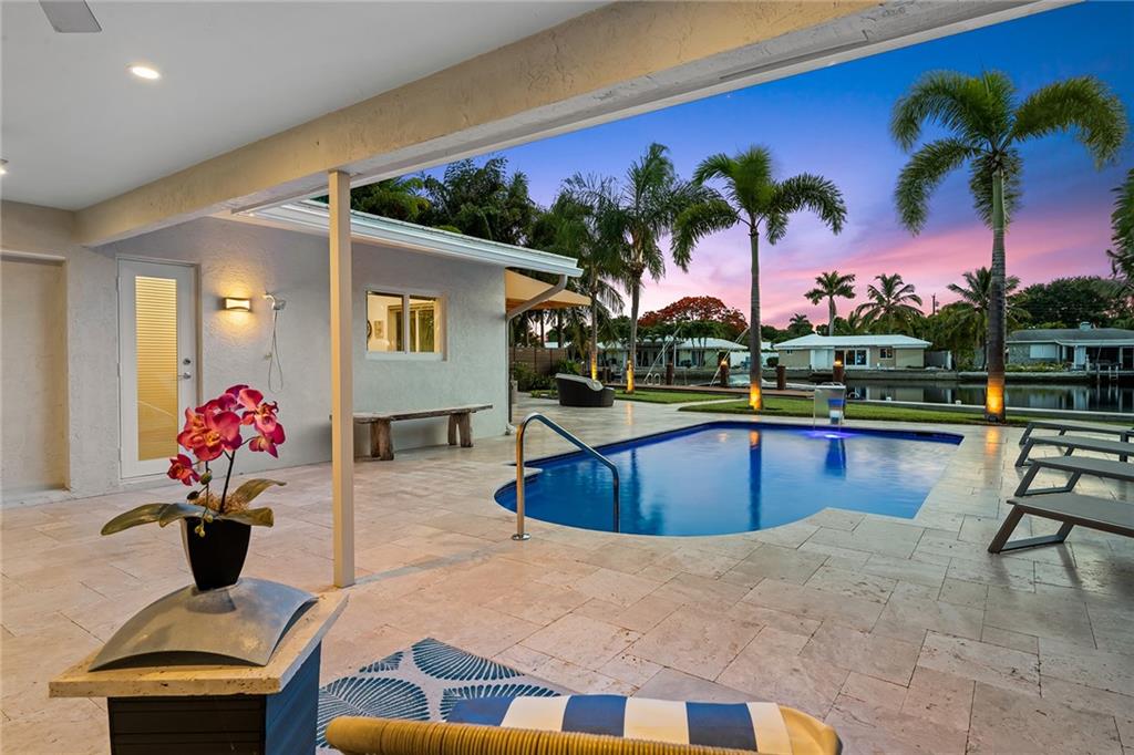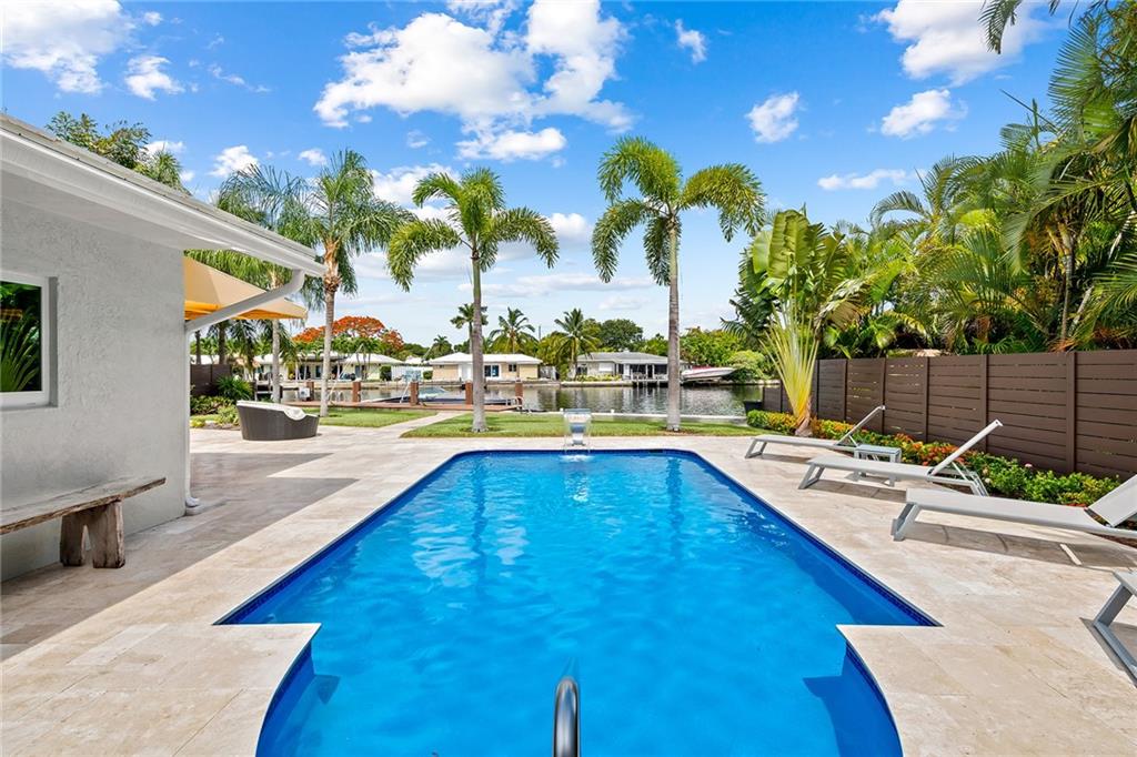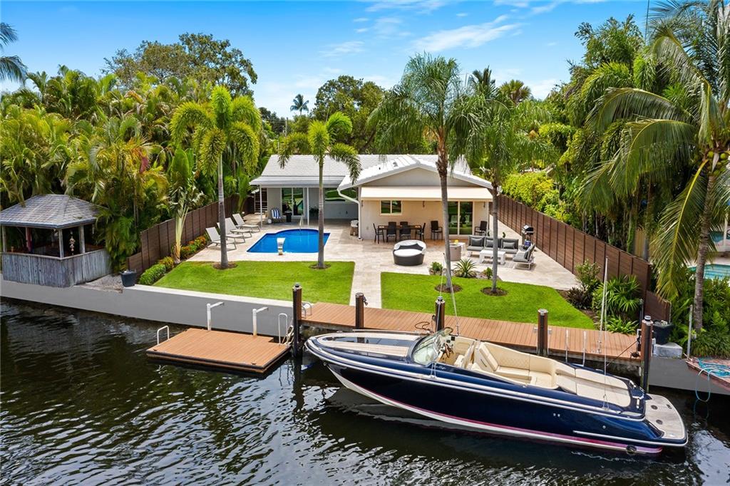 Improved Price! This is like a 5-star resort. Upgrades on the EXTERIOR and INTERIOR throughout and with an open checkbook. This is your home sweet home. Exteriors: Lush landscaping, new roof, 70ft water, wired/water B dock/floating dock, lighted waterfall pool, 1000+ ft terrazzo tiles, security camera fenced, w lock, impact windows/doors, RV/boat parking, grass-framed. Concrete. Interiors: CPoint E/car charging, double e garage, washer/dryer/sink combo, large open entry, L.R. D.R./ Bertazzoni induction range, marbled quartz ctops/and bar (4) office, pocket glass doors, fully open to exterior, 1522sf under air, 3 full bdrms, designer closets, walk in at MBDRM, en-suite hi end bath/guest bath. Jacuzzi tub, designer fixtures, full HVAC, heat + heated pool. Close to: Wilton, Beach, Las Olas.