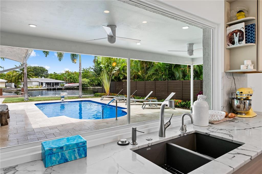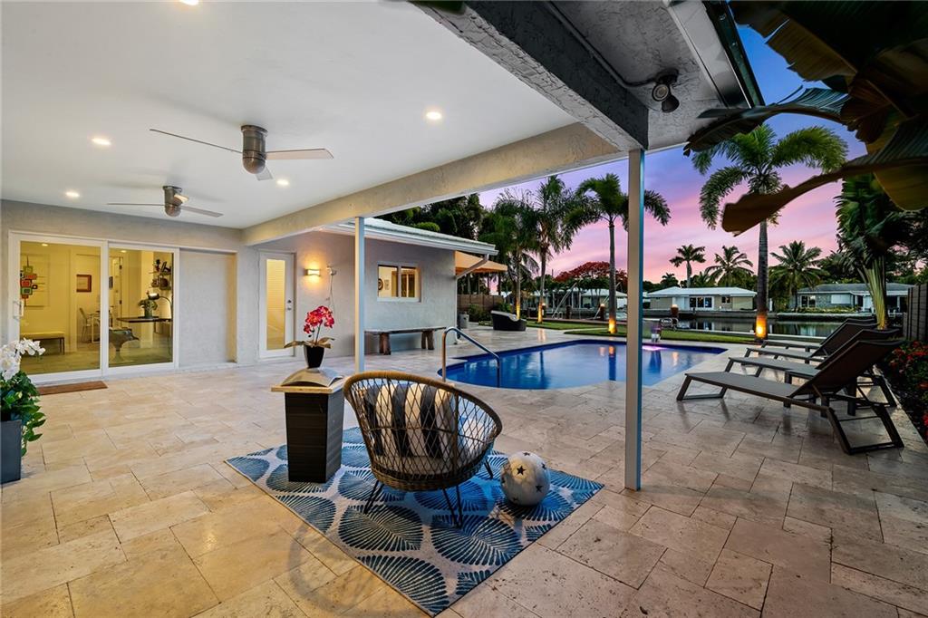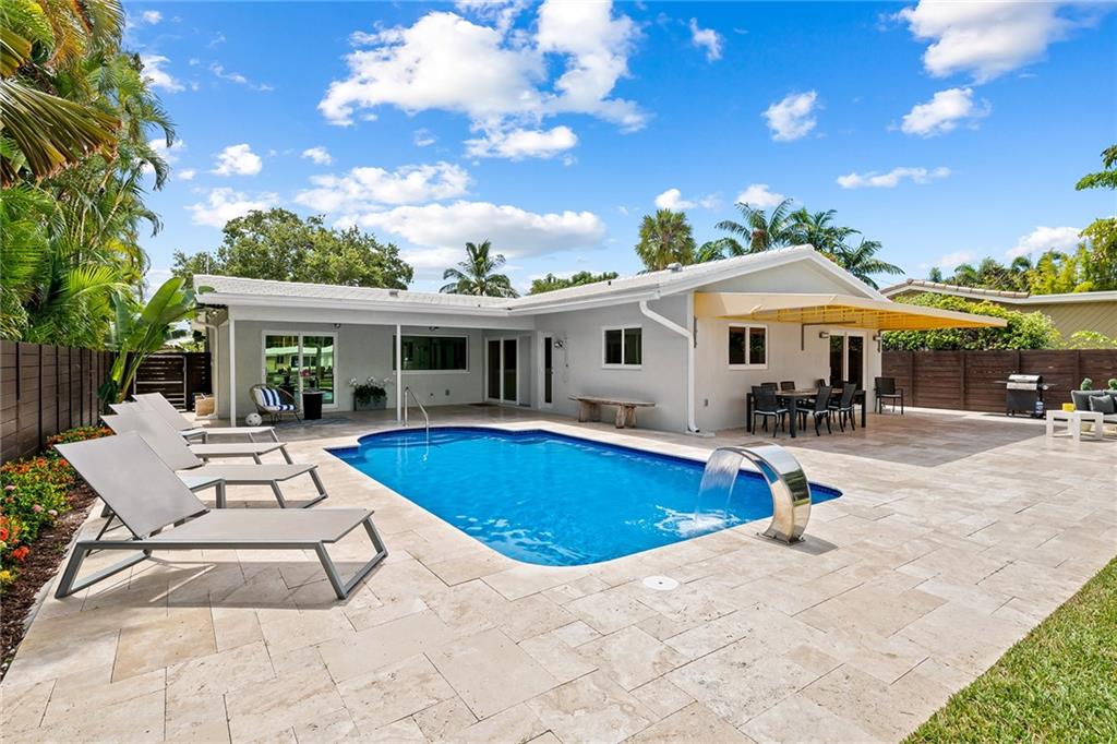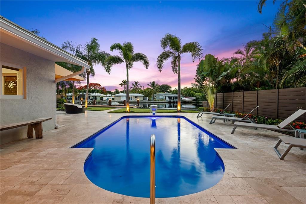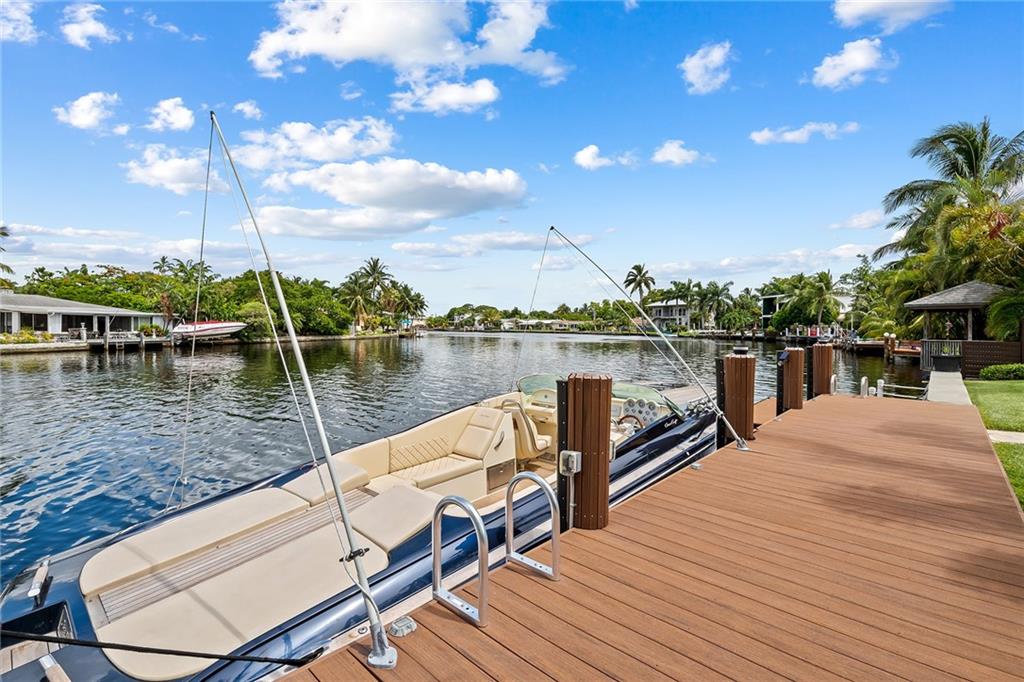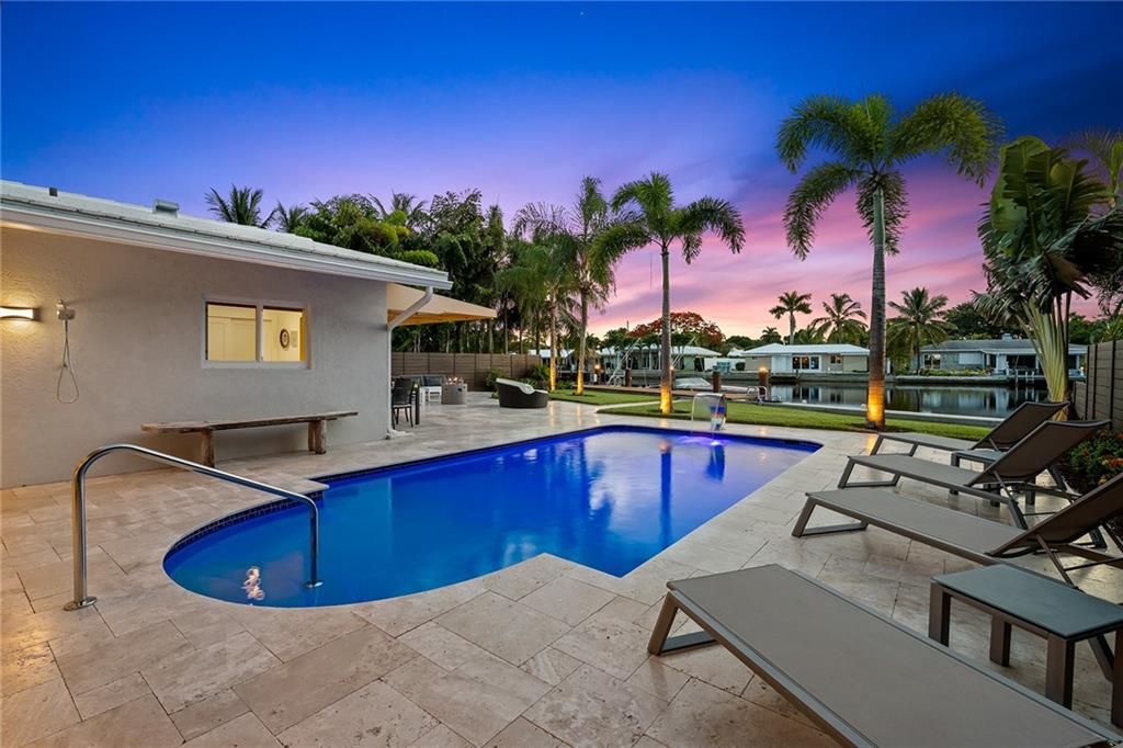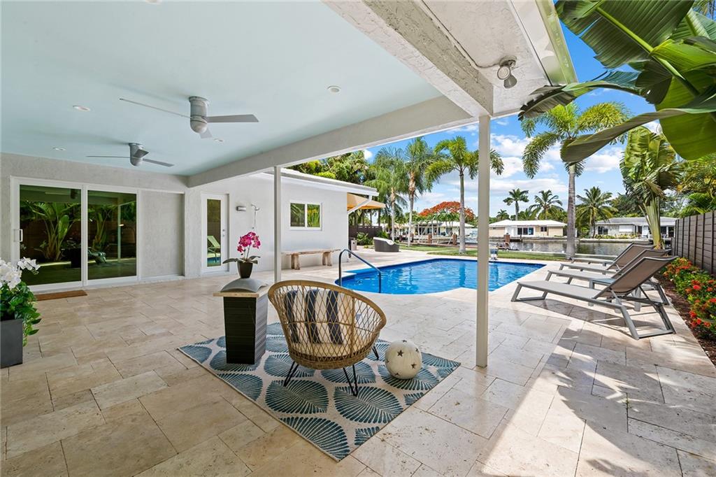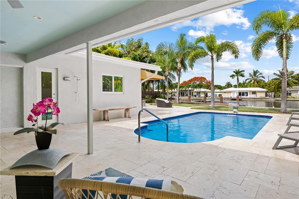 Improved Price! This is like a 5-star resort. Upgrades on the EXTERIOR and INTERIOR throughout and with an open checkbook. This is your home sweet home. Exteriors: Lush landscaping, new roof, 70ft water, wired/water B dock/floating dock, lighted waterfall pool, 1000+ ft terrazzo tiles, security camera fenced, w lock, impact windows/doors, RV/boat parking, grass-framed. Concrete. Interiors: CPoint E/car charging, double e garage, washer/dryer/sink combo, large open entry, L.R. D.R./ Bertazzoni induction range, marbled quartz ctops/and bar (4) office, pocket glass doors, fully open to exterior, 1522sf under air, 3 full bdrms, designer closets, walk in at MBDRM, en-suite hi end bath/guest bath. Jacuzzi tub, designer fixtures, full HVAC, heat + heated pool. Close to: Wilton, Beach, Las Olas.
