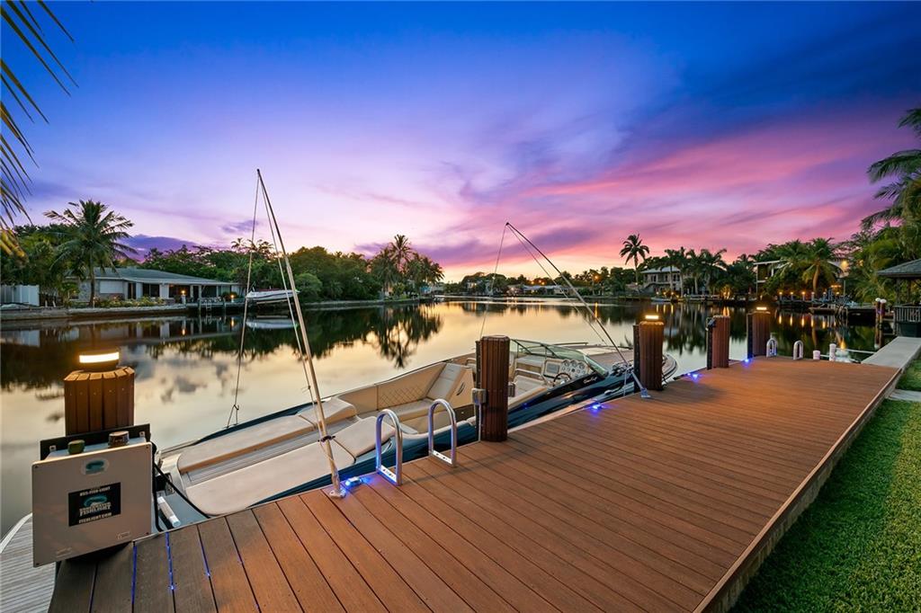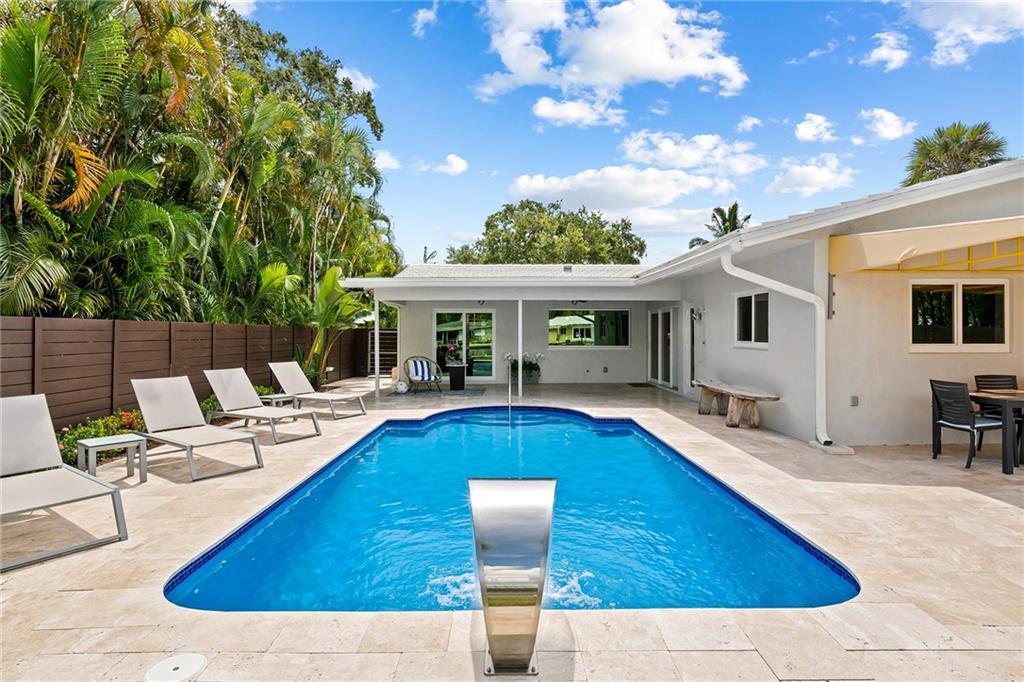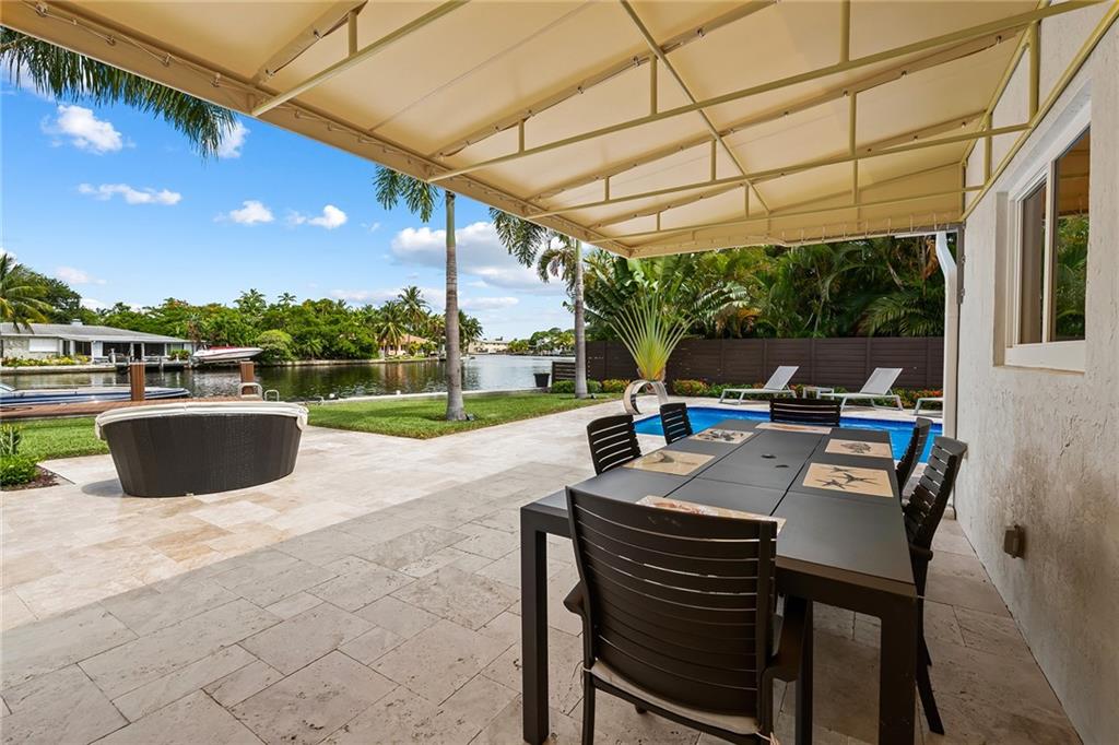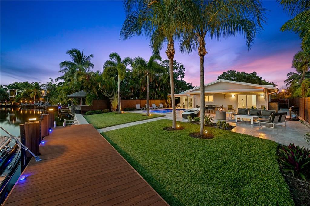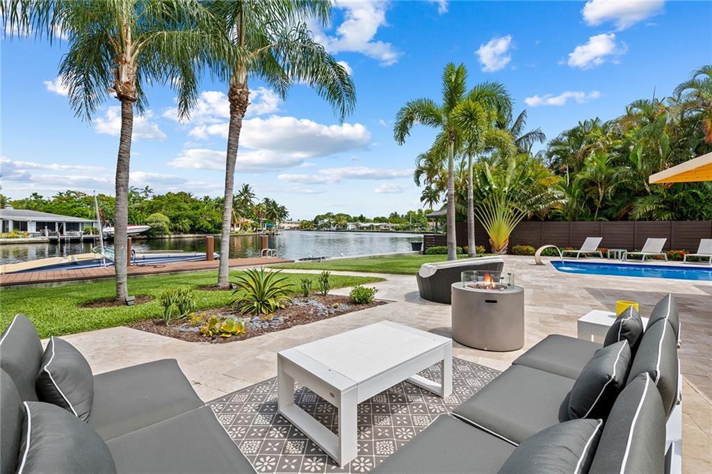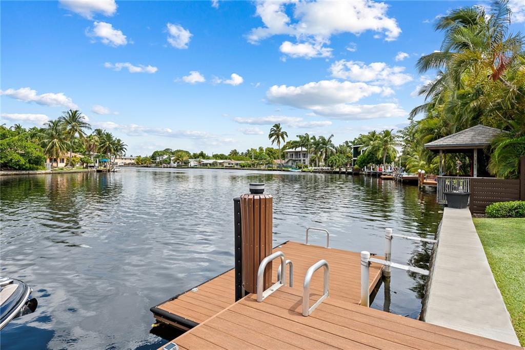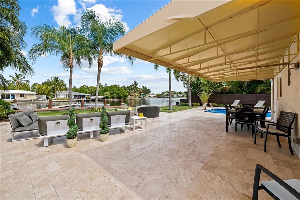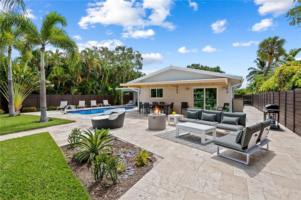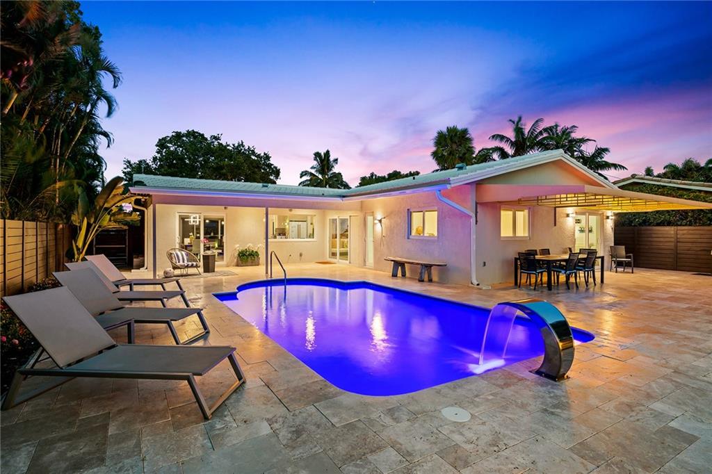Improved Price! This is like a 5-star resort. Upgrades on the EXTERIOR and INTERIOR throughout and with an open checkbook. This is your home sweet home. Exteriors: Lush landscaping, new roof, 70ft water, wired/water B dock/floating dock, lighted waterfall pool, 1000+ ft terrazzo tiles, security camera fenced, w lock, impact windows/doors, RV/boat parking, grass-framed. Concrete. Interiors: CPoint E/car charging, double e garage, washer/dryer/sink combo, large open entry, L.R. D.R./ Bertazzoni induction range, marbled quartz ctops/and bar (4) office, pocket glass doors, fully open to exterior, 1522sf under air, 3 full bdrms, designer closets, walk in at MBDRM, en-suite hi end bath/guest bath. Jacuzzi tub, designer fixtures, full HVAC, heat + heated pool. Close to: Wilton, Beach, Las Olas.