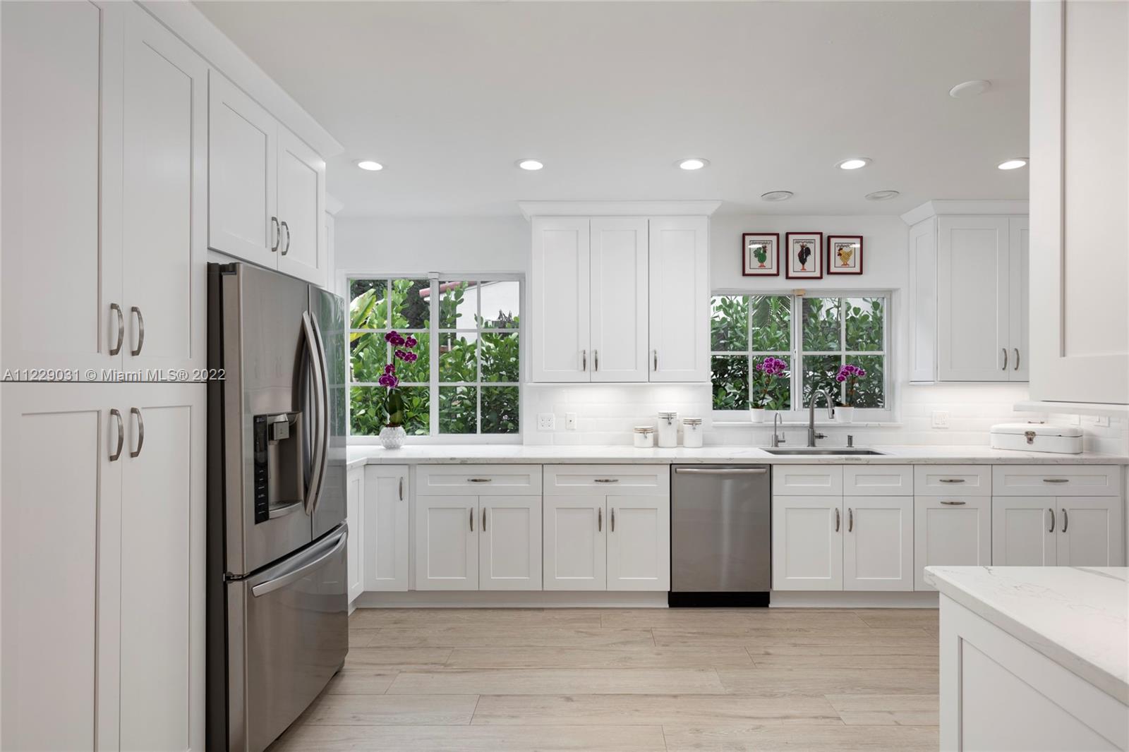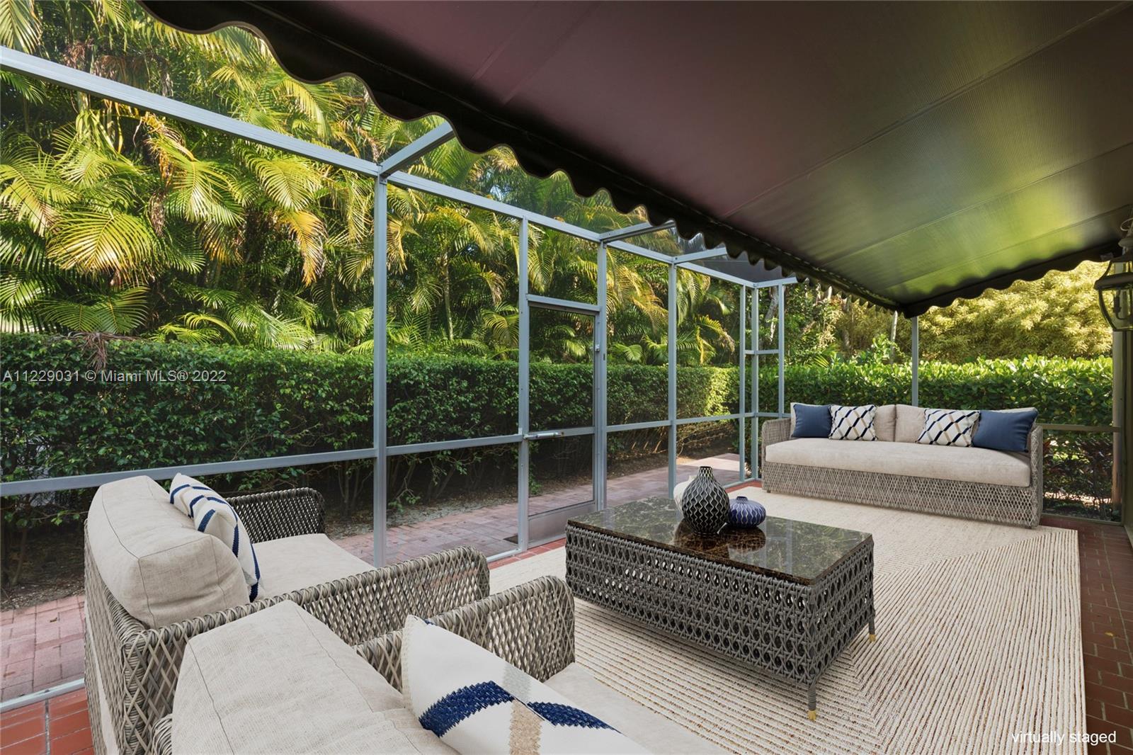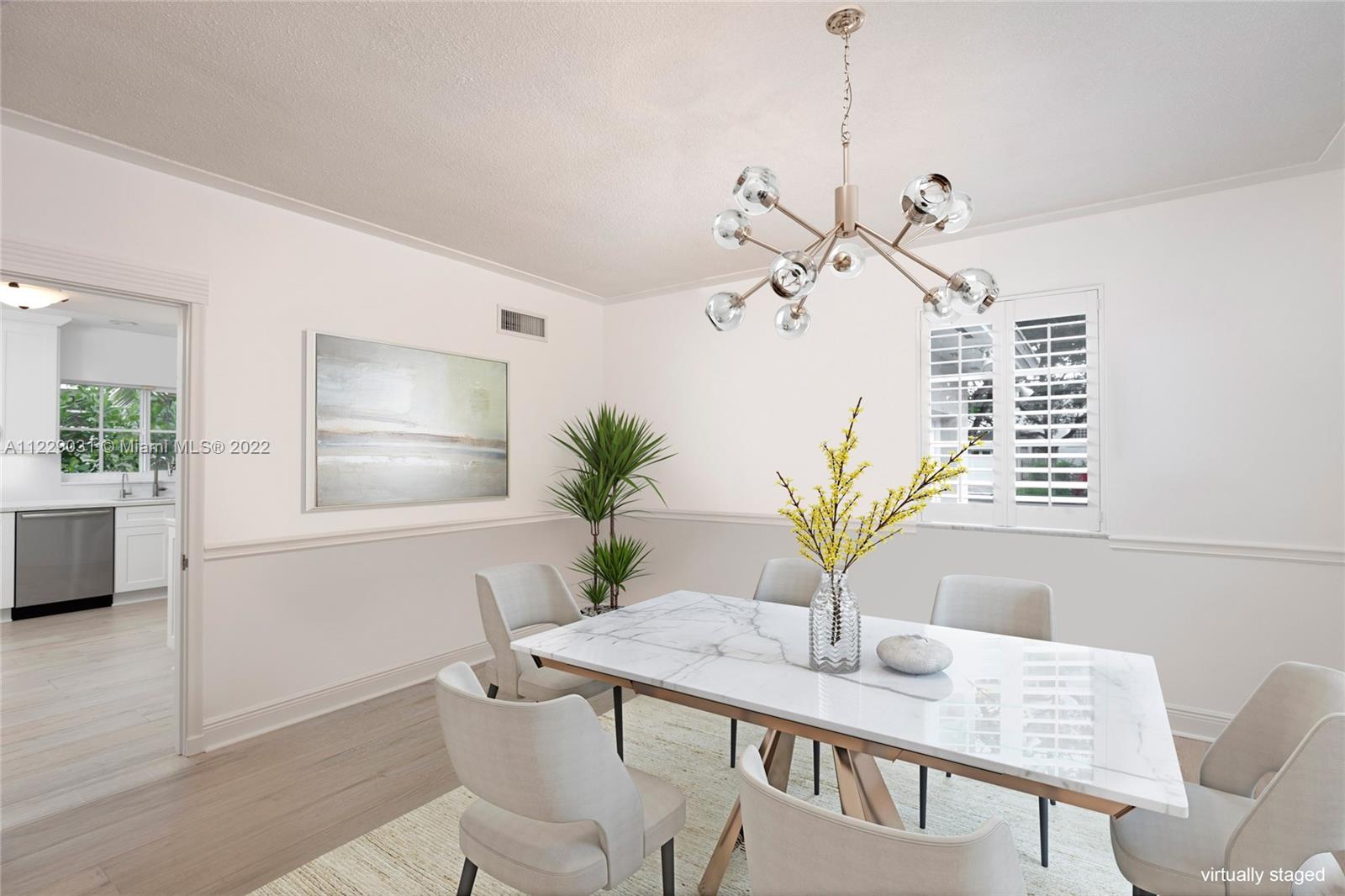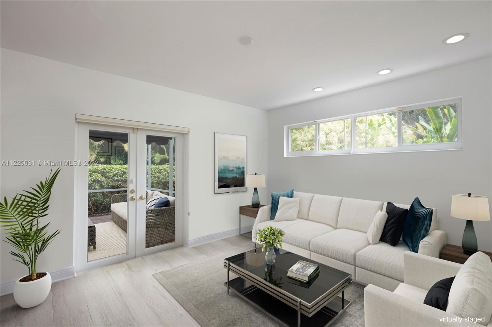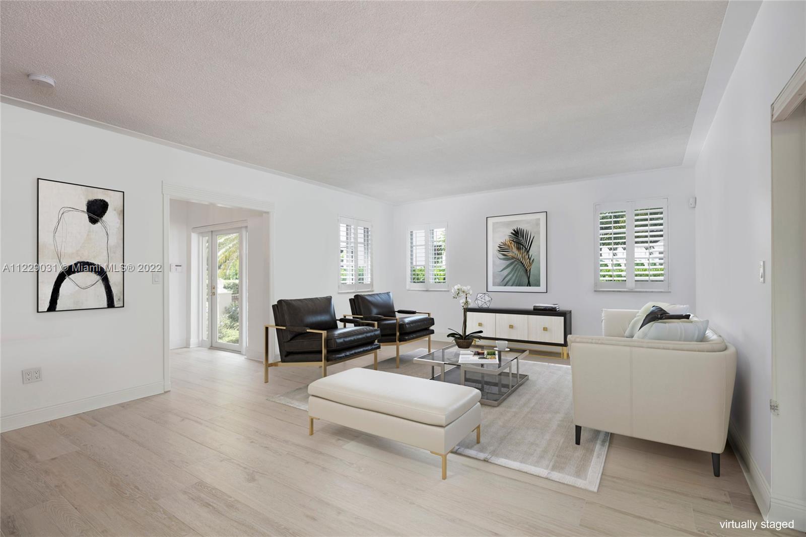 A special opportunity to live in the desirable South Gables on a tree-lined street within the Sunset Elementary school zone. Step through a charming, walled courtyard into this warm and completely renovated home. Downstairs offers a foyer entry, well-appointed kitchen, formal dining room, bedroom or den with adjacent full bath, and living room with French doors to the covered terrace and private garden. Upstairs are three generously sized bedrooms with the primary suite featuring two walk-in closets and renovated bathroom. Wood-look porcelain floors, plantation shutters, fresh white paint, and neutral finishes make this home the perfect canvas for your design. New roof, electrical, plumbing and septic tank. All impact windows and doors. **Some photos virtually staged.