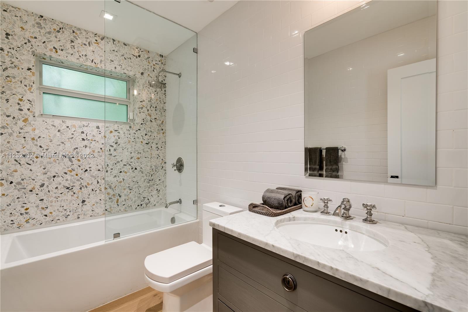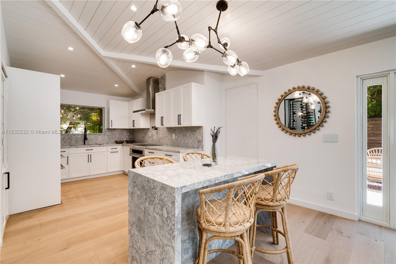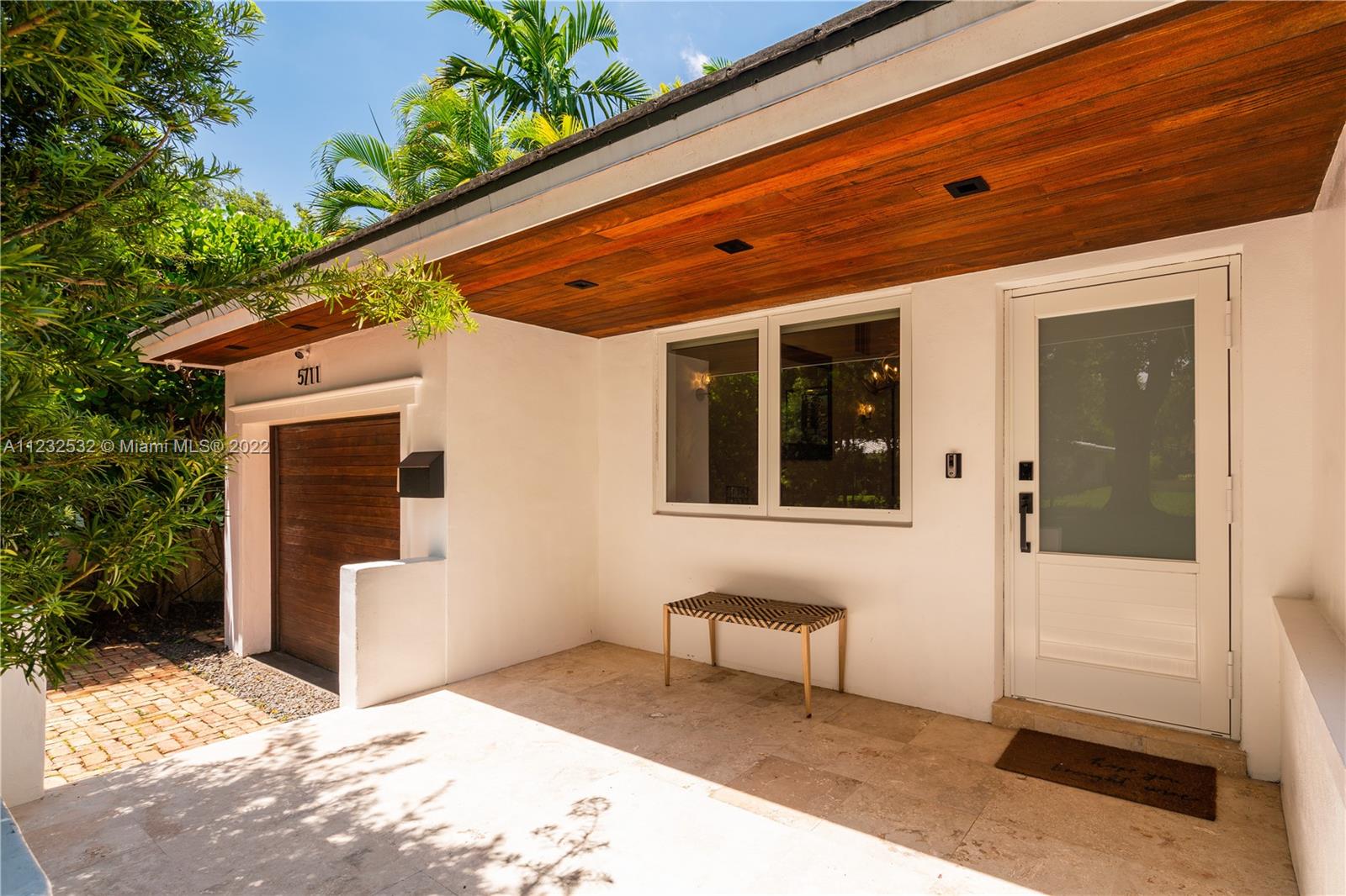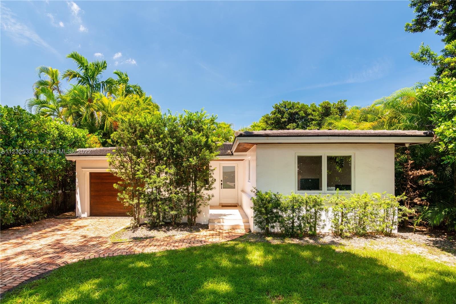 Hidden Treasure in Coral Gables! Completely renovated in 2021, this 3 bedroom, 2 bathroom home rests on quiet Michelangelo Street. Welcomed by lush landscaping, and brick driveway leading into 1-car garage. Spacious formal dining area, eat-in kitchen with custom quartzite countertops, and glass-enclosed wine bottle storage highlights the main living areas. Vaulted tongue and groove ceilings, hardwood flooring throughout the bedrooms, and sleek-modern designed master bath with dual sinks. Cumaru hardwood fence encompasses the backyard with outdoor shower, pool, polished concrete deck and artificial turf.