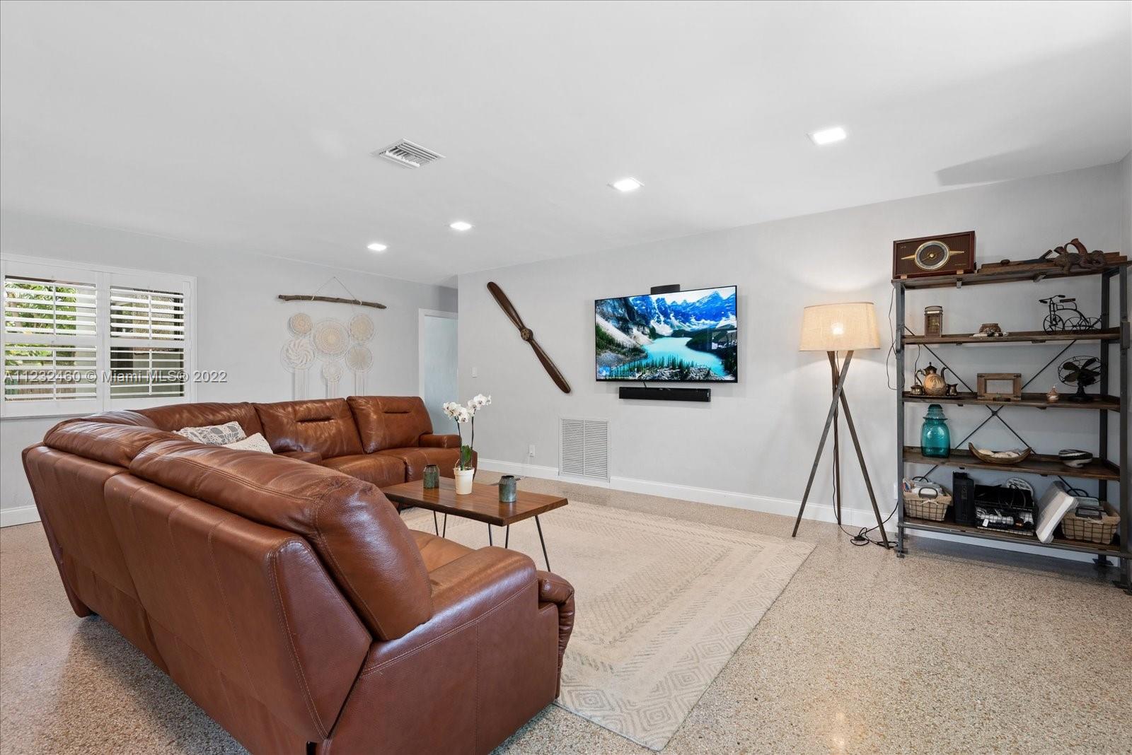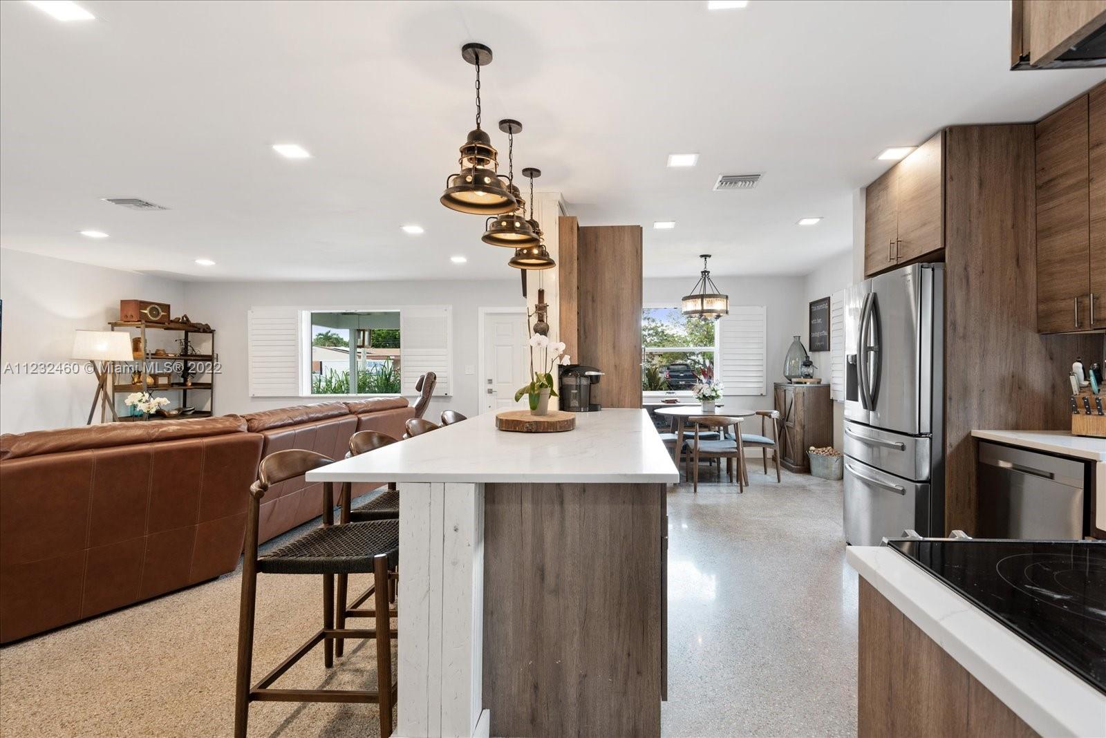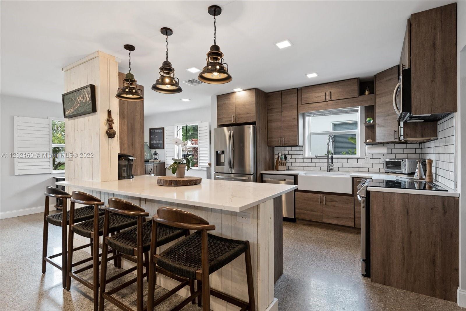 Enjoy living in Paradise! This 3/2 is beautifully renovated. The open kitchen has granite countertops, double farmhouse sink, SS 4 door refrigerator, dishwasher, microwave & smart range The spacious breakfast counter has ample seating. The living room is bright & airy with lots of natural sunlight. The home has terrazzo floors, impact windows throughout, plantation shutters, lutron dimmers, LED ceiling lights, tankless water heater, Newer A/C (1 year new), Samsung Washer & Dryer (1 year new) & a double insulated attic. The front yard’s tropical landscaping & cozy front porch compliment the home’s curb appeal. The backyard has a butterfly garden, fire pit, large patio, fruit trees, exterior lighting, kid's play fort, carport with electric sliding gate, fence & parking for boat or RV.