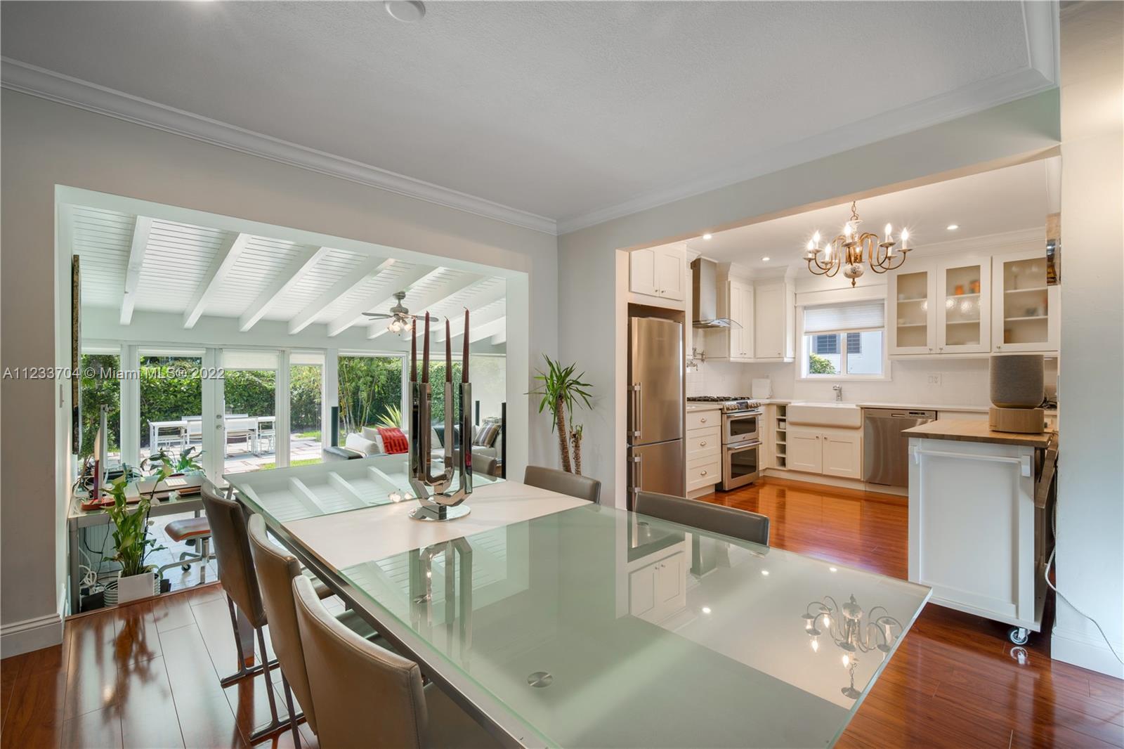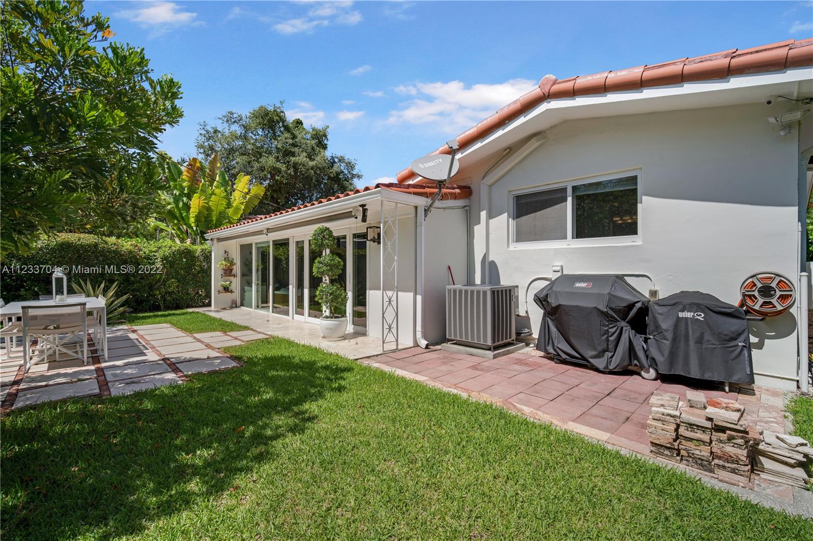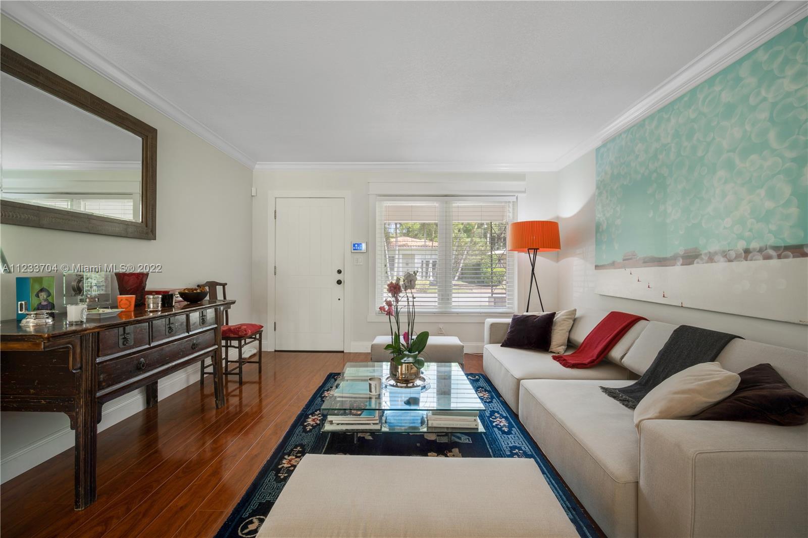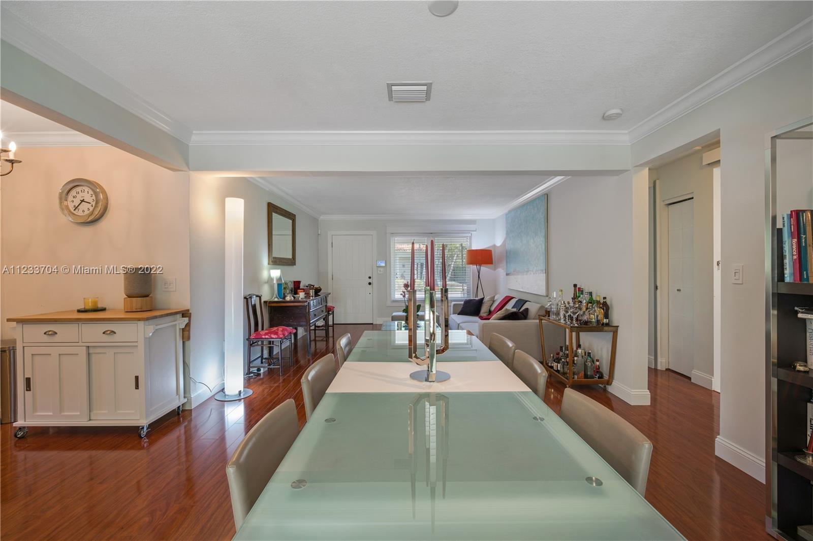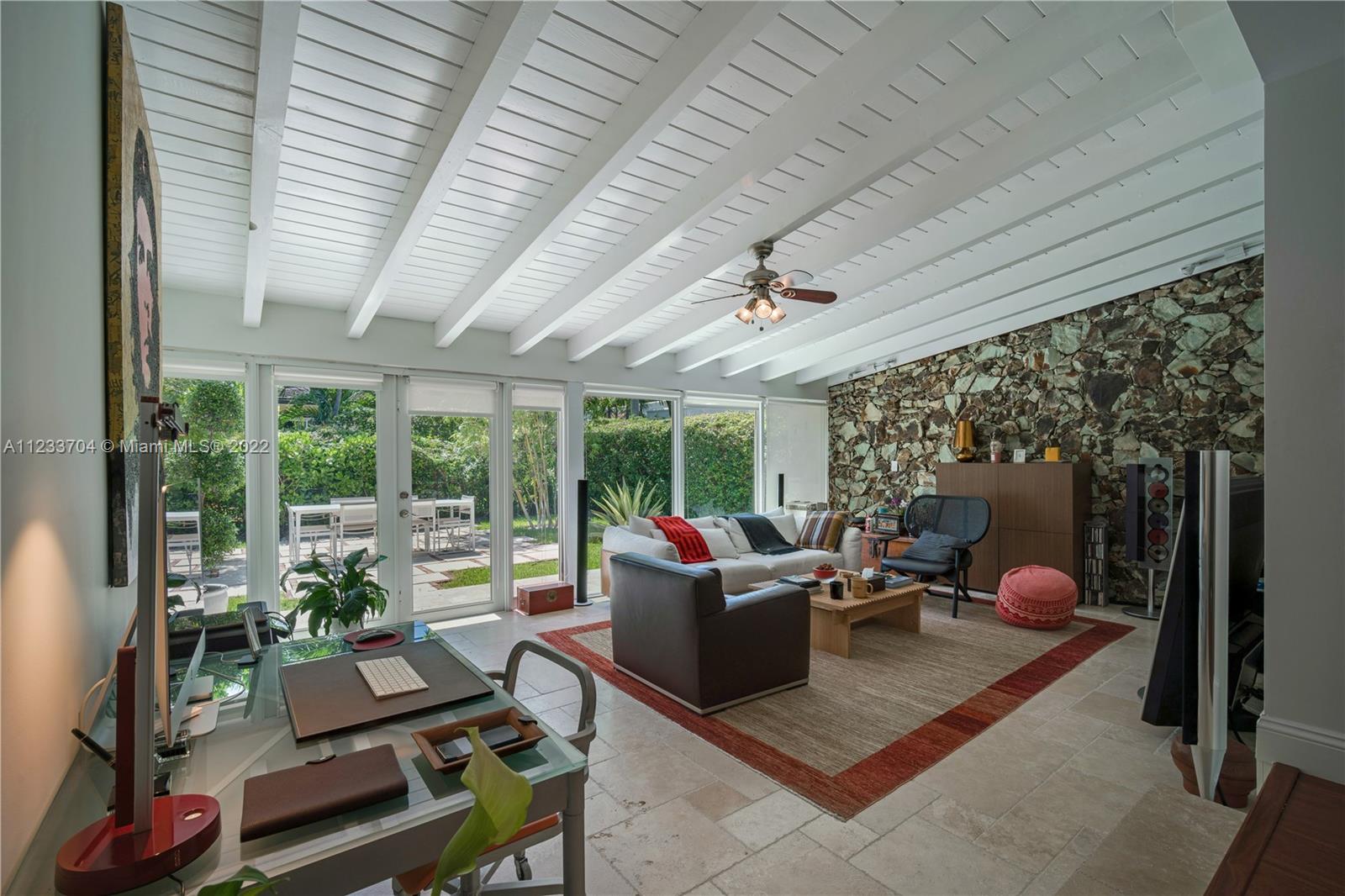 Gorgeous 2 bed, 2 full bath house located in North Coral Gables has been completely remodeled w/ the most exquisite touches. The kitchen comes equipped w/ stainless steel appliances. Elegant wood floor flows throughout the main living areas & bedrooms. The stone patio creates an elegant addition & requires very low maintenance since it is designed w/ fewer grassy areas to care for. Some other great features of this home are the hurricane impact windows, alarm, security camera & a 1 car garage, a true Florida Room ideal for entertaining.