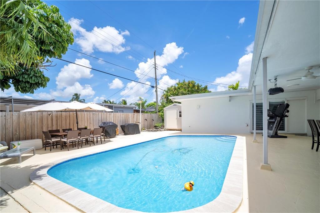 Stunning, completely renovated corner lot pool home with major curb appeal. Home boasts an expansive new modern concrete driveway with AstroTurf, modern stone exterior, new luxury double impact door. Split floor plan with 3 bedrooms 2 bathrooms and bonus room that can be used as in-law suite or extra bedroom. Enclosed and open modern lanai entry. New roof. New AC. New PVC plumbing. New impact windows. New shed. New pool 2 years old with LED changing lights. Solar lights and patio lights. Natural gas stove, water heater and dryer. 2 main splits. Energy efficient with low FPL bill. New indoor laundry with built-ins, Maytag stackable front load washer/dryer. New modern tile throughout. New bathrooms. sliding barn doors and bifold doors. Rain shower. Zebra shades. Stainless steel appliances.