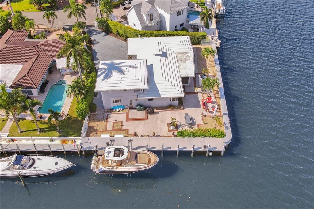 This amazing point lot has over 200 feet of waterfront with 100+ on the intracoastal. Brand new seawall upgraded to existing standards surrounds the property and includes a 27,000 pound boatlift. Existing Three bedroom, 4 bath home is lovely with a mid century design and gorgeous Ketchum/Cuban tile floors, recently updated with fresh paint and modern lighting. Completely renovated guest suite includes one bedroom /one bath above the garage, two bedrooms and two baths in the existing house. Ready for your custom designed home or live in the existing charming home. Amazing views, amazing potential!