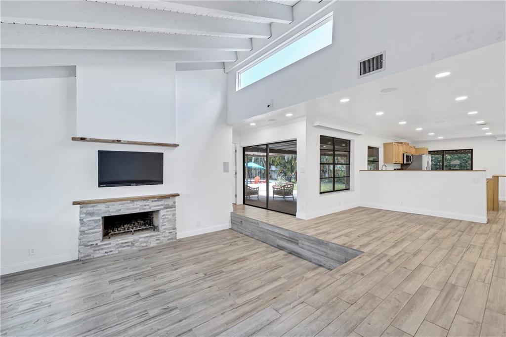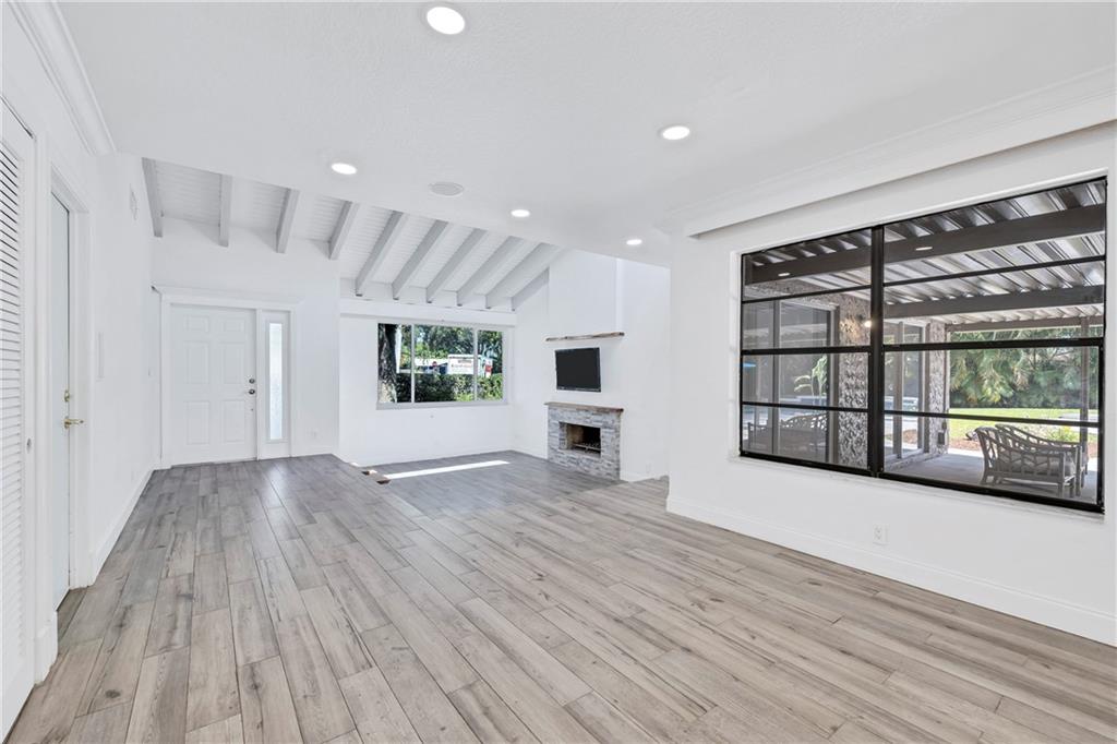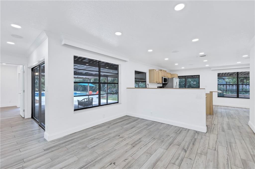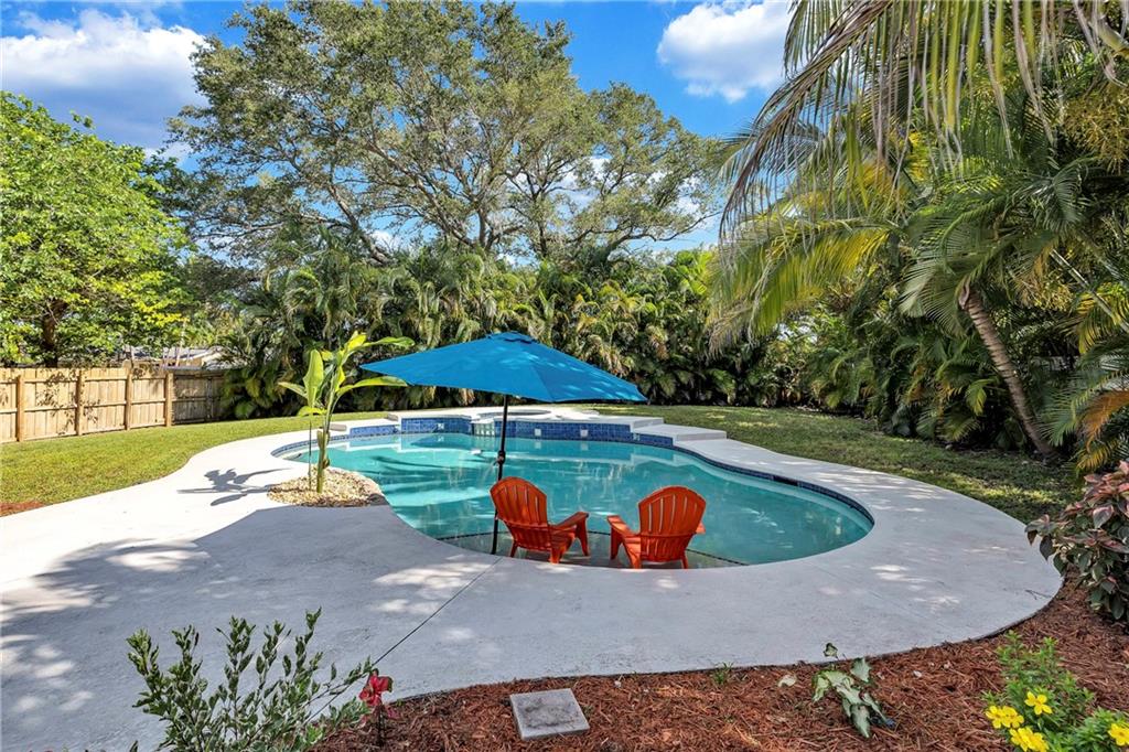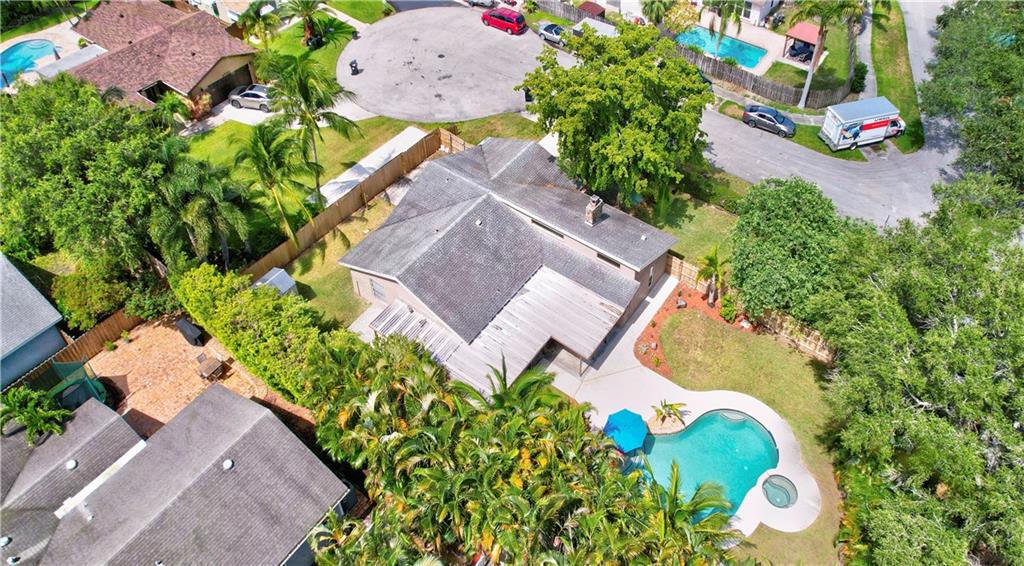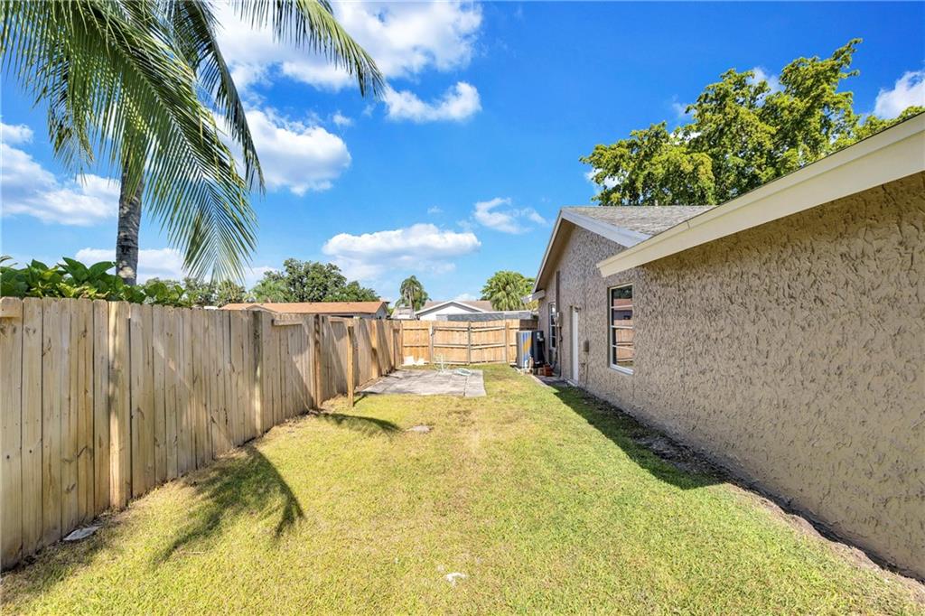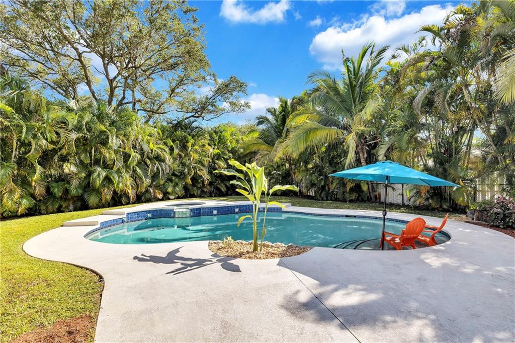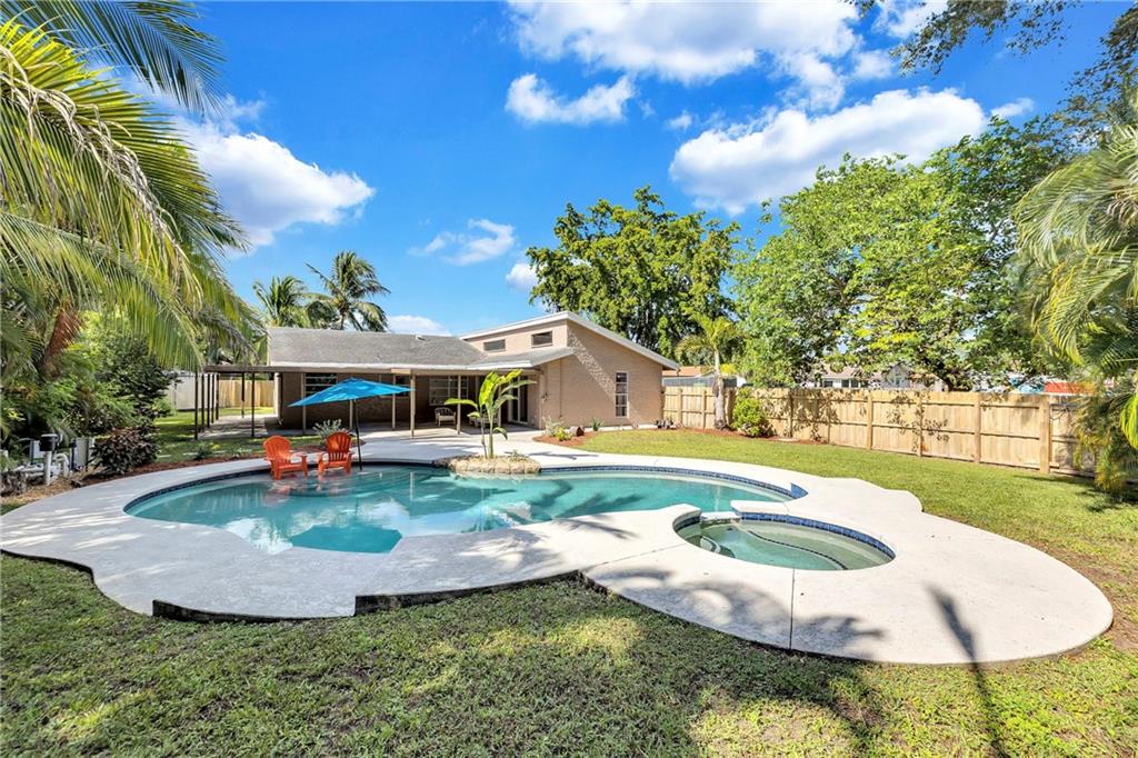 Sitting proudly on an oversized lot, right on the corner of a cul-de-sac, this stunning home is located in the sought after community of Palm Aire Gardens. This unique 3/2 home offers a spacious living area with large windows many upgrades throughout the home making it perfect for entertaining guests. The sunken living room with beautiful fireplace & custom stone wall will be the center of attention for your friends & family. Updates include new tile throughout the primary & main living area, spacious kitchen w/ island, new landscaping & much more! A clean, covered patio leads to a beautiful saltwater pool & spa! Did I mention the yard? This oversized lot and yard could fit a camper or a boat for a morning out on the water with friends. Garage was renovated & fitted to be a workshop.