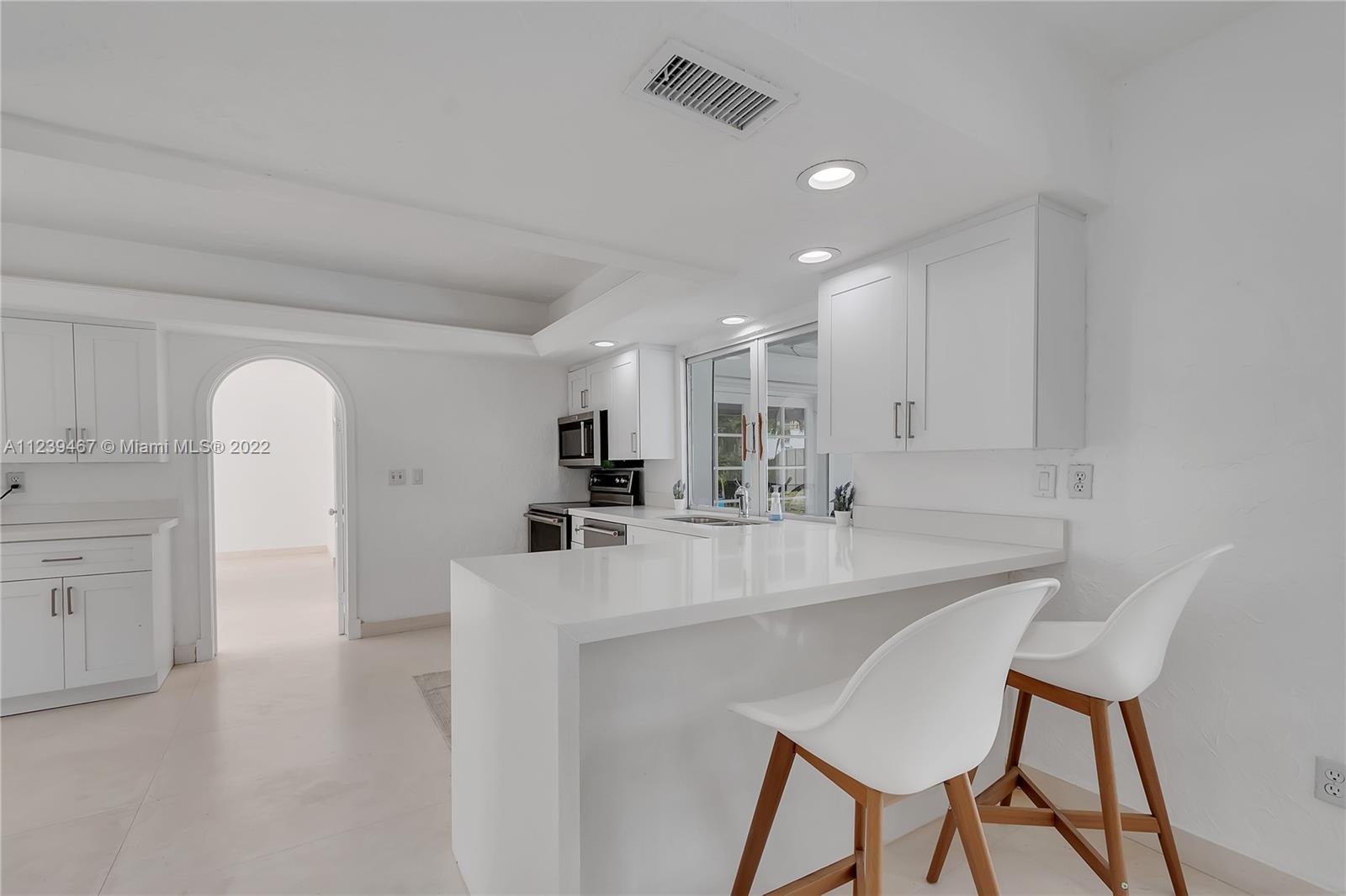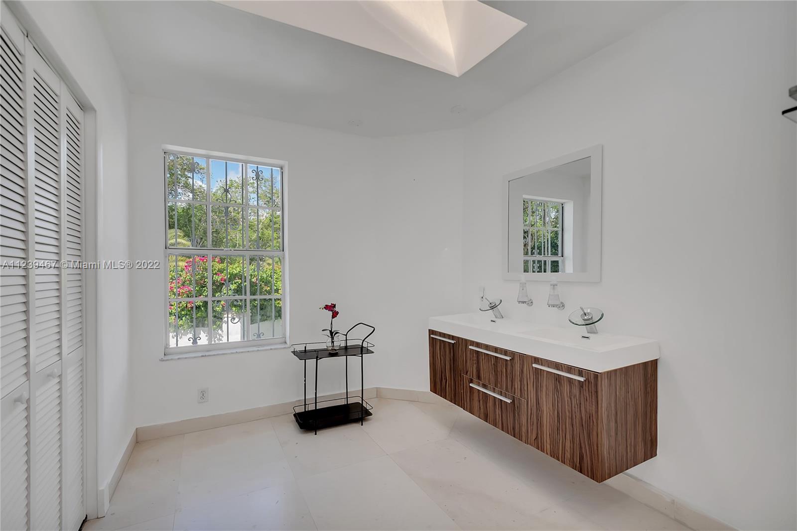Sleek lakefront home in Pinecrest by the Sea. Open living areas include formal living rm, family rm w/coral rock, 2-sided, wood-burning fireplace, timeless limestone floors & vaulted ceilings. Bright formal dining rm leads to the crisp white kitchen w/ quartz countertops, stainless steel appliances, pantry, breakfast nook & eat-in snack bar. Main home features 4 bdrms & 3 baths including the master suite w/ impressive walk-in closet. 2 bdrm/ 2 bath guest house w. kitchenette. Can easily accommodate visitors, extended family or live-in caregiver. Ample french doors lead to elevated covered patio w. brick detail overlooking the pool. Fenced backyard w/ serene private lake beyond. 2 gar spaces, circular drive w/ porte-cochere & oversized yard.