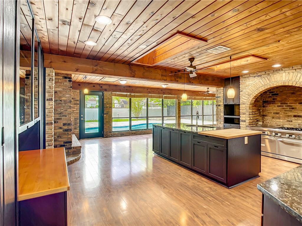 Charming and spacious 5 bedroom, 3 bathroom home perfect opportunity for a large family to make their own special touches, or for an investor to completely remodel. Wood ceilings, custom Brick walls throughout, travertine/stone accent walls. Open brick kitchen with commercial gas oven, flat-top grill/6 burner sauté station, wood cabinets, brick wine rack built into the wall of Florida room. Updated bathrooms, roof and hot water heater replaced in 2020. Completely fenced in corner lot, spacious backyard perfect for entertaining your guests complete with pool and a travertine deck.