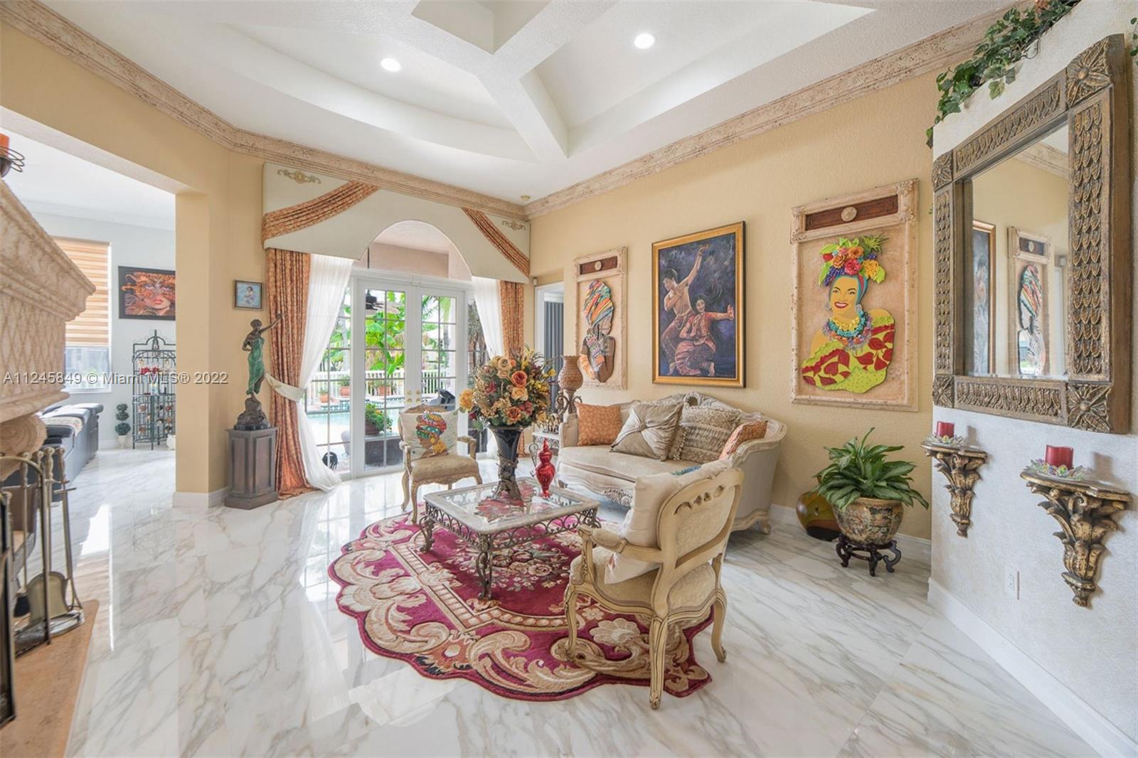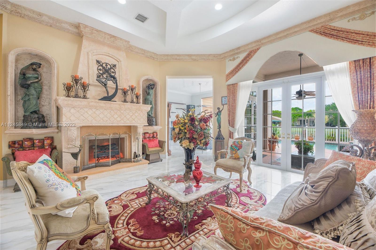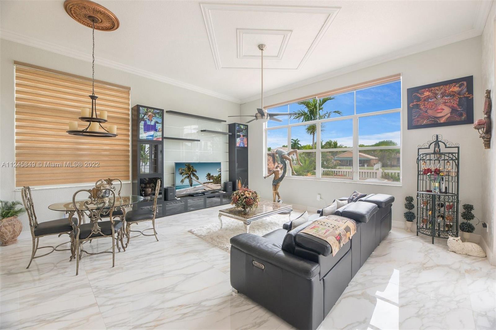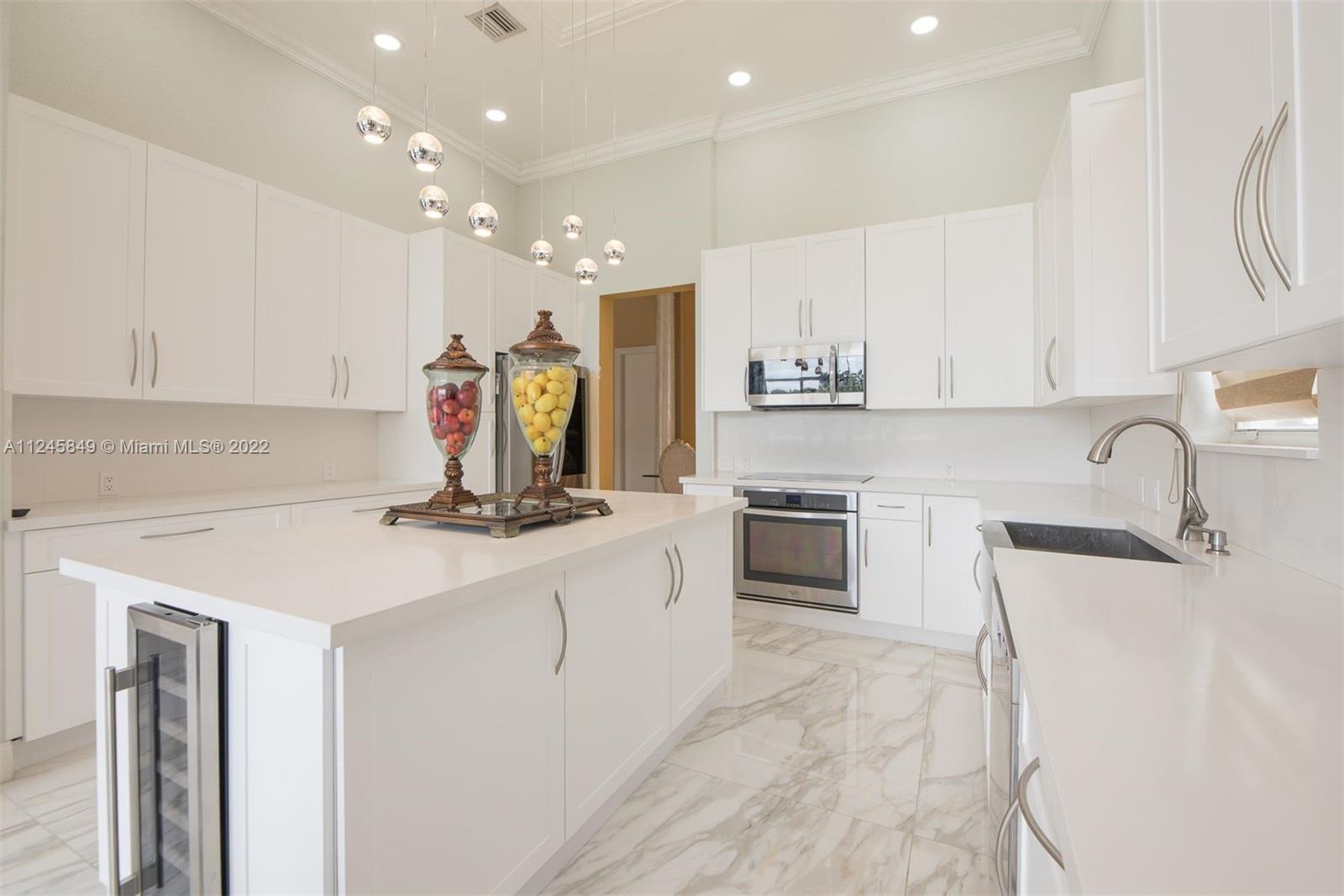 Breathtaking pool and lake view welcomes you upon entering the front door of this upgraded dream home ideal for entertaining, and located in resort style neighborhood. Many upgrades: New huge 4.5 X 4.5 Calacatta Gold Porcelain floors throughout common area. Built in stone mantle; Faux stone crown moldings; Brand new white Gourmet Kitchen w/new Quartz counter tops/back splash and large island. New stainless steel refrigerator, microwave, wine cooler, washer/dryer and water heater. Pool recently remarcited W/LED lighting installed, pool patio redone, built-in bar and grill. Clubhouse, newly renovated w/lagoon style pool, recreation room, party room, Gym, tennis courts, basketball courts and playgrounds. Excellent schools. This is a MUST SEE at Riviera Isles - Portofino!