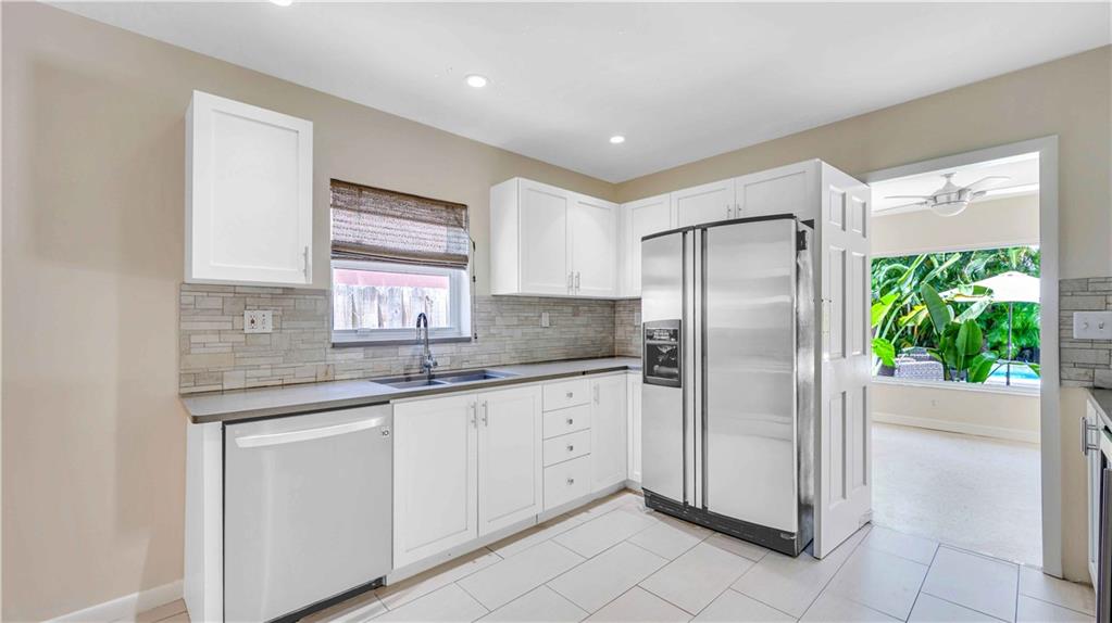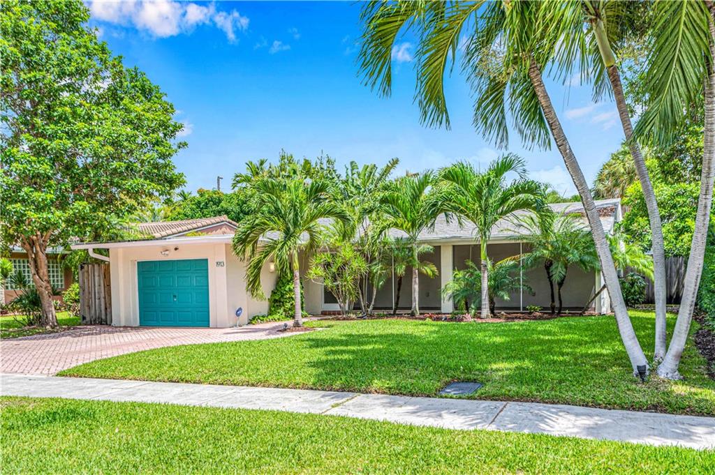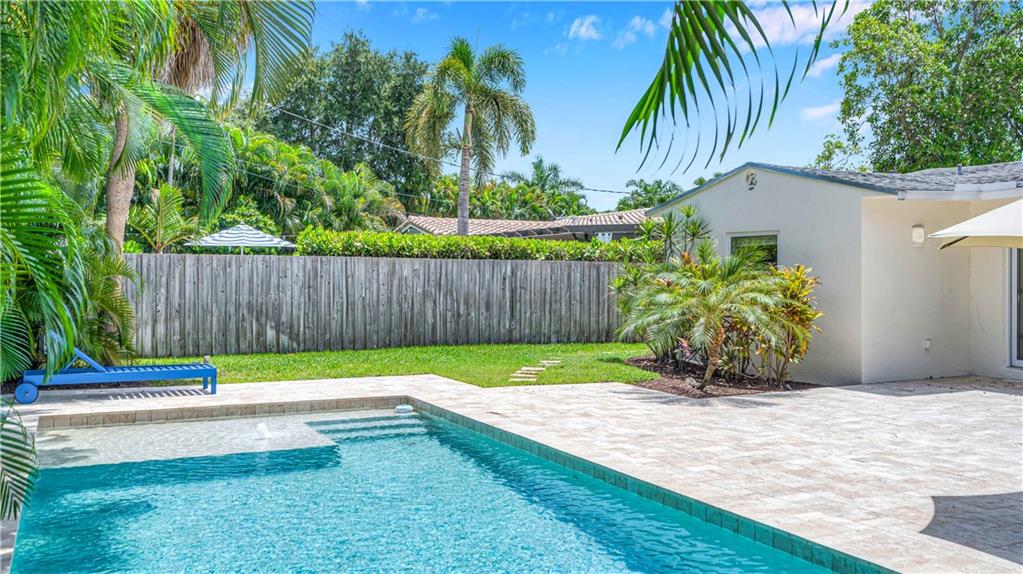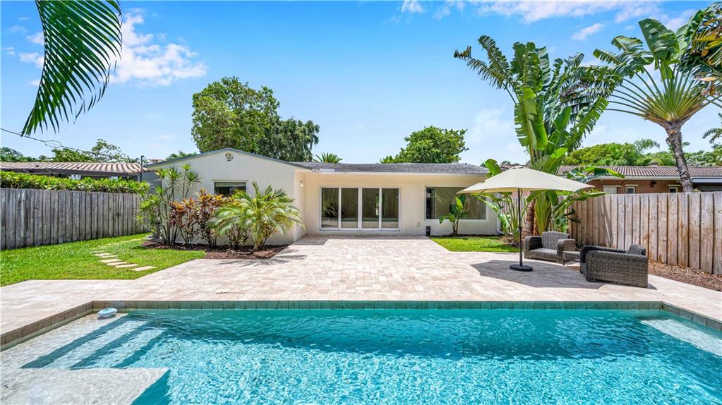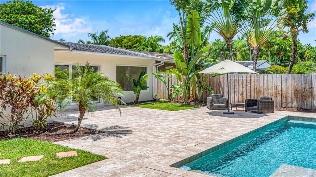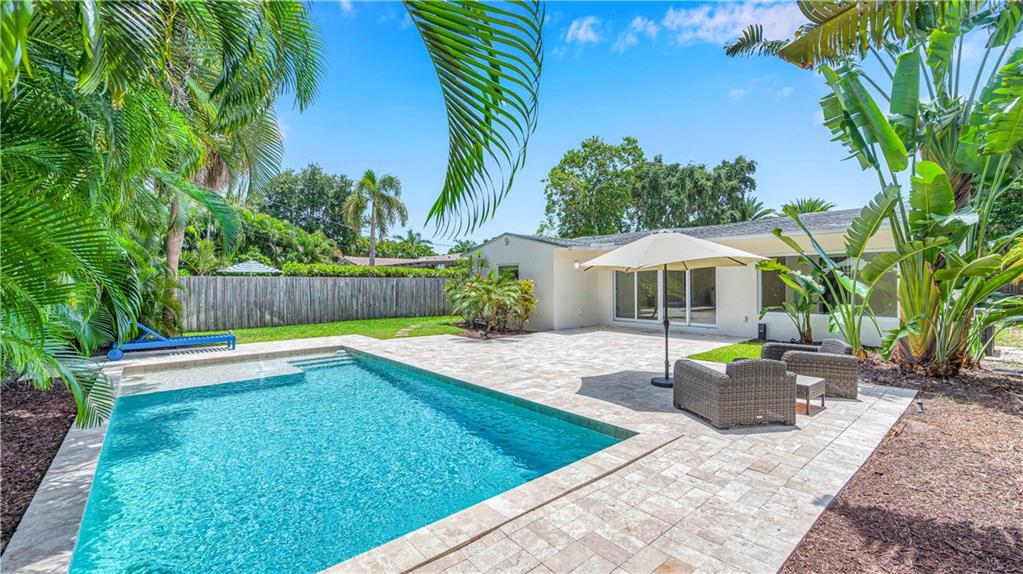 Bright and spacious home on a deep, private lot approximately a mile from the beach. Located in the Highlands section of Victoria Park, this cool mid century has sleek terrazzo floors, generously sized rooms, updated kitchen and baths, a home office, impact rated windows and doors. A wide driveway leads to a large, screened entry porch. An L-shaped living dining area opens through wide sliding glass to the pool and large surrounding yard Adjacent is a modern, eat-in kitchen with quartz tops fully equipped & including a wine chiller. Off the kitchen is a full laundry with wash sink leading to the air conditioned office cleverly constructed within the garage area allowing plenty of remaining storage area. The neighborhood is lined with sidewalks. Parks, stores and restaurants are all nearby.
