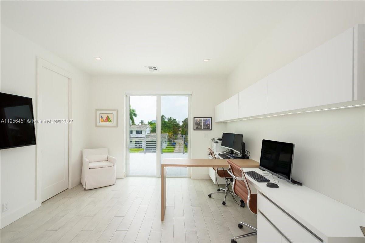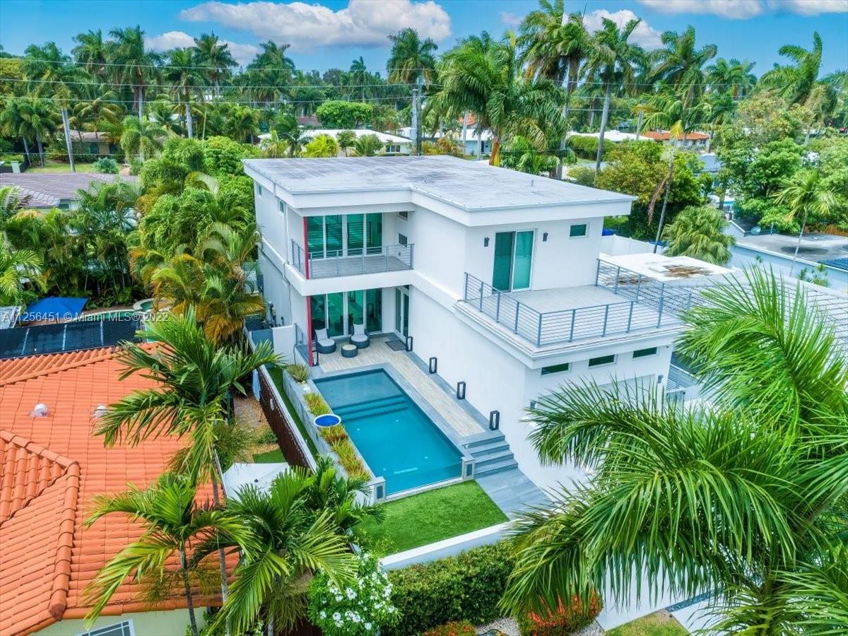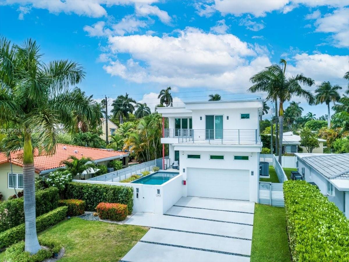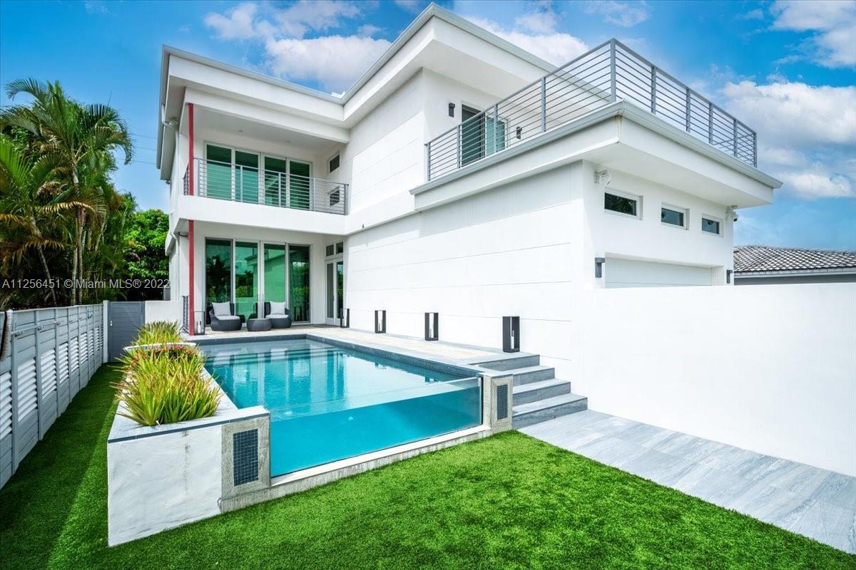 This exceptional 2018 ultra modern two story house features 3BD/3.5BA. Large bedrooms feature walk in closets & en suite bathrooms. Primary bedroom features sitting area, his/hers closets a balcony overlooking the infinity glass edge gas heated swimming pool and fire pit. Chef style kitchen, appliances Subzero and Thermador with countertops in quartz. An upstairs & downstairs laundry, custom wood & glass staircase. Porcelain Italian flooring throughout and a two car garage. Backyard includes covered patio, summer kitchen with gas BBQ. Rooftop balcony over the garage. Secured gate w/access control & full perimeter surveillance cameras and alarm system.10 foot ceilings & 8 foot interior doors throughout.