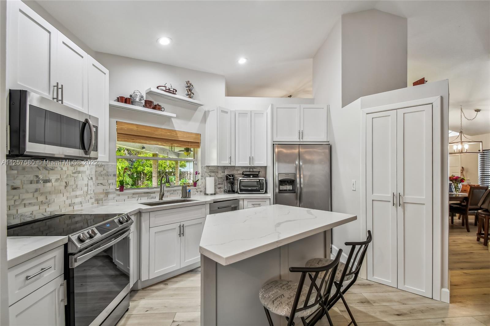 Lovely 3 bedrooms, 2 bath, ONE STORY home, situated in the Heart of Davie/595 in the well kept ARBORETUM COMMUNITY. This home has been beautiful renovated with a very charming kitchen with quartz countertop with brand new island, new S.S. appliances microwave, range, dishwasher, washer and dryer. Second bathroom was upgraded with new sink vanity, shower, tile floor, toilet and more. Master bedroom walking closet installed Elfa closet. As soon as you walk into this home you will notice the high quality 5 mm vinyl floor throughout the common areas of the house, volume ceilings, fresh paint and natural lighting! Enjoy the cover private backyard totally fenced . The property offer According Shutter, LED motion activated flood lights around the house. ROOF WAS DONE 7 YEARS. LOW HOA FEES