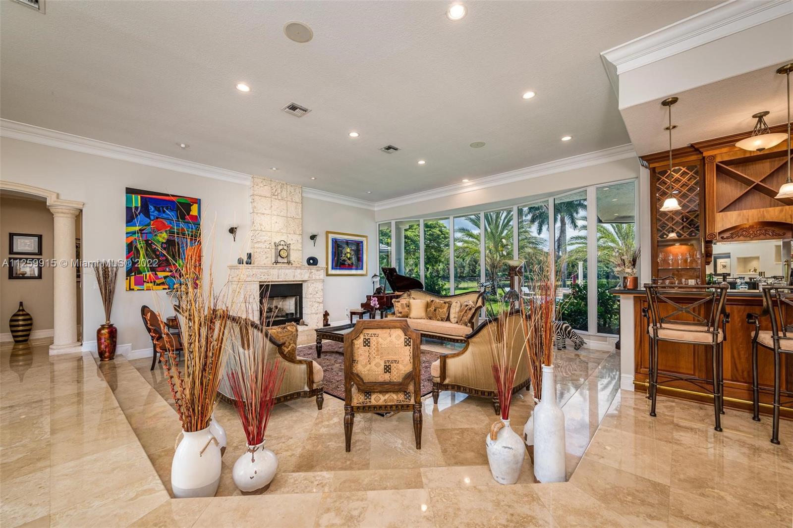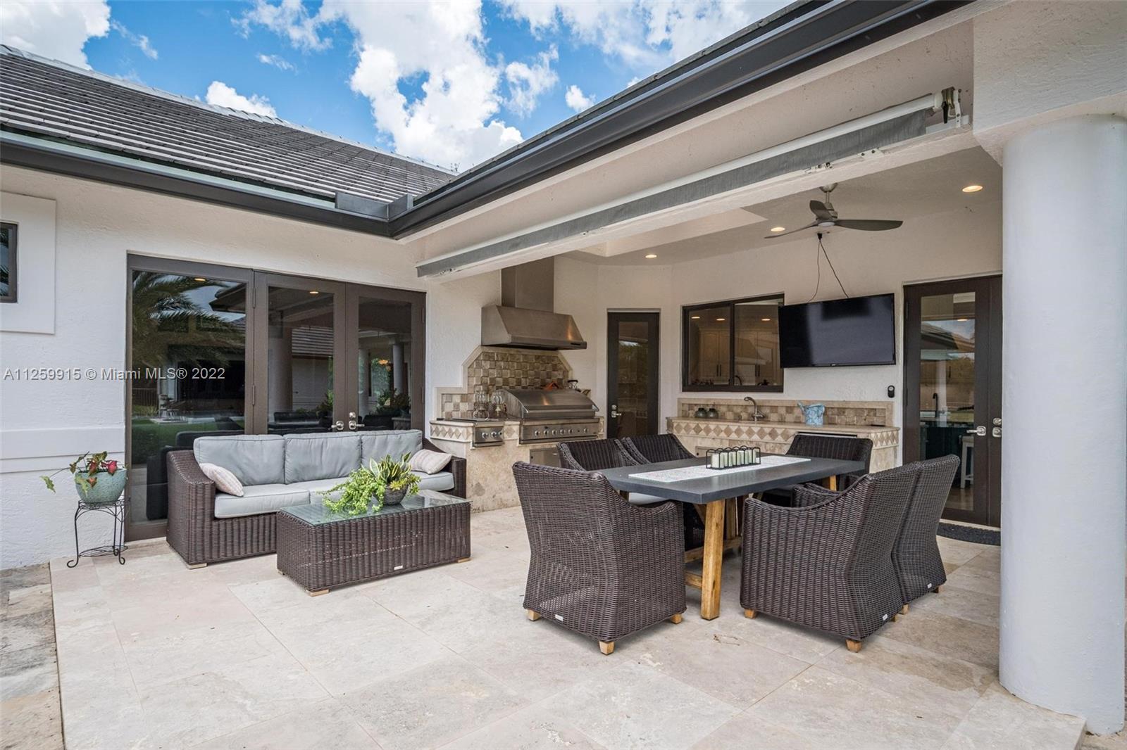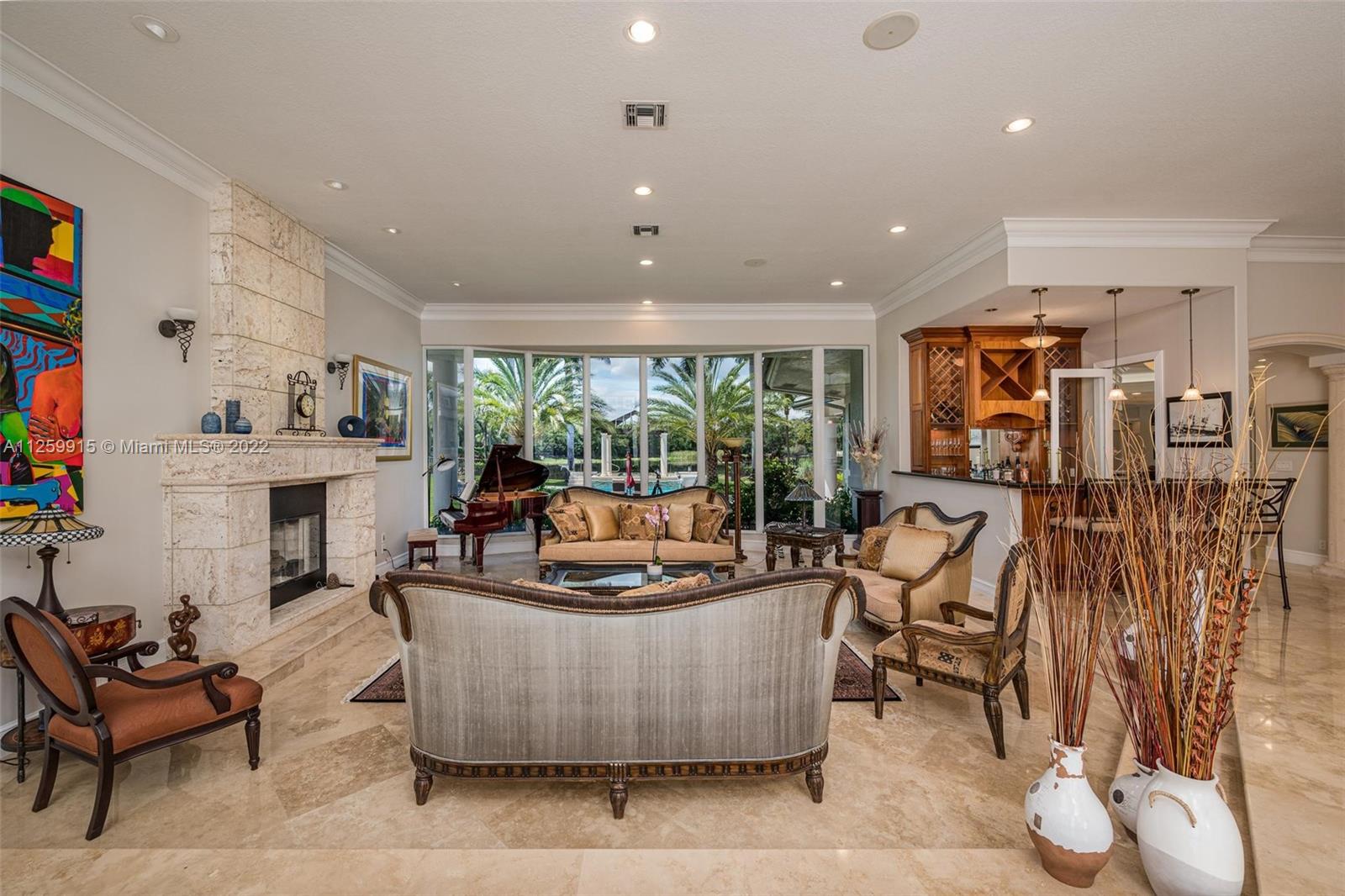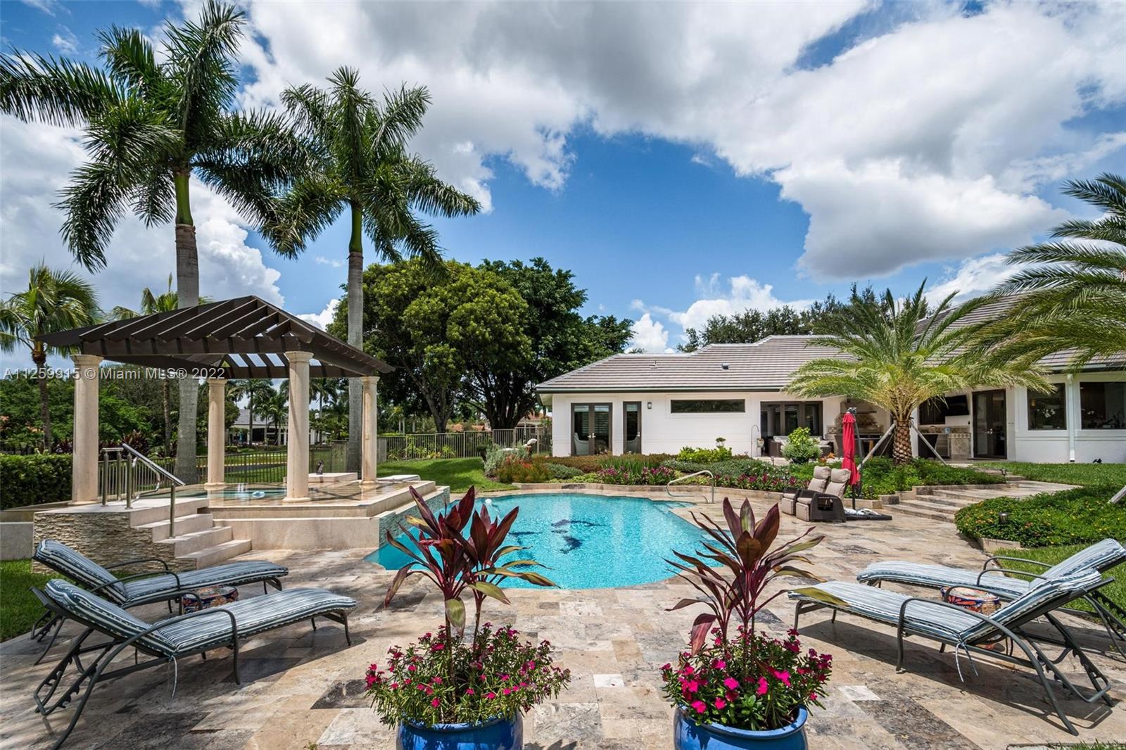 Highly renovated estate on a private 58,000 SF cul-de-sac lot w/ endless water views in prestigious Windmill Ranch Estates. New travertine circular driveway, 4 car garage & porte cochere welcomes you! Smart home w/ brand new roof, impact glass windows & doors, marble floors & custom millwork throughout. 5 bedrooms, 6 1/2 baths, master suite w/ large walk-in closets, master bath w/ spa & sauna. New chef's kitchen w/ top of the line Viking appliances - Viking 60" gas range, Sub Zero refrigerator. Formal living room w/ wet bar, fireplace, volume ceilings & picture window displaying endless water & sunset views. Resort style backyard w/ heated pool & spa, extensive new travertine pavers & summer kitchen. Sold fully furnished for list price excluding grandfather clock, piano, 2 area rugs.