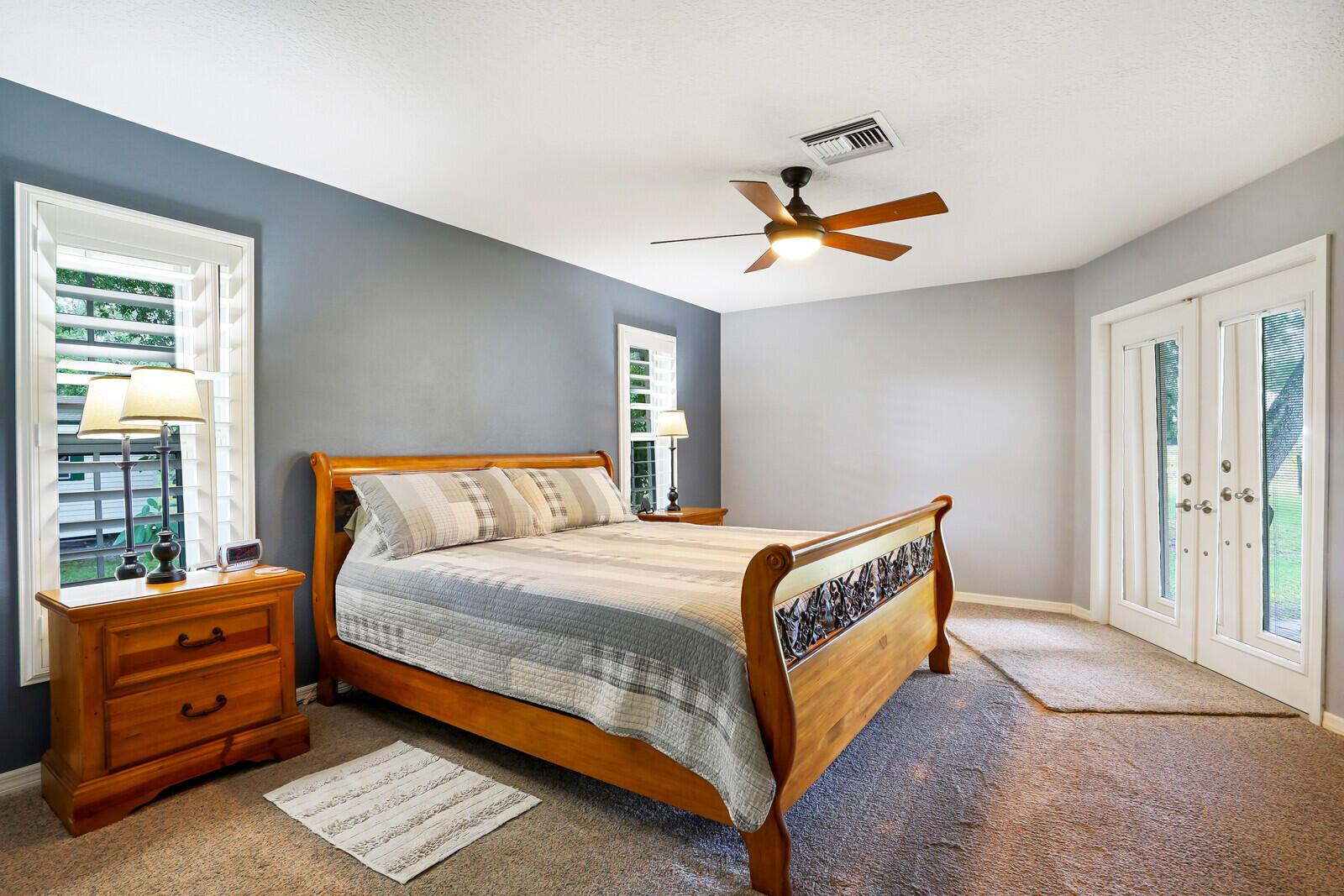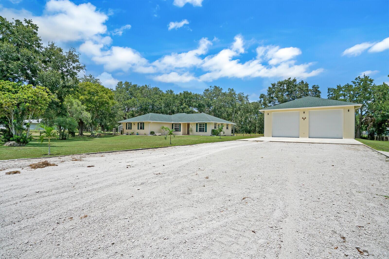 Residence is a country oasis on approx. one & one-half acres (built 1997), on a dead end newly paved street, Canal on side & rear of home. In addition to 2-car attached garage, large, detached garage (40'x56') able to house 2 recreational vehicles (walls 16' high) (front doors 14'x14') Built approx. 2019. If desired, 480 approx. sq. ft. can be constructed into a guest home. Kitchen has been upgraded with spectacular granite & cabinets. Breakfast bar can accommodate 4. Bay window area in kitchen has space for small cozy breakfast area. French doors across rear of kitchen & living area. Split bedroom plan. Master BR has small area for setting; master bath enjoys separate tub and shower. Plantation shutters enhance all windows. Attractive washer/dryer in laundry room. REVERSE OSMOSIS SYSTEM
