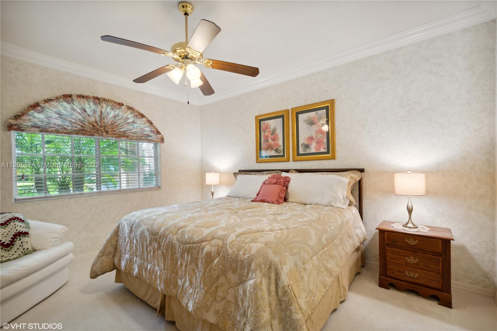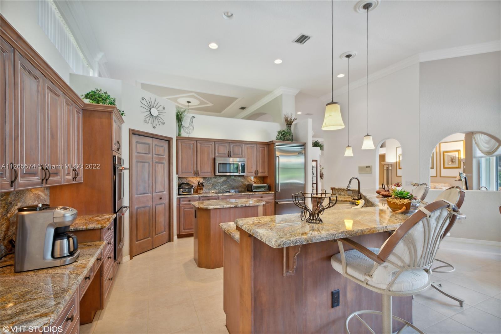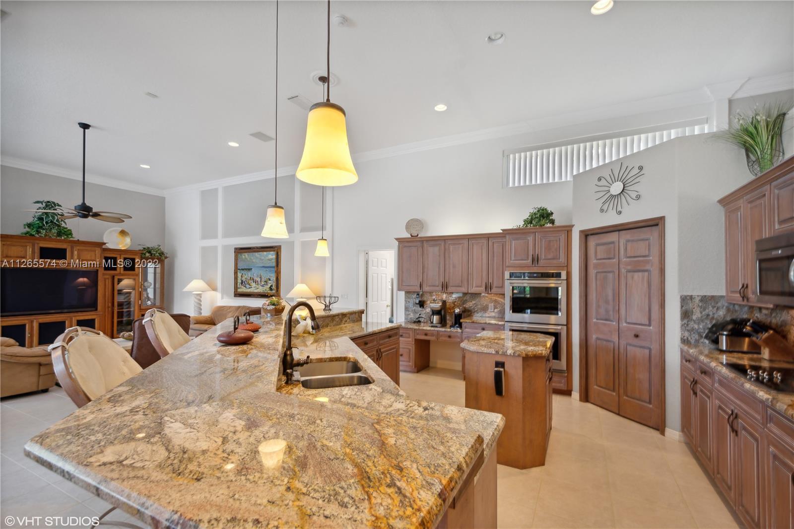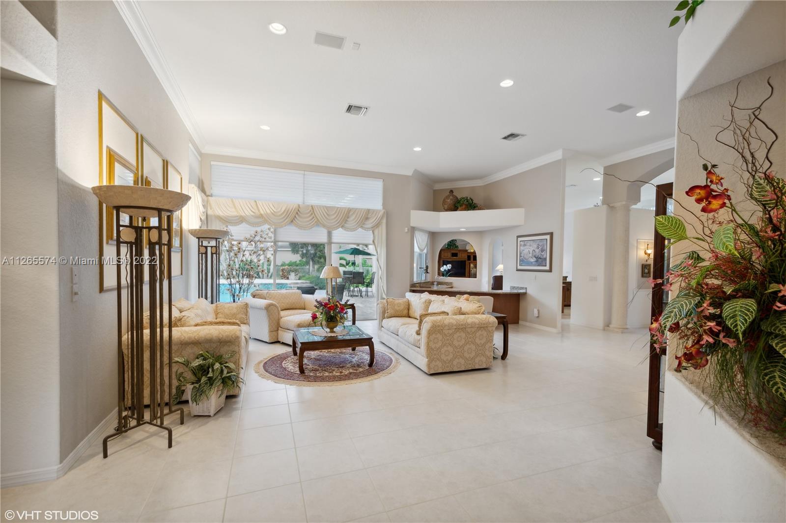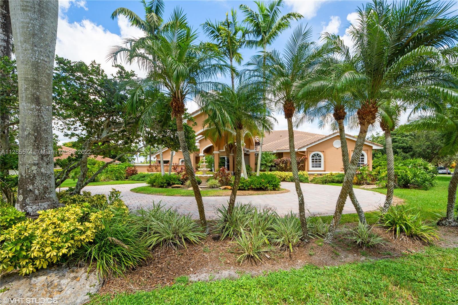 The dream location represents the epitome of opulent living. The estate sits on an oversized lot in a 24-hour man-gated community. The incredible floor plan of this home is open, functional and includes a master suite with a grand hallway, make-up area, and a regal closet; a children's and guests' wing with three spacious rooms, an office with a closet, chef’s kitchen with pantry, seated bar area, surround system, pool, full home generator with 1,000 - gallon gas tank, security cameras, impact windows - kitchen | dining area and accordion shutters. The enormous parking spaces, include a 3-car garage, two separate parking areas, a front porte-cochère, a circular driveway with a water feature and side entrance paved parking for the vehicle fanatics.