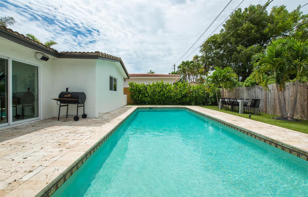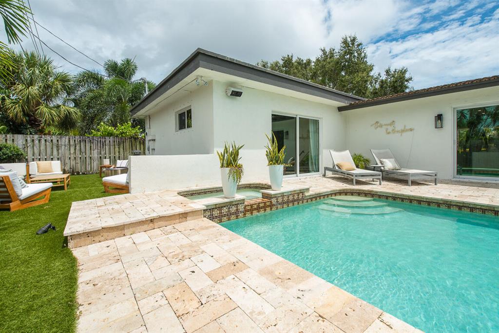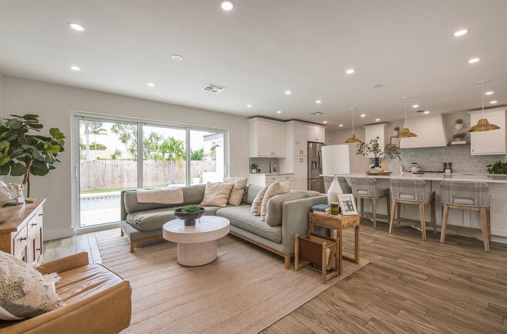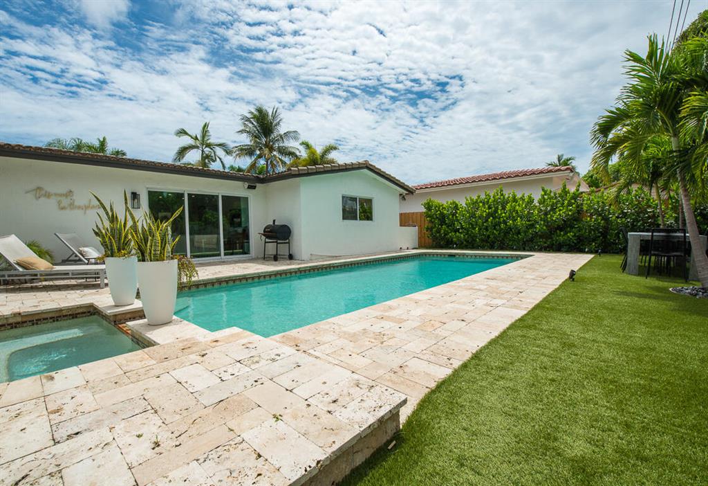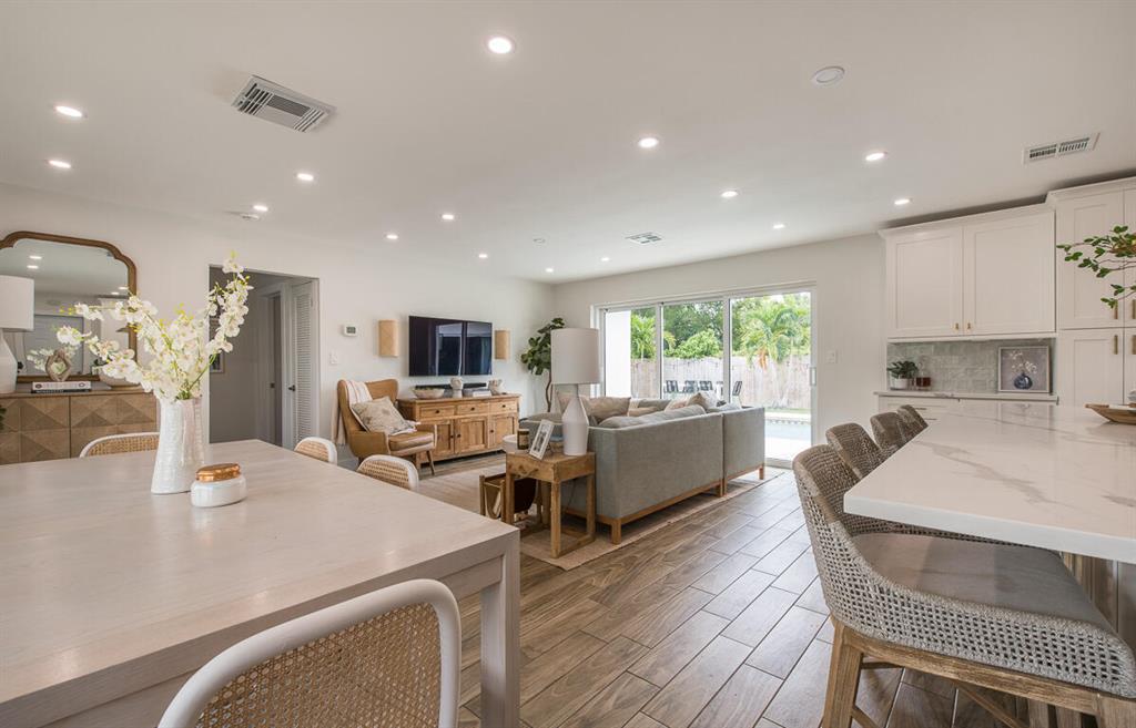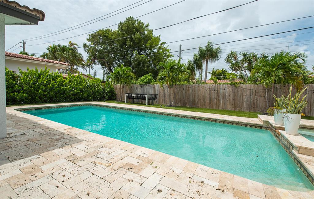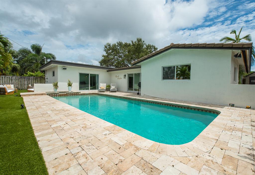 Come fall in love with this luxurious pool home in the highly sought-after Fort Lauderdale community of Coral Ridge! Located just minutes from the beach, restaurants, shopping, and so much more, this fully-renovated gem features two master suites, wood-look porcelain tile floors throughout, and a breathtaking kitchen that boasts an expansive island with plenty of storage, quartz countertops, brand new stainless-steel appliances, a custom oven hood, a stylish tile backsplash, and soft-close shaker cabinets. The three full bathrooms were tastefully remodeled with frameless glass shower doors and mosaic tile shower floors. The private fenced-in turf backyard is truly a slice of paradise, featuring an oversized pool, spa, and a travertine tile deck. This is a must-see!