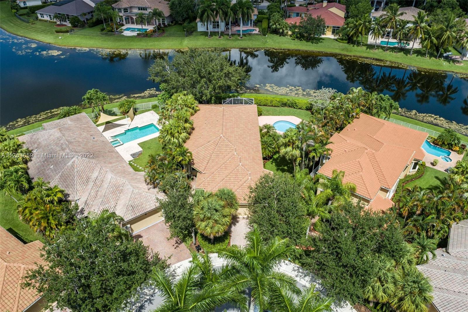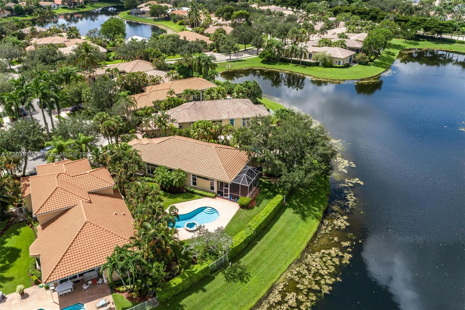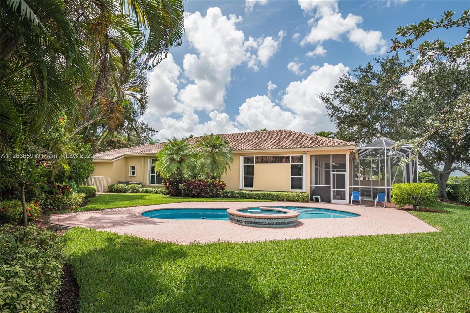 This spacious 3 bed/3 bath waterfront home in Bay Isle - Weston Hills CC has it all. This 2,652sf home is located on a 14,241 cul de sac lot. NEW ROOF. NEW AC. Pool surface just refinished. Open floor plan with 14' ceilings. Open kitchen w/ new appliances and granite countertops. Plantation shutters. LED lighting. Enjoy incredible sunset views from your screened in patio with oversized lot providing the ultimate privacy. Accordian shutters throughout. 2-car garage. Fully maintained community including lawn/landscaping, fertilization, pressure cleaning and painting.