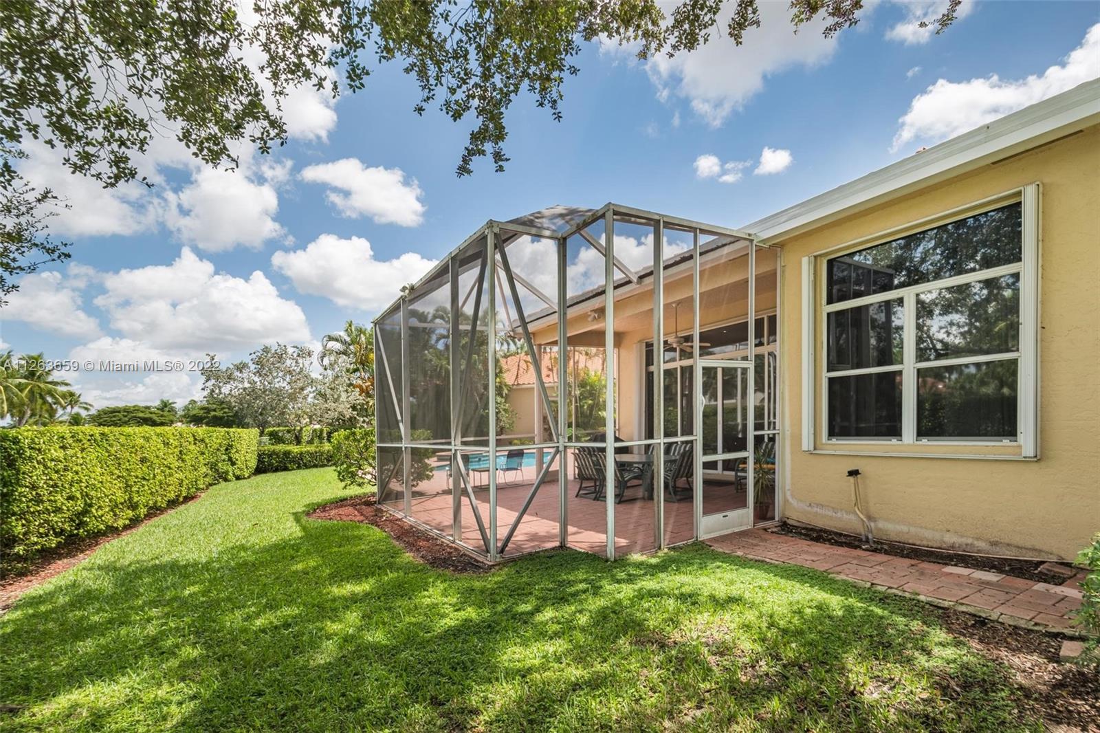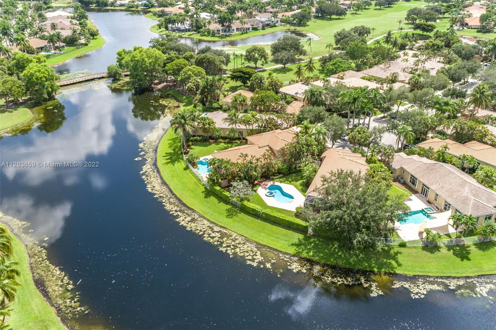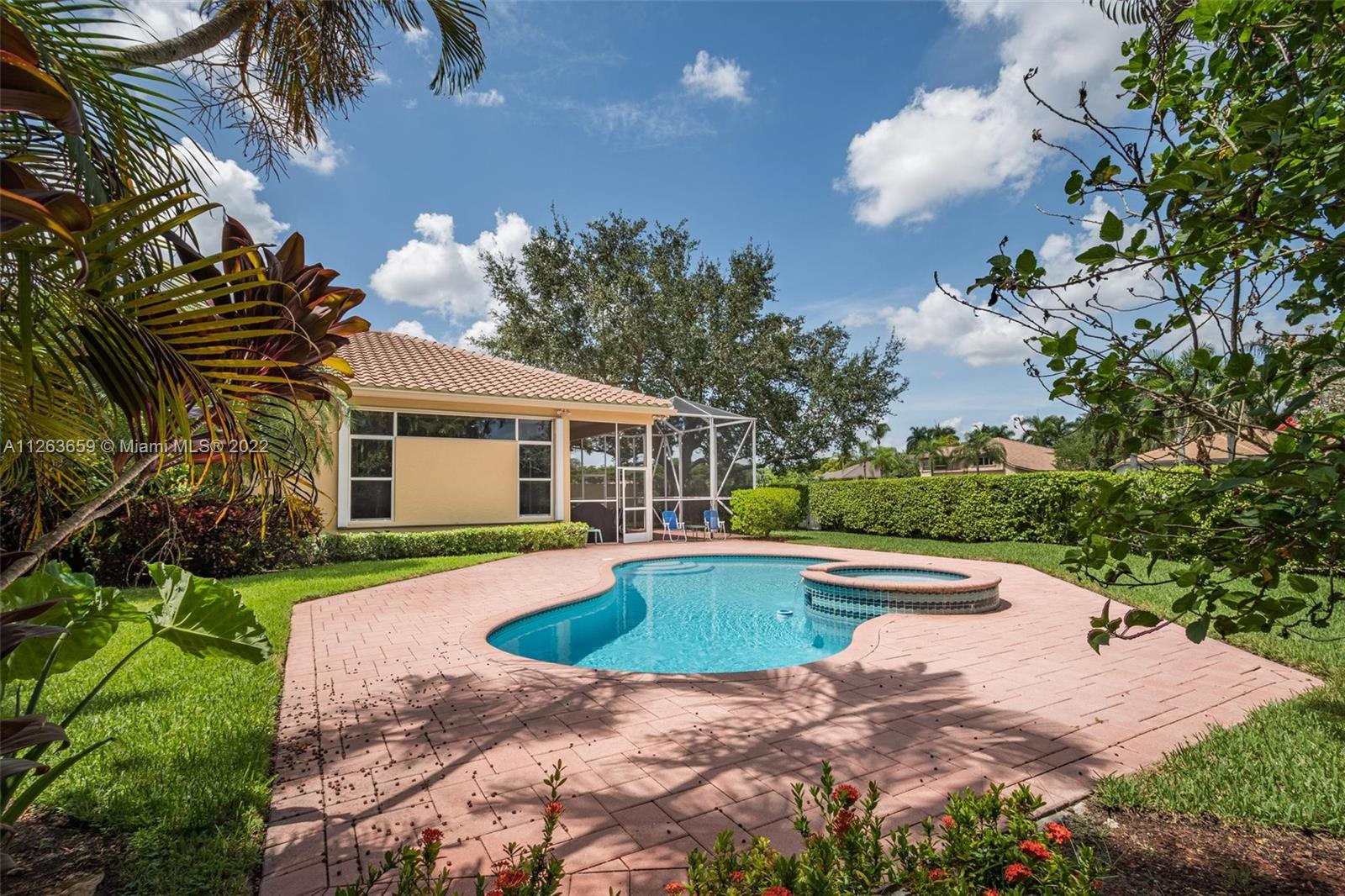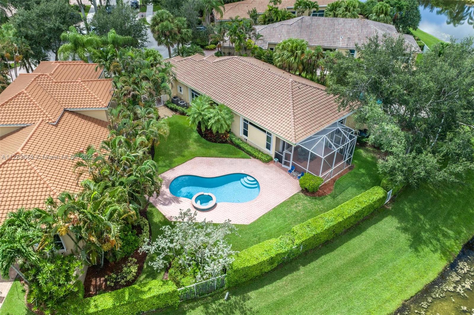 This spacious 3 bed/3 bath waterfront home in Bay Isle - Weston Hills CC has it all. This 2,652sf home is located on a 14,241 cul de sac lot. NEW ROOF. NEW AC. Pool surface just refinished. Open floor plan with 14' ceilings. Open kitchen w/ new appliances and granite countertops. Plantation shutters. LED lighting. Enjoy incredible sunset views from your screened in patio with oversized lot providing the ultimate privacy. Accordian shutters throughout. 2-car garage. Fully maintained community including lawn/landscaping, fertilization, pressure cleaning and painting.