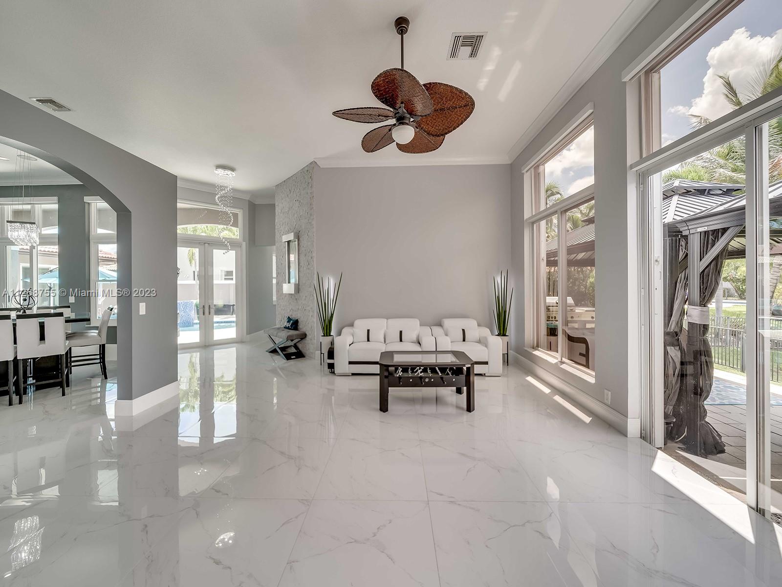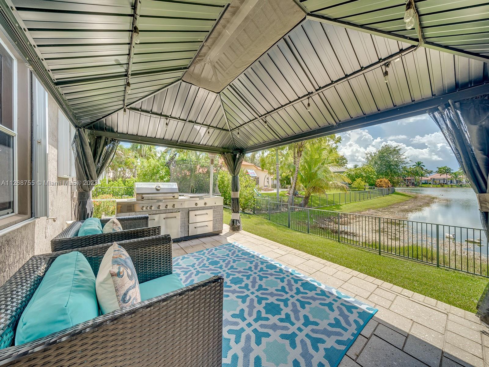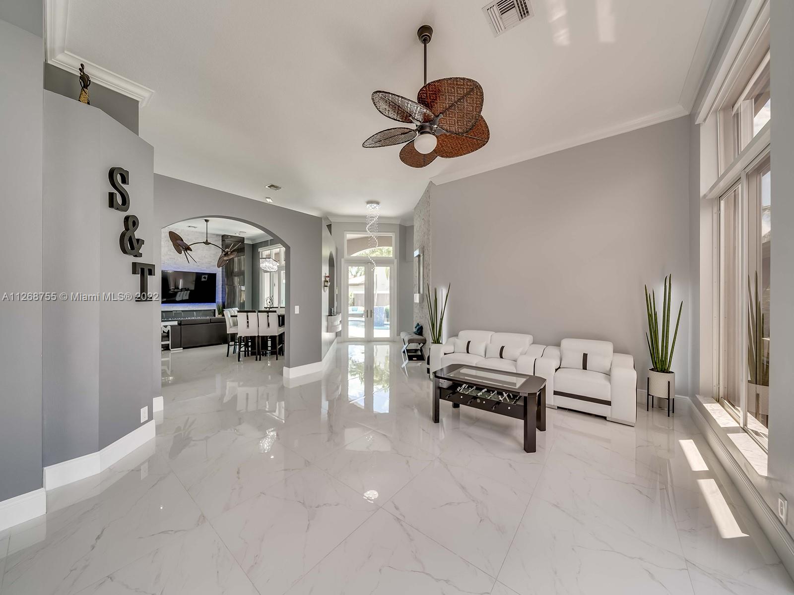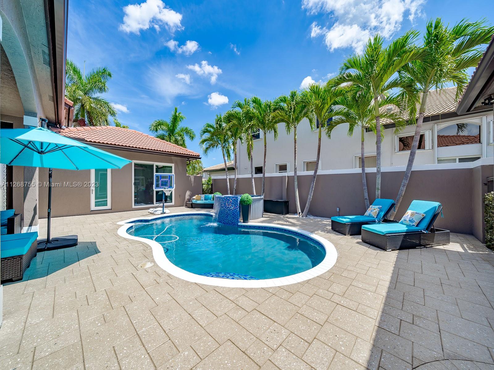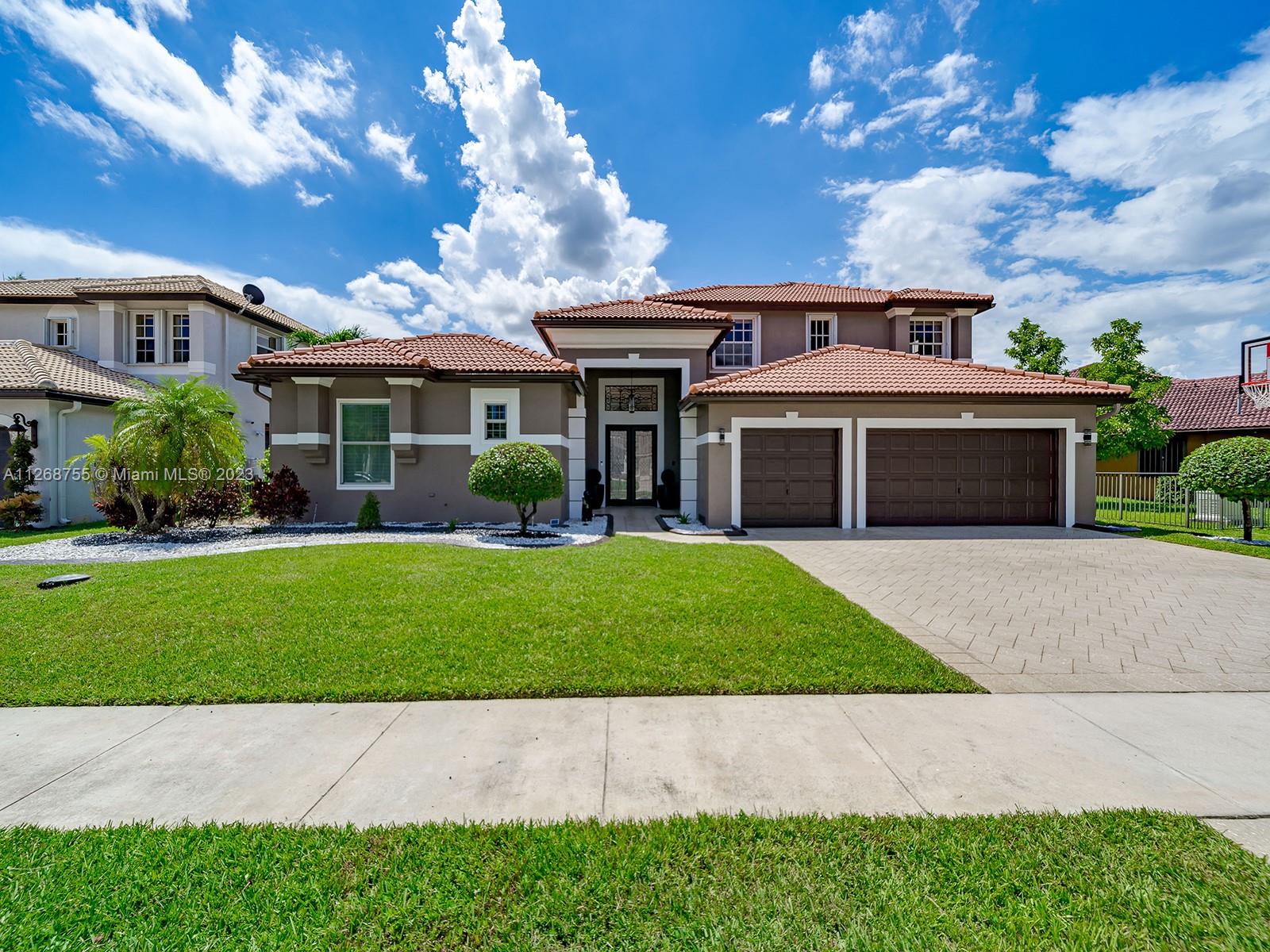 Located in the beautiful community of Sunset Lakes this luxurious, fully renovated, lake front home is move-in- ready. This home features a brand new kitchen with state-of-the-art appliances including built in coffee machine, smart fridge with built in tablet, wine cooler. Family room has a custom built-in TV wall unit with wooden cabinetry and an electric fire place with LED lighting. This home boasts a custom theater room great for watching movies and gaming. Beautiful tile flooring throughout the 1st floor and engineered wood flooring on the 2nd floor. Custom staircase, electric window treatments, entry niche with waterfall, built-in closets in every room. Enjoy a heated pool and gazebo. This sought after courtyard model is also known as the Victoria model which includes a guest house.
