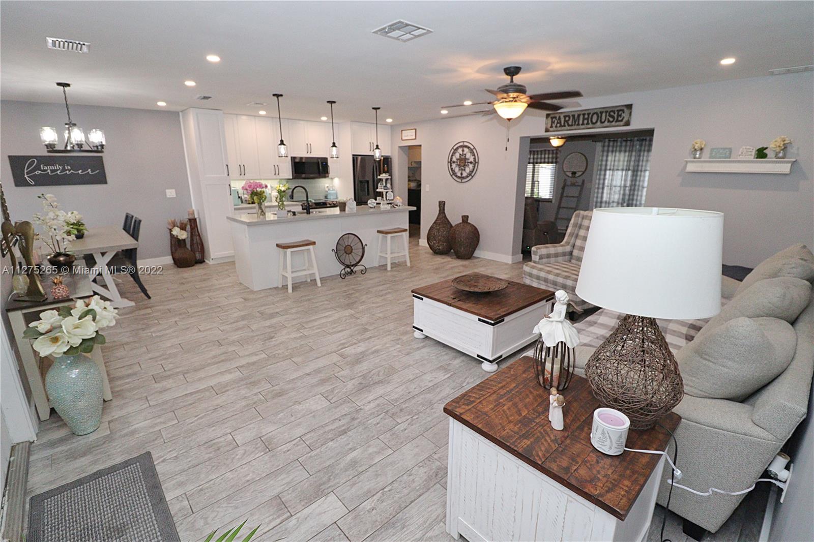 Sunswept Best Buy, Highly upgraded home with an open floor plan, Garage was converted by the former owner to an In-Law Quarters or fourth bedroom with a separate entrance, Remodeled Panda designed kitchen, Shaker cabinets, Quartz countertops, Samsung stainless steel appliances, Impact windows (Except French doors), Updated wood like tile floors throughout, Texture removed from living room and kitchen ceilings for a smooth finish, Two of the three bathrooms have been remodeled, Fenced yard, Stamped concrete driveway, Exterior just repainted, Storage shed, Avocado tree