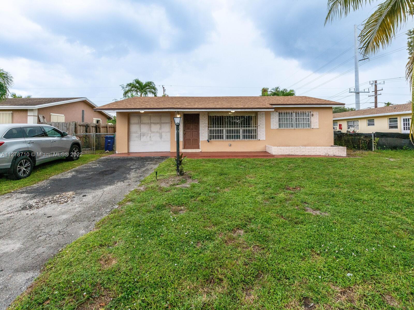Add your own touches and finishes to this cozy 2 bed, 1 bath Single Family Home with a 1 car garage. New roof installed 2021. Very close to Hard Rock Stadium, Hard Rock Hotel and Casino, 441, i95, and the Florida Turnpike. Plenty of room for a pool or a large backyard entertaining area. Covered rear patio perfect for grilling or relaxing. Coconut tree in the front yard.